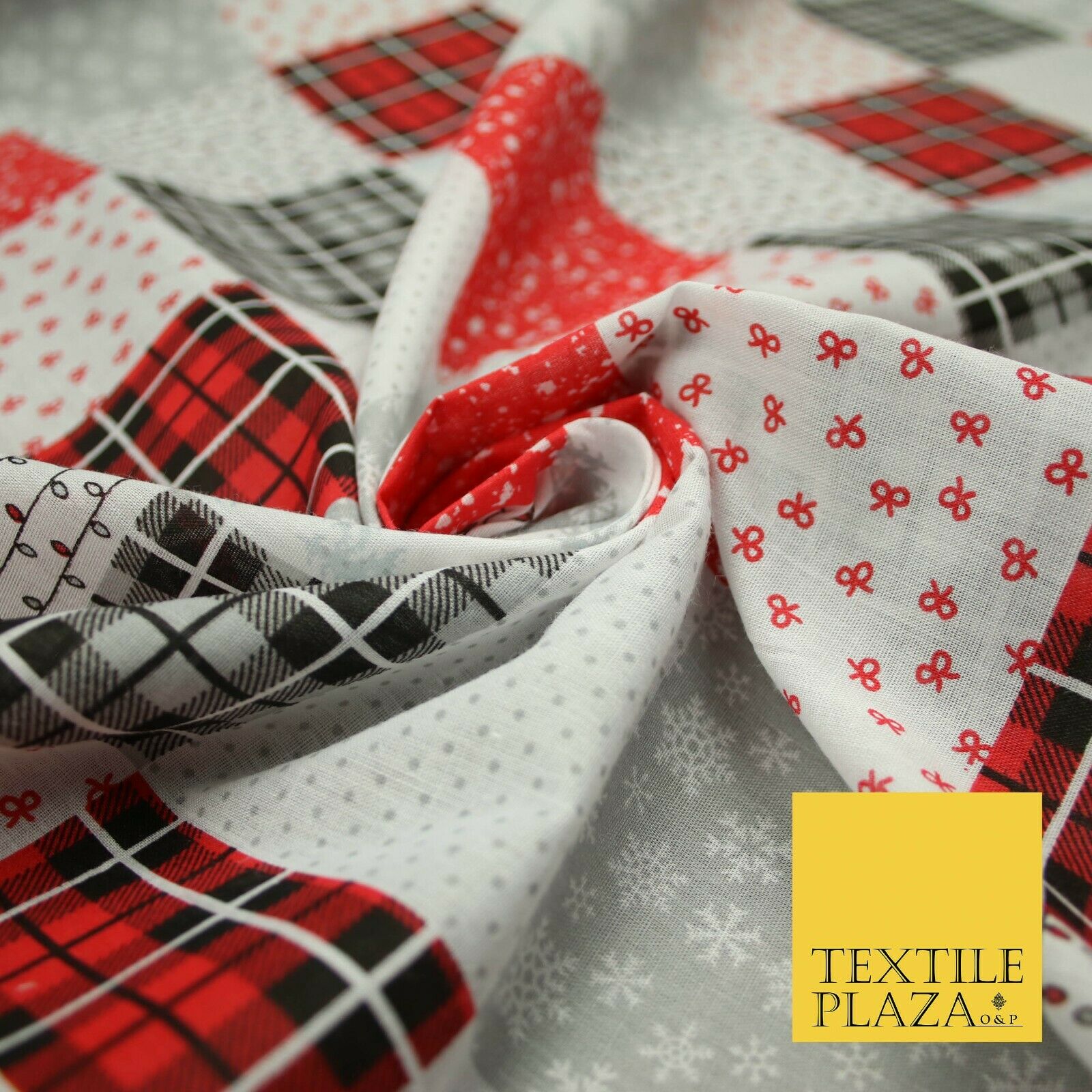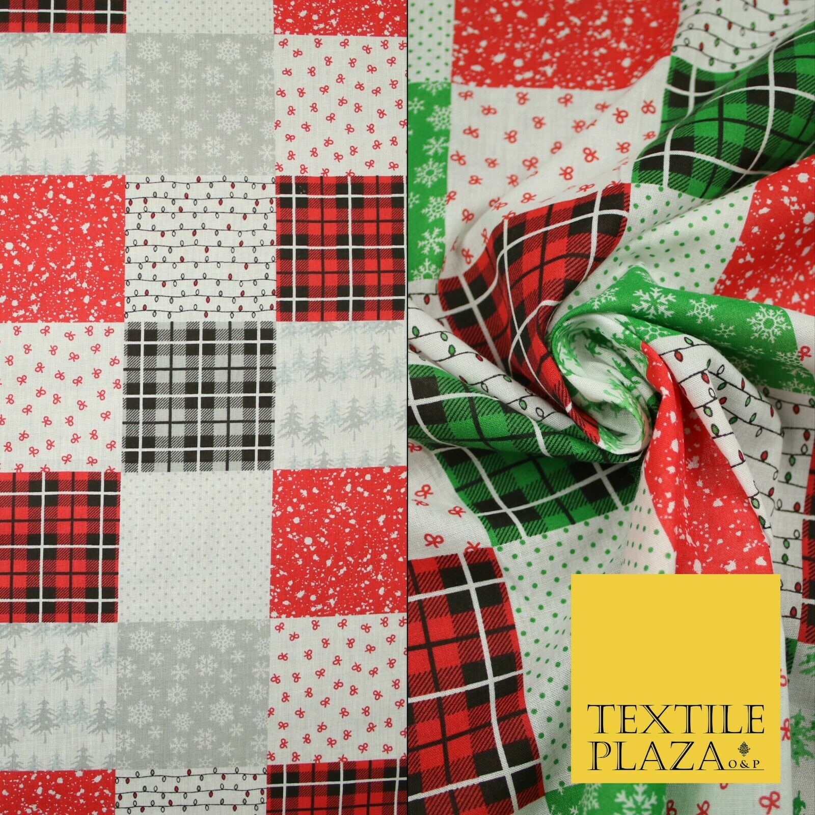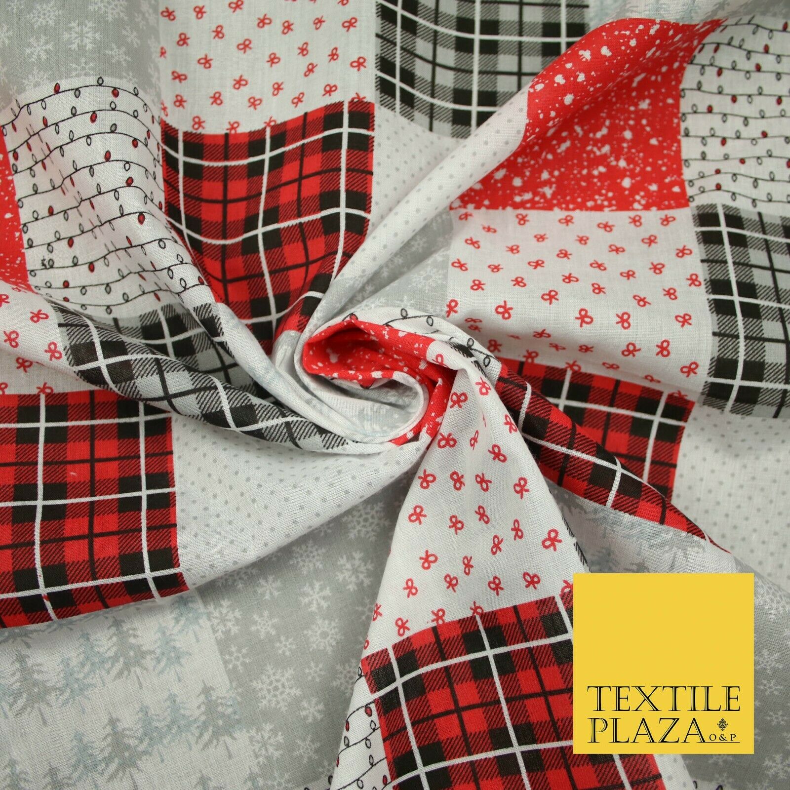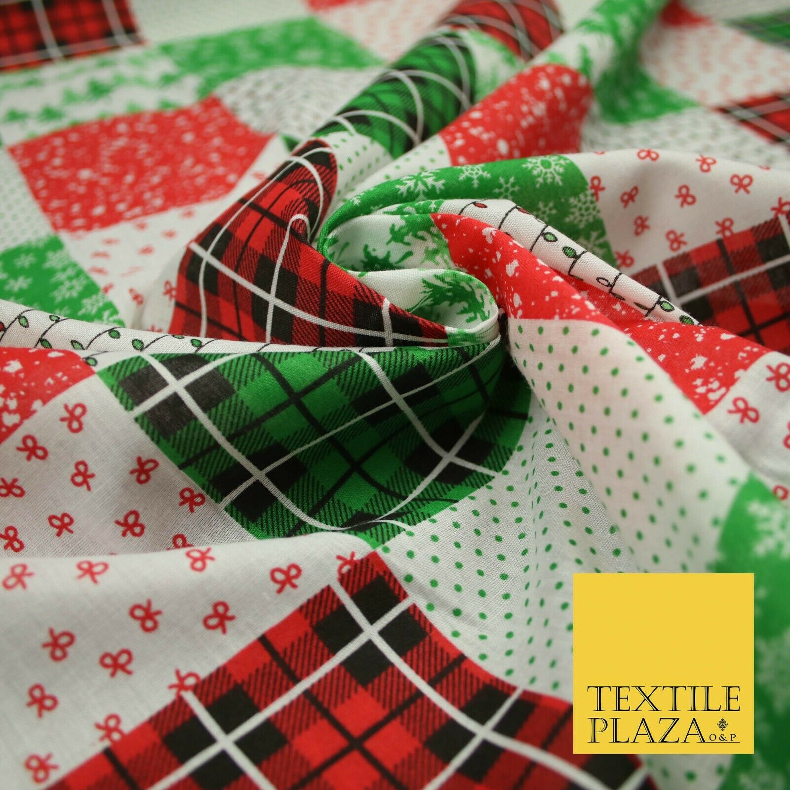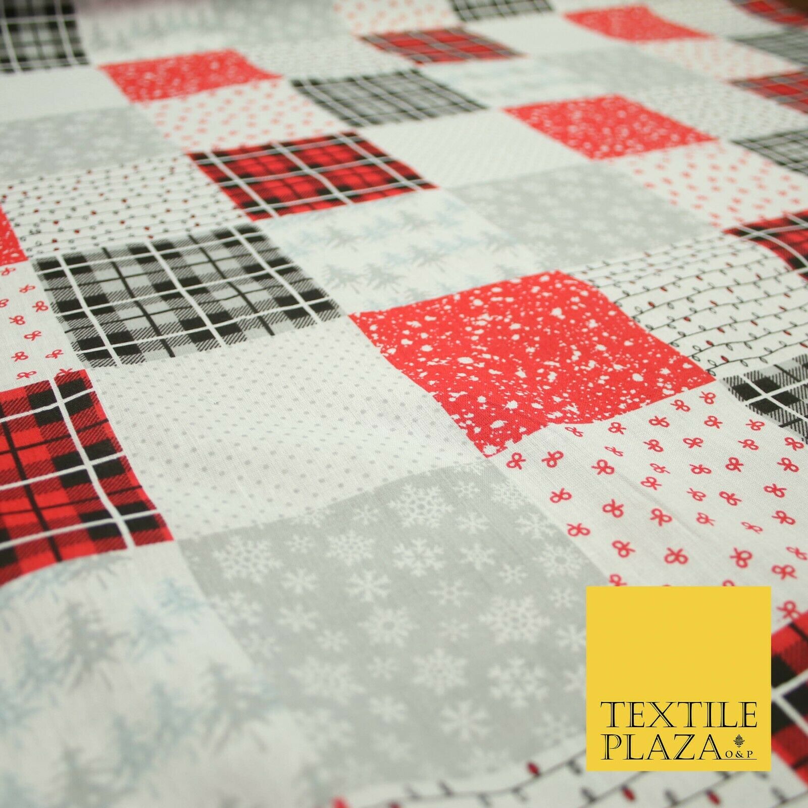 Festive Patchwork Christmas Trees Bows Snowflake Tartan Polycotton Fabric 44"