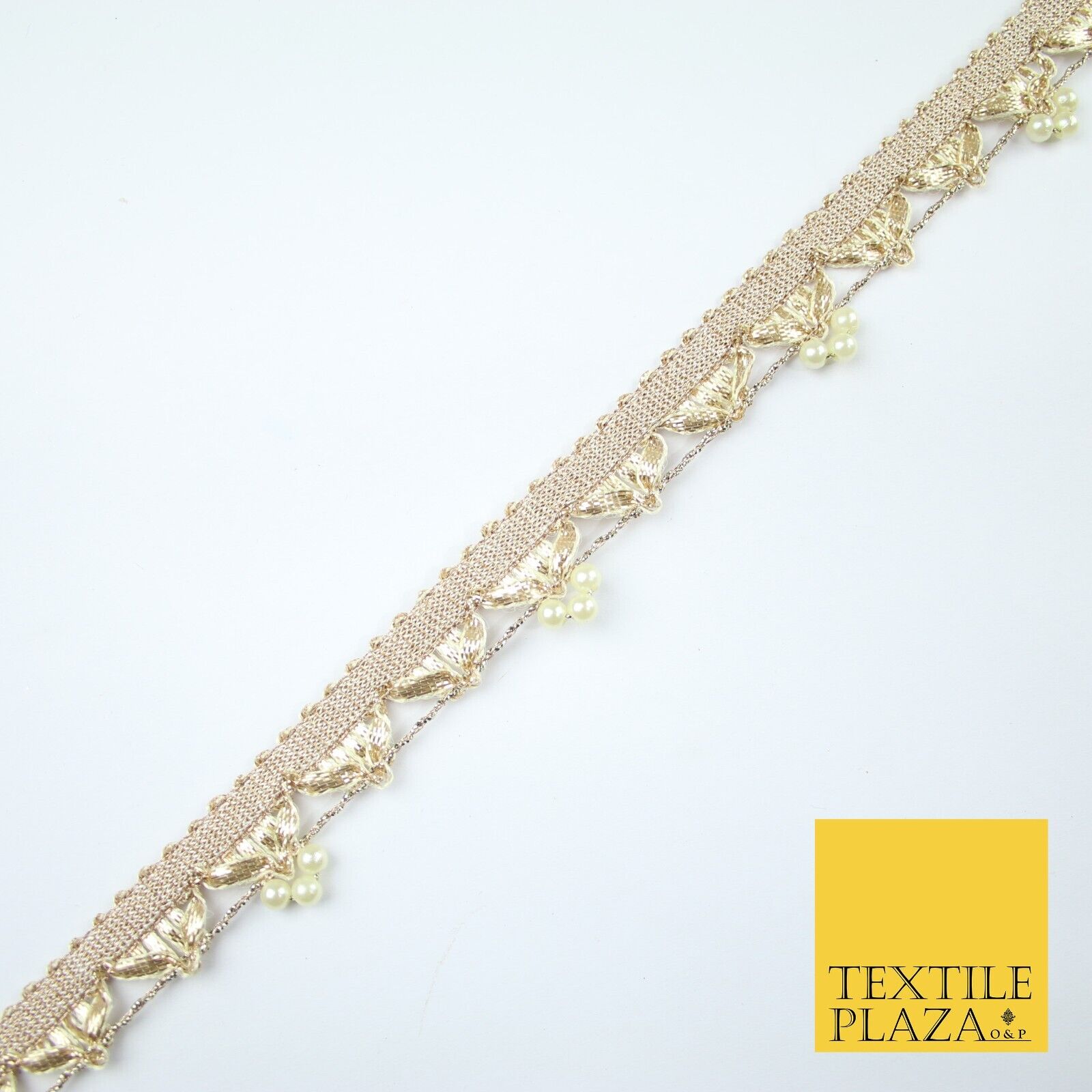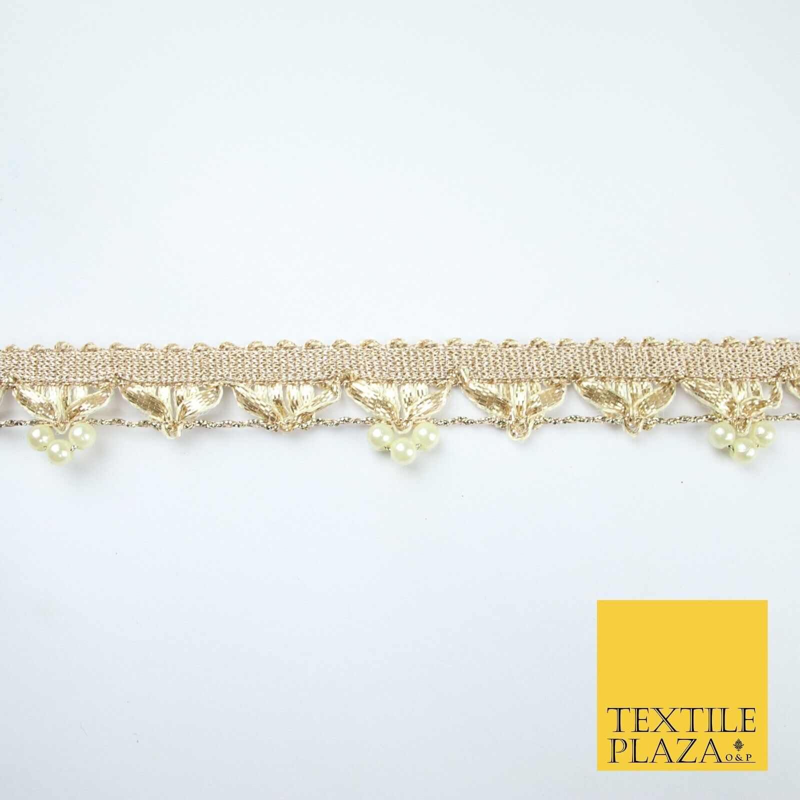 Gold Gota Patti Pearl Trio Clusters Ribbon Trim Border Lace - 2.5cm Wide - X606