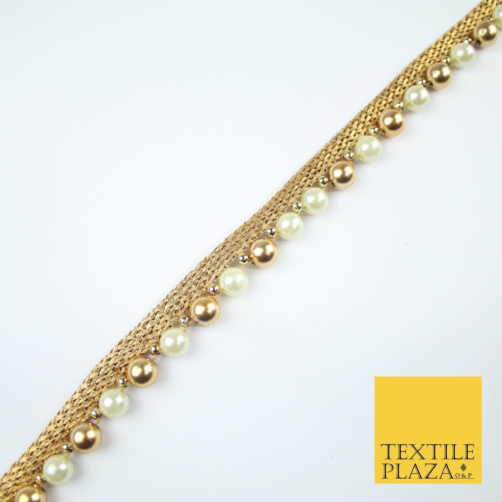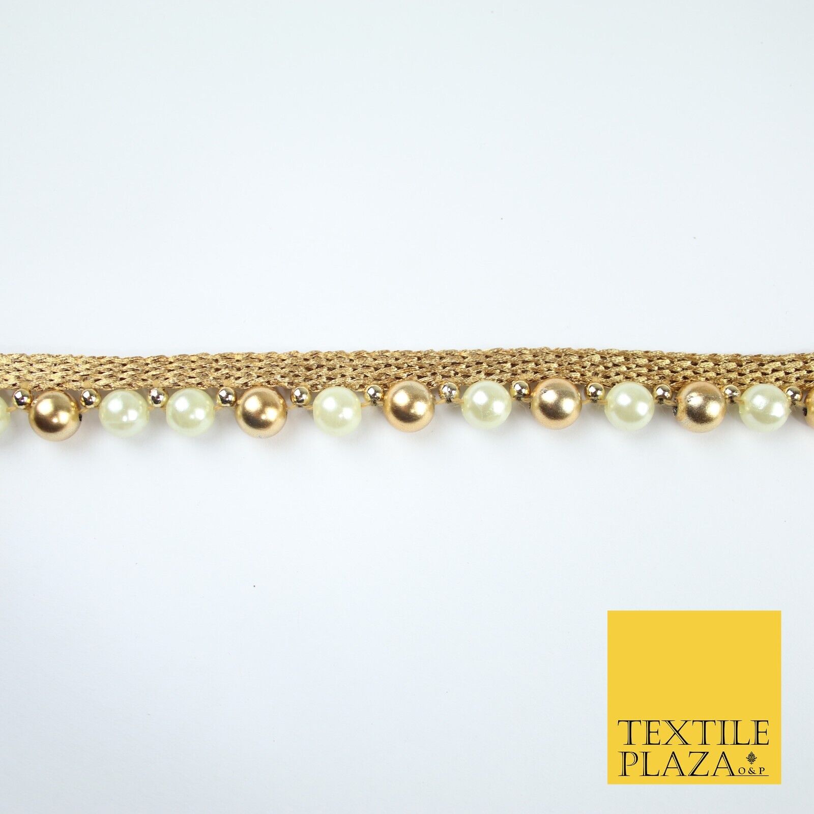 Gold / Ivory Cream Pearl Ball Beaded Ribbon Trim Border Lace - 1.5cm Wide - X588
