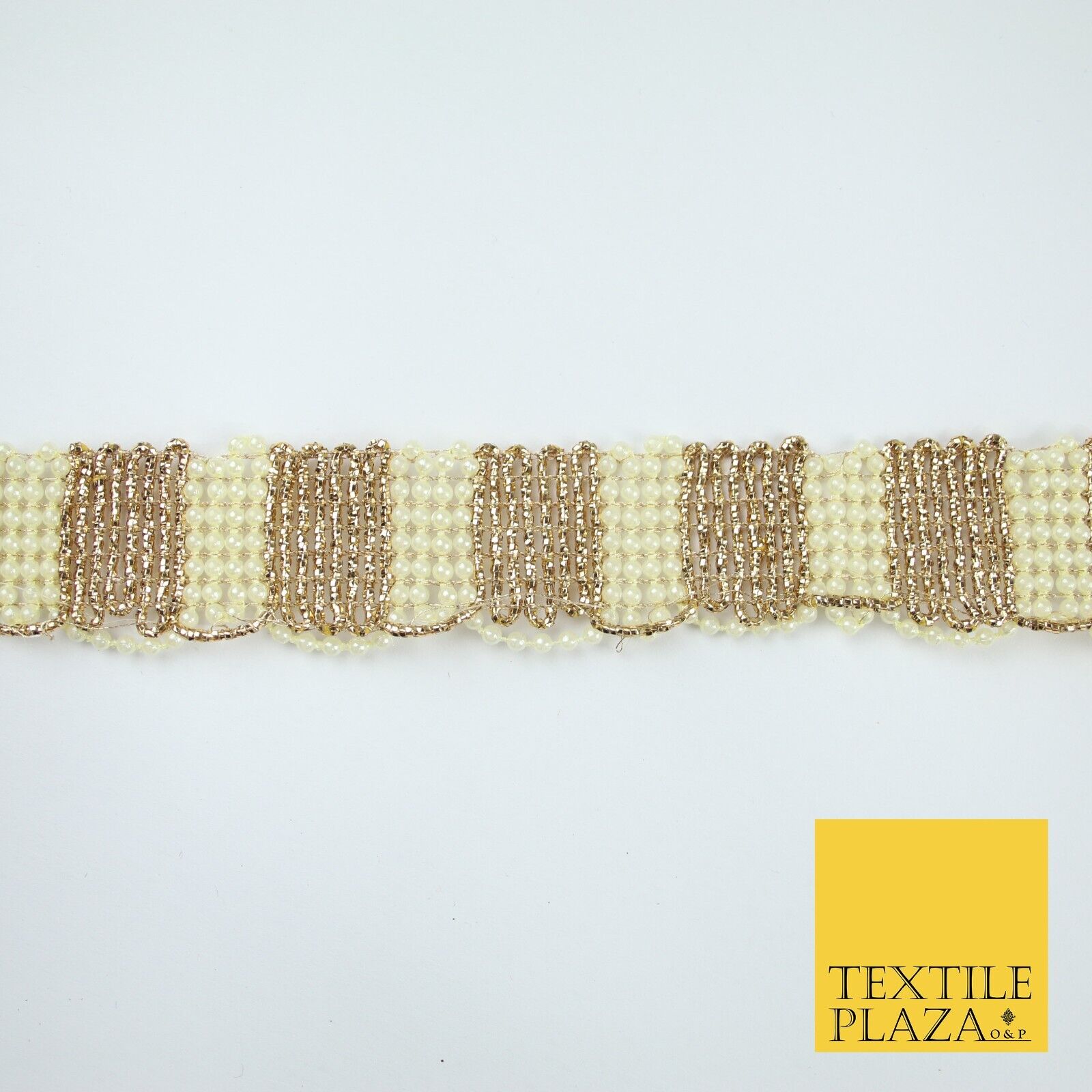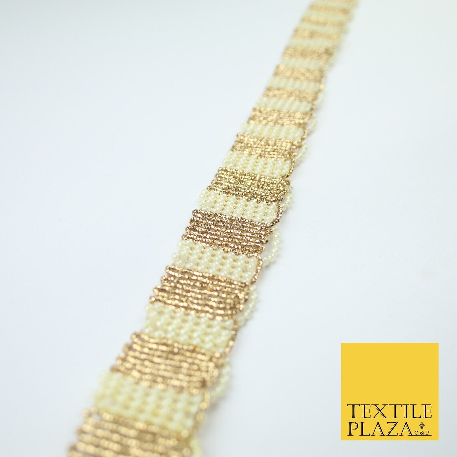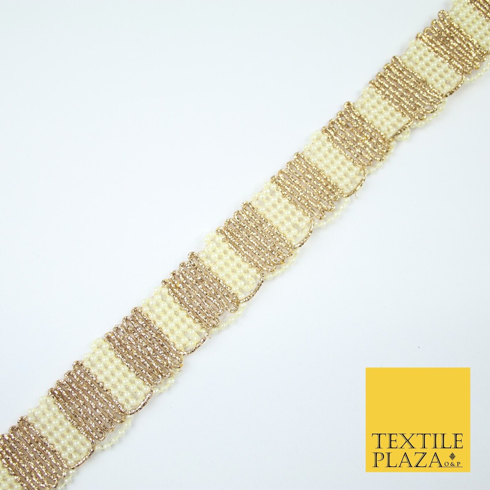 Gold / Ivory Pearl Beaded Striped Swag Ribbon Trim Border Lace - 3cm Wide - X525