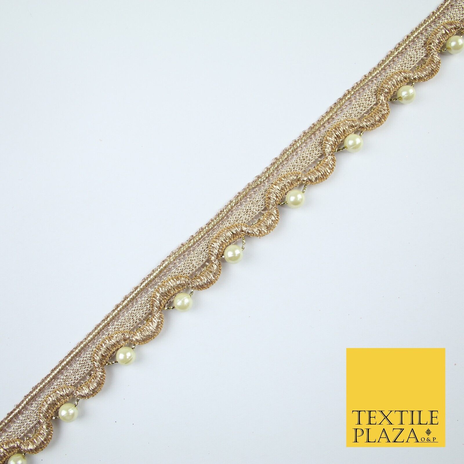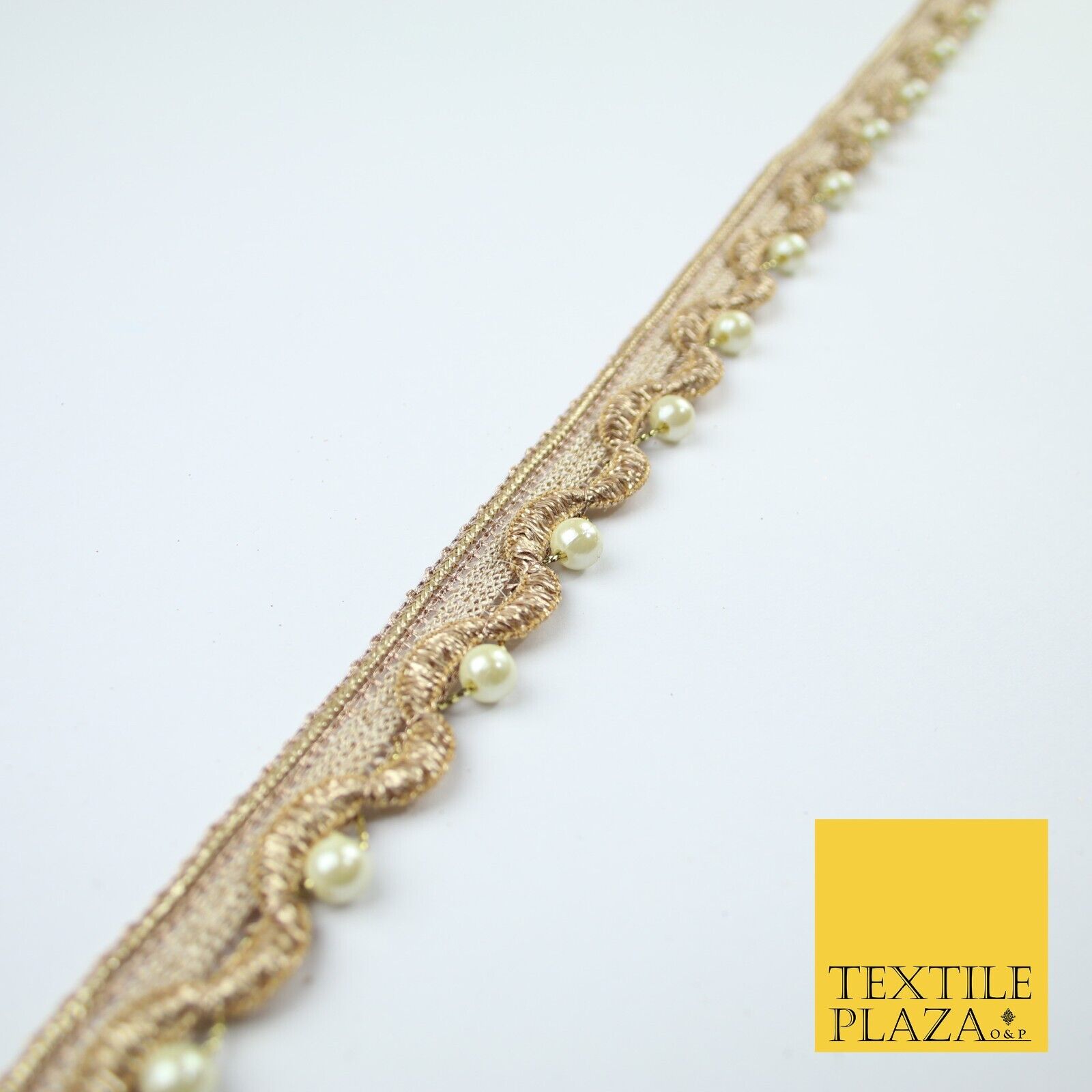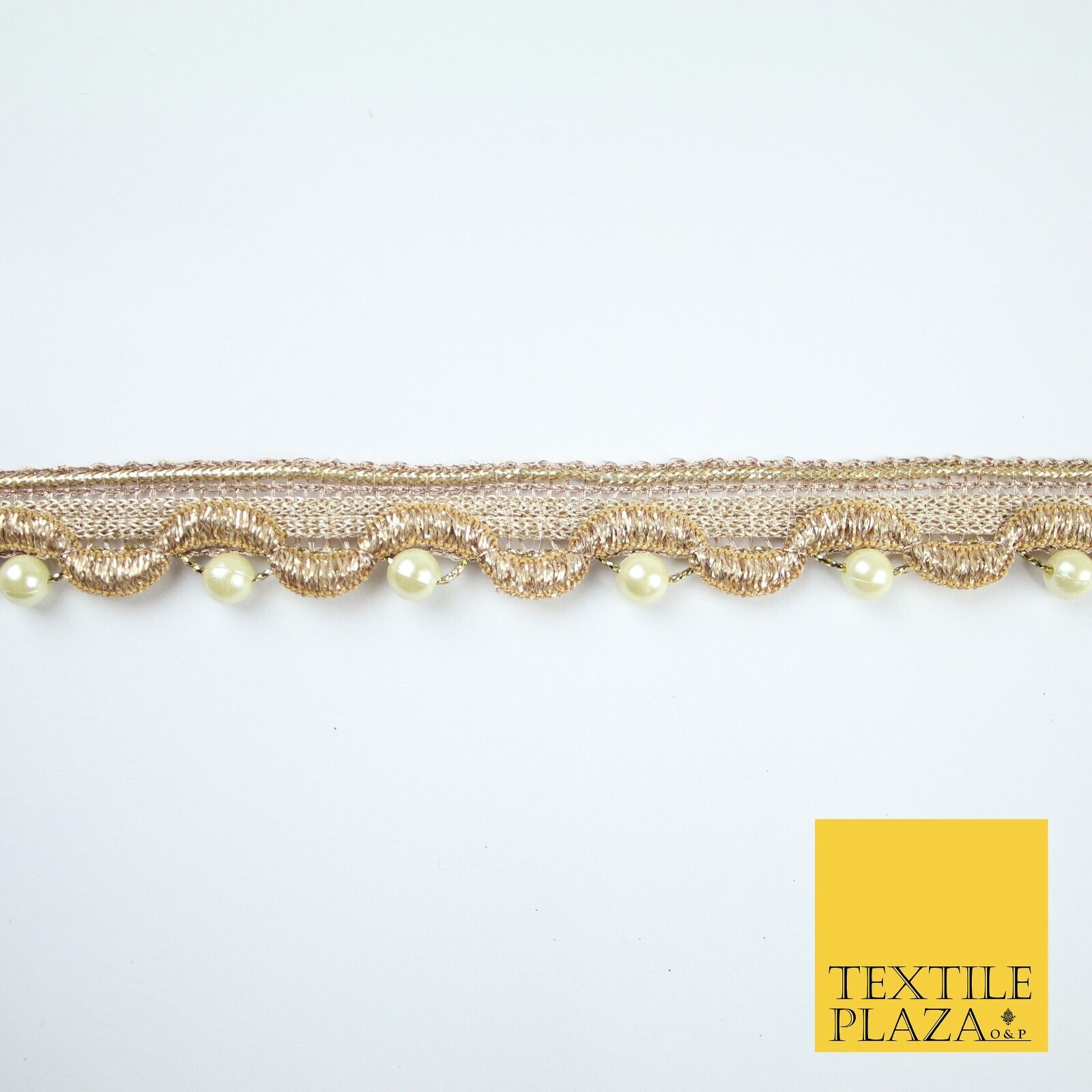 Gold Ivory Pearl Beaded Wave Swag Metallic Trim Border Lace - 2cm Wide - X667