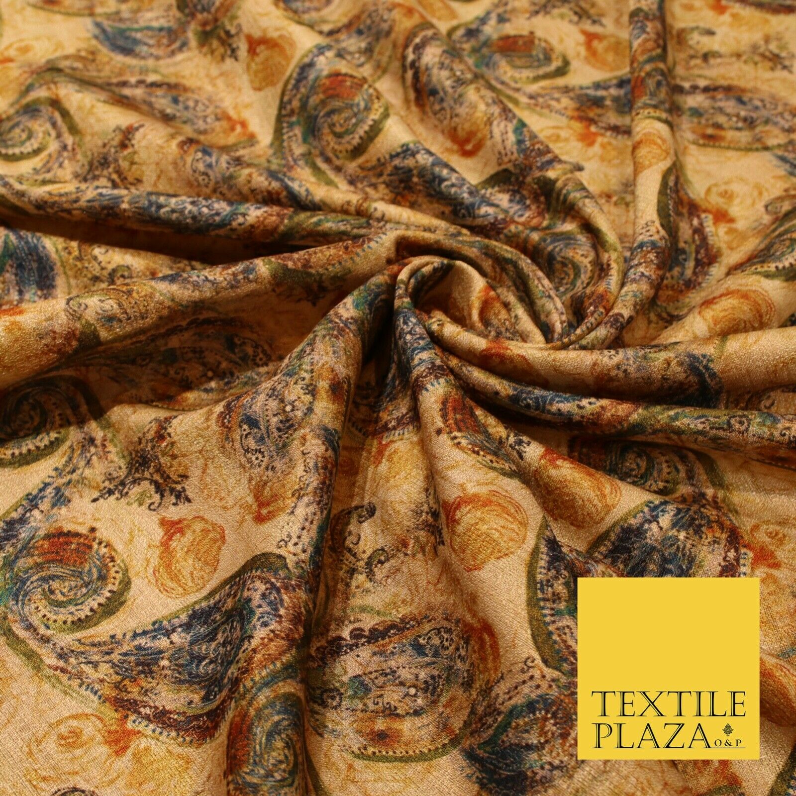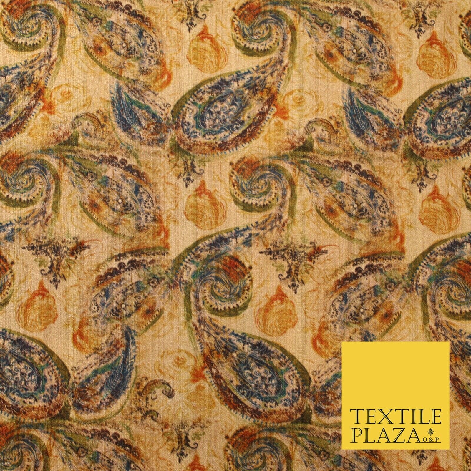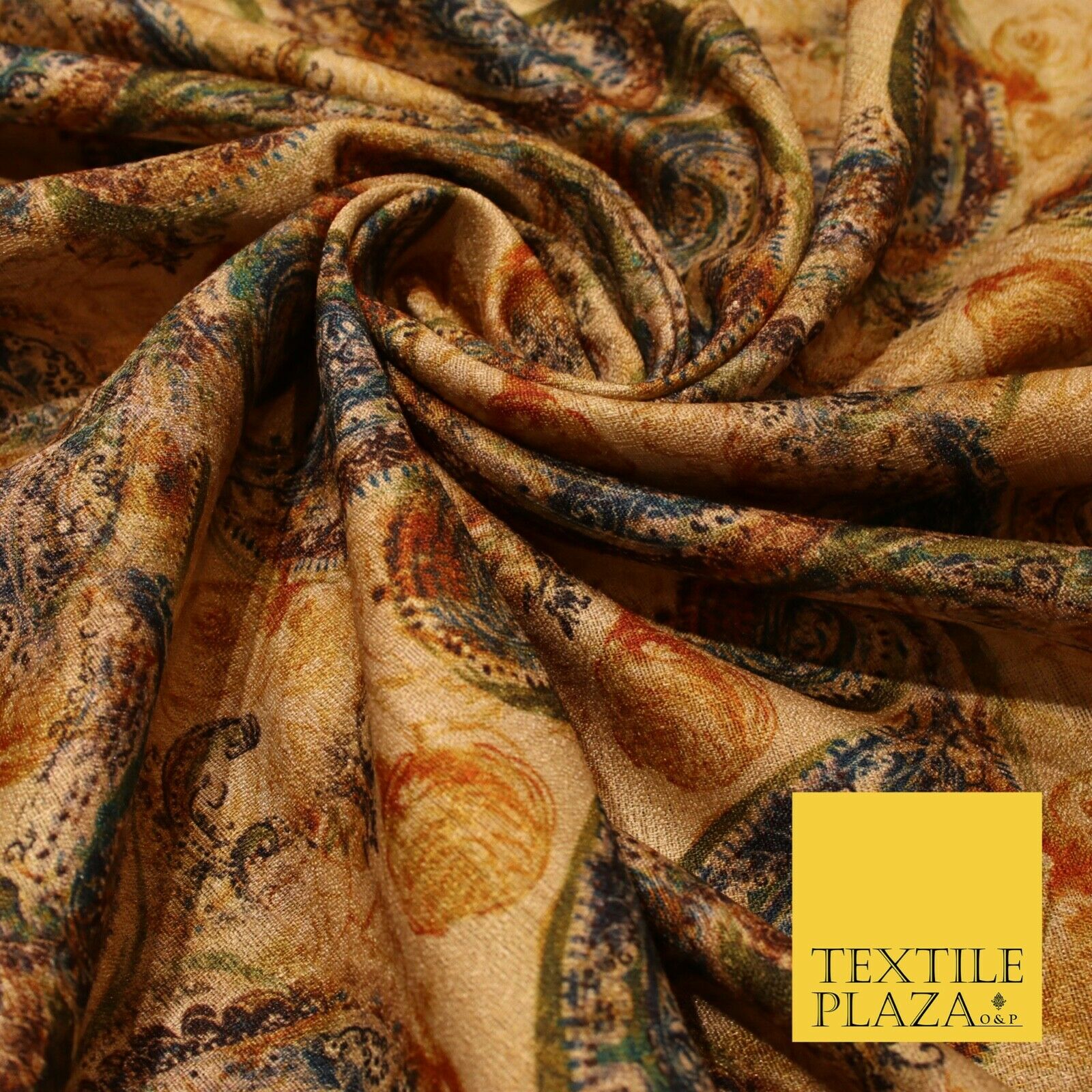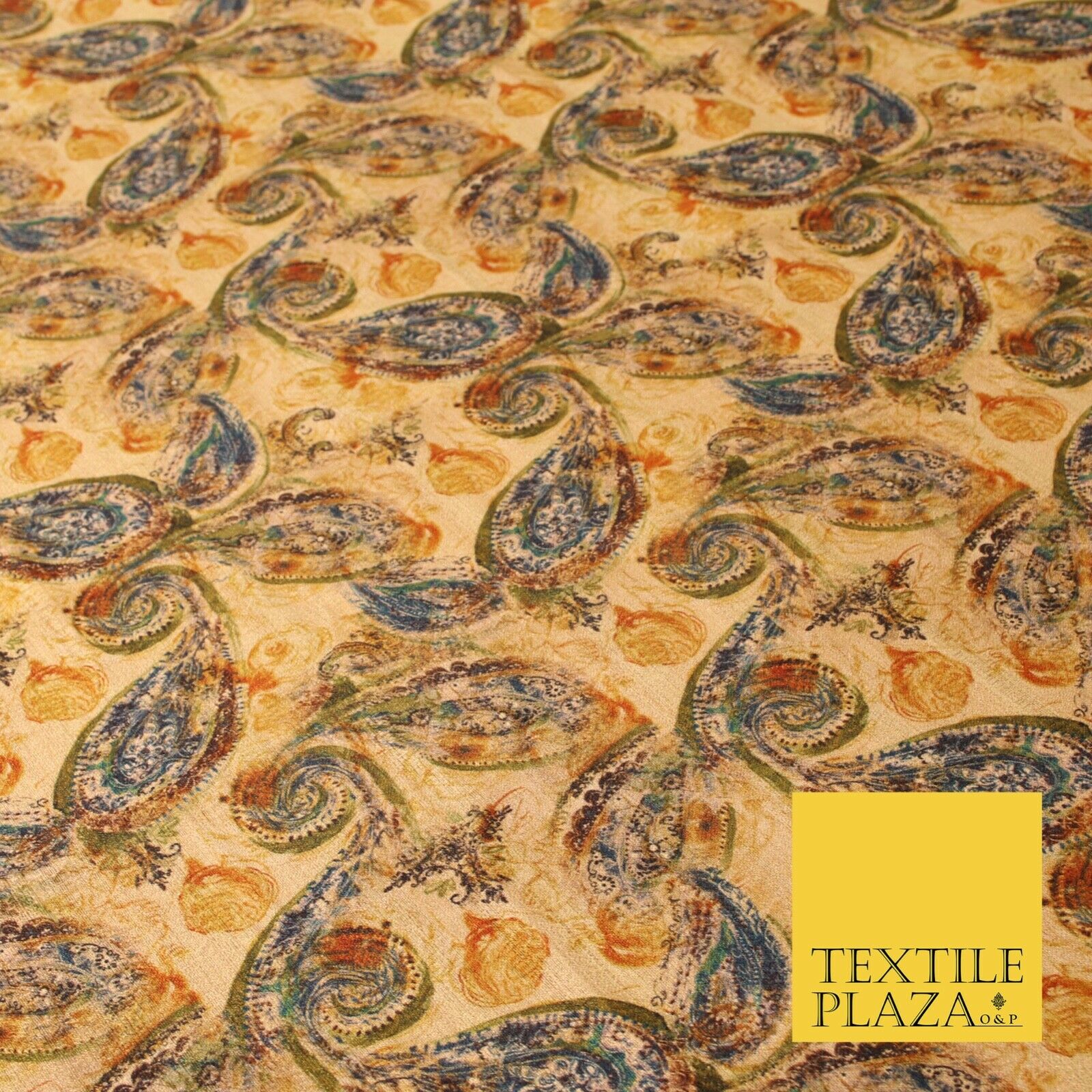 Gold Khaki Paisley Indian Digital Print Faux Raw Silk Vintage Dress Fabric 3021