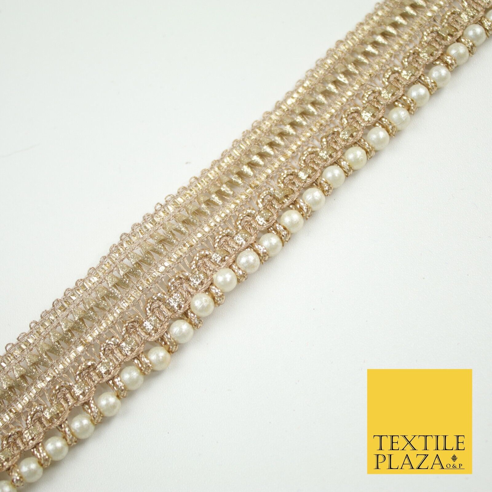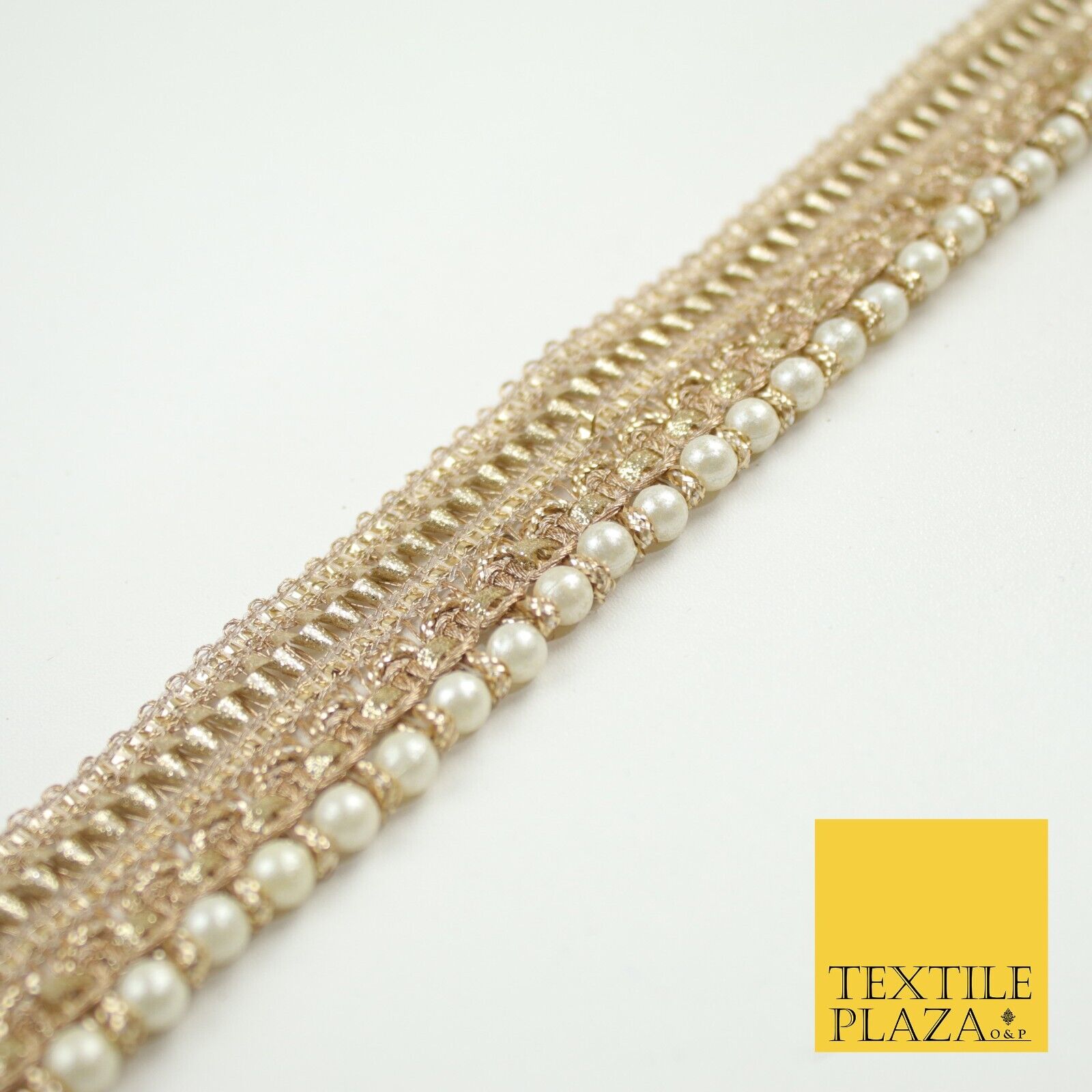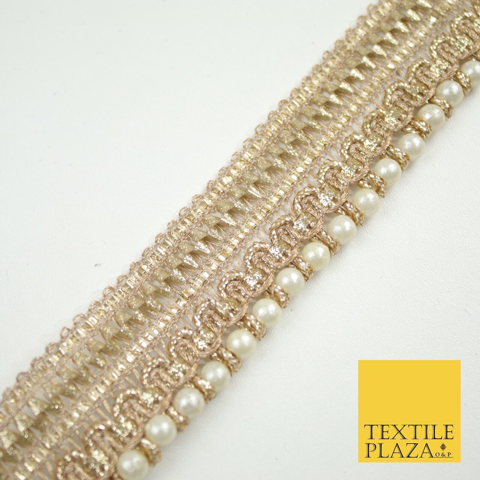 Gold Metallic Ribbon & Pearl Trim Border Ribbon Gota Lace 2.5cm Wide X691