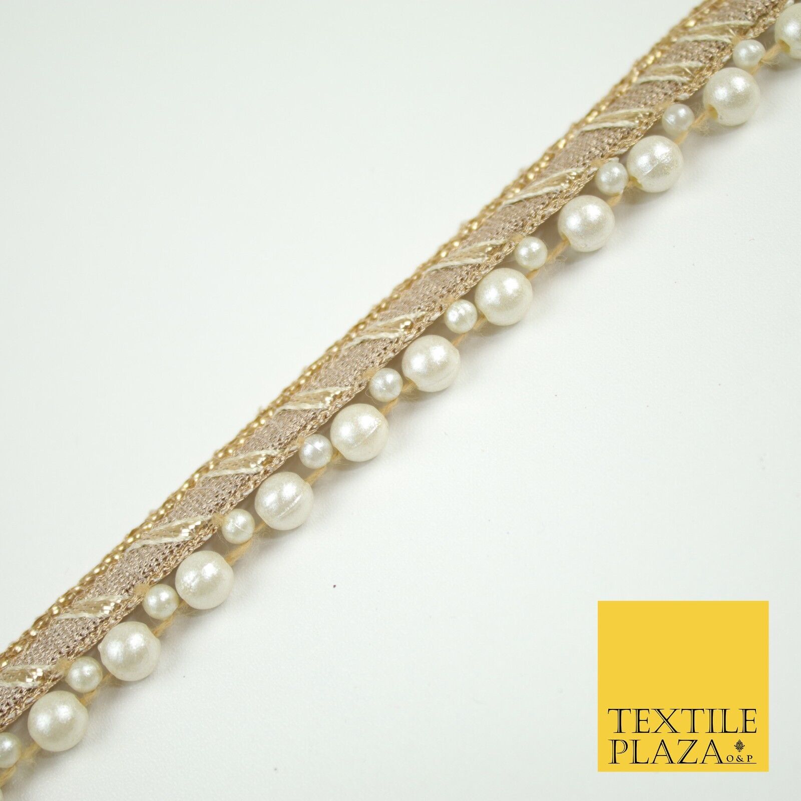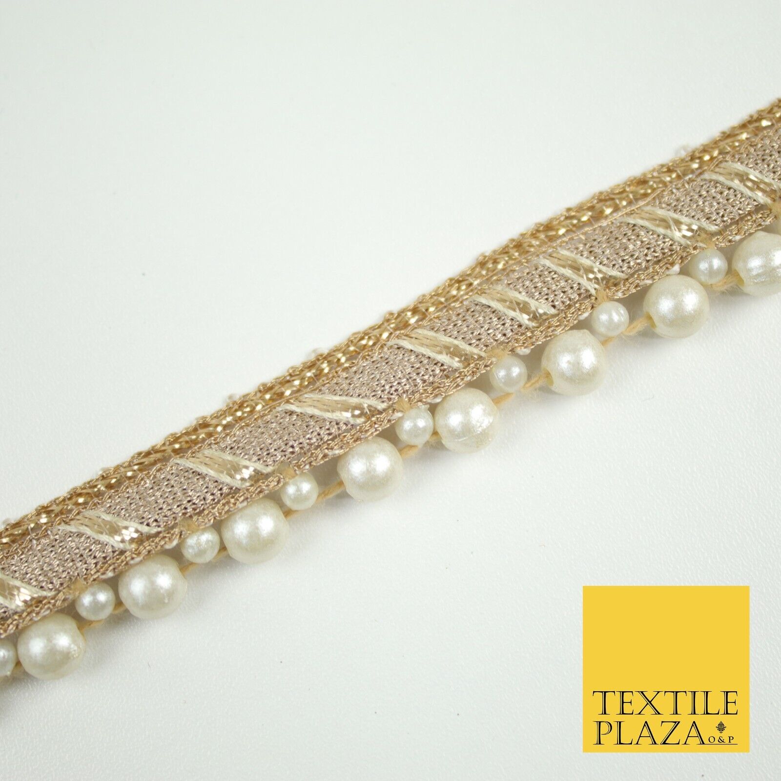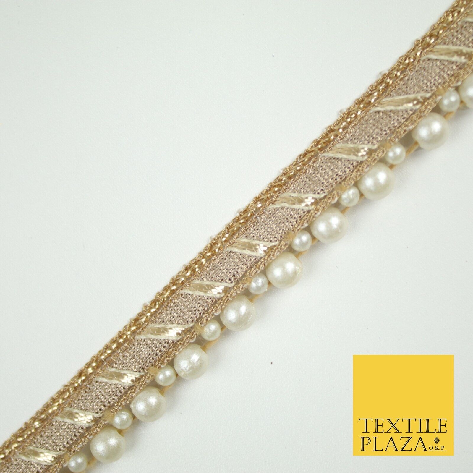 Gold Metallic Ribbon & Pearl Trim Border Ribbon Gota Lace 2cm Wide X695