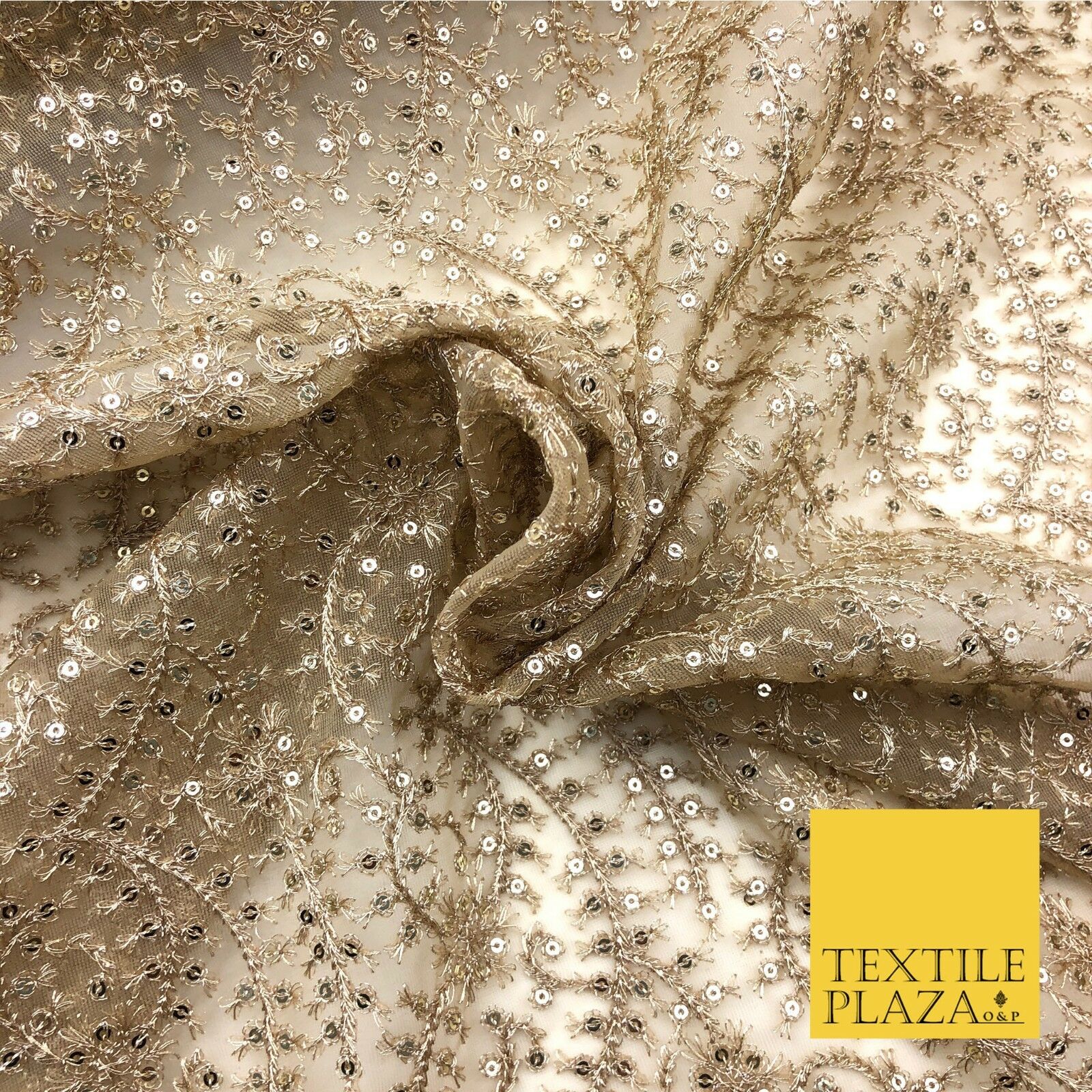 Gold / Stone Heavy Jaal Intricate Sequin Threadwork Fancy Fine Net Fabric JB298