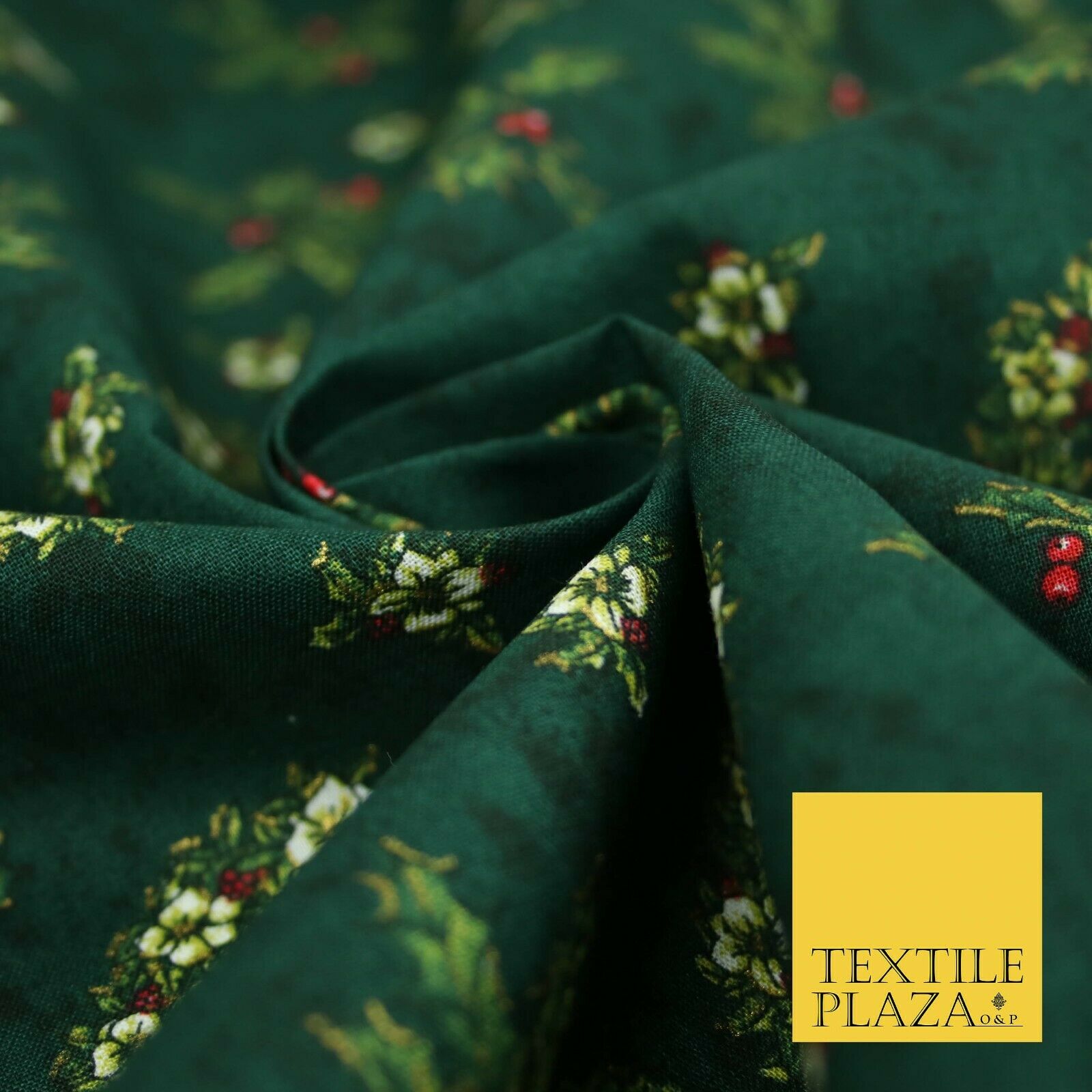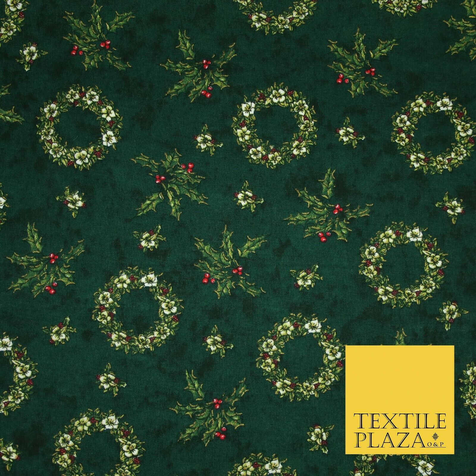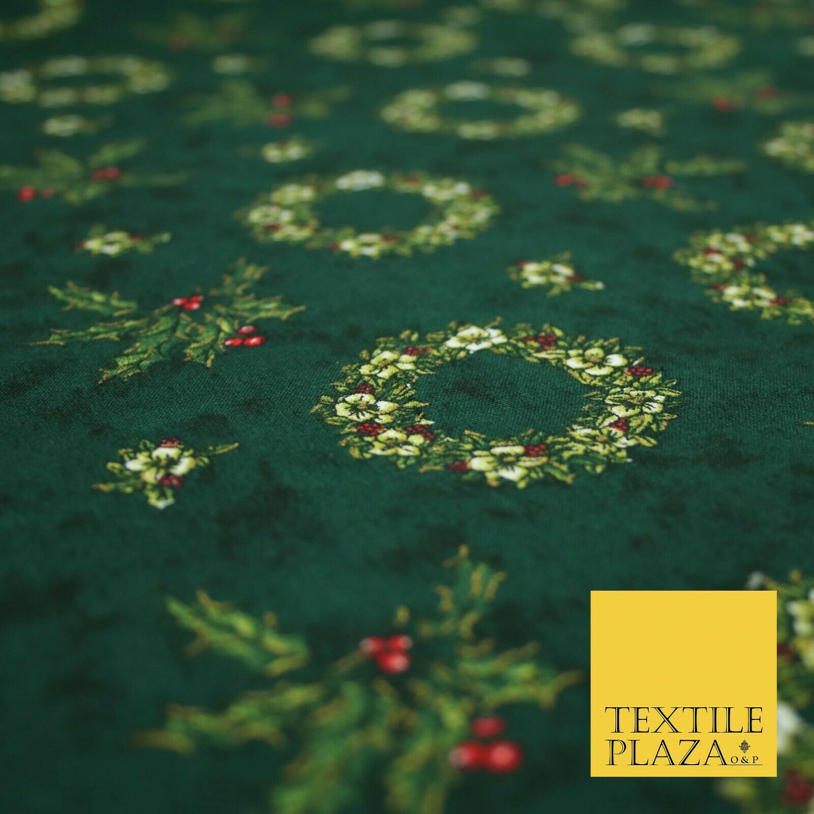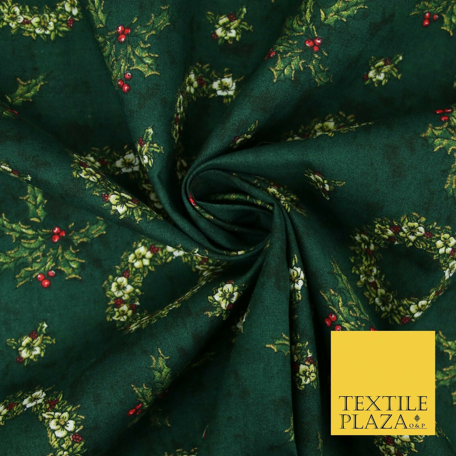 Green Christmas Holly Berry Floral Wreaths Printed 100% Cotton Fabric 54" 4117
