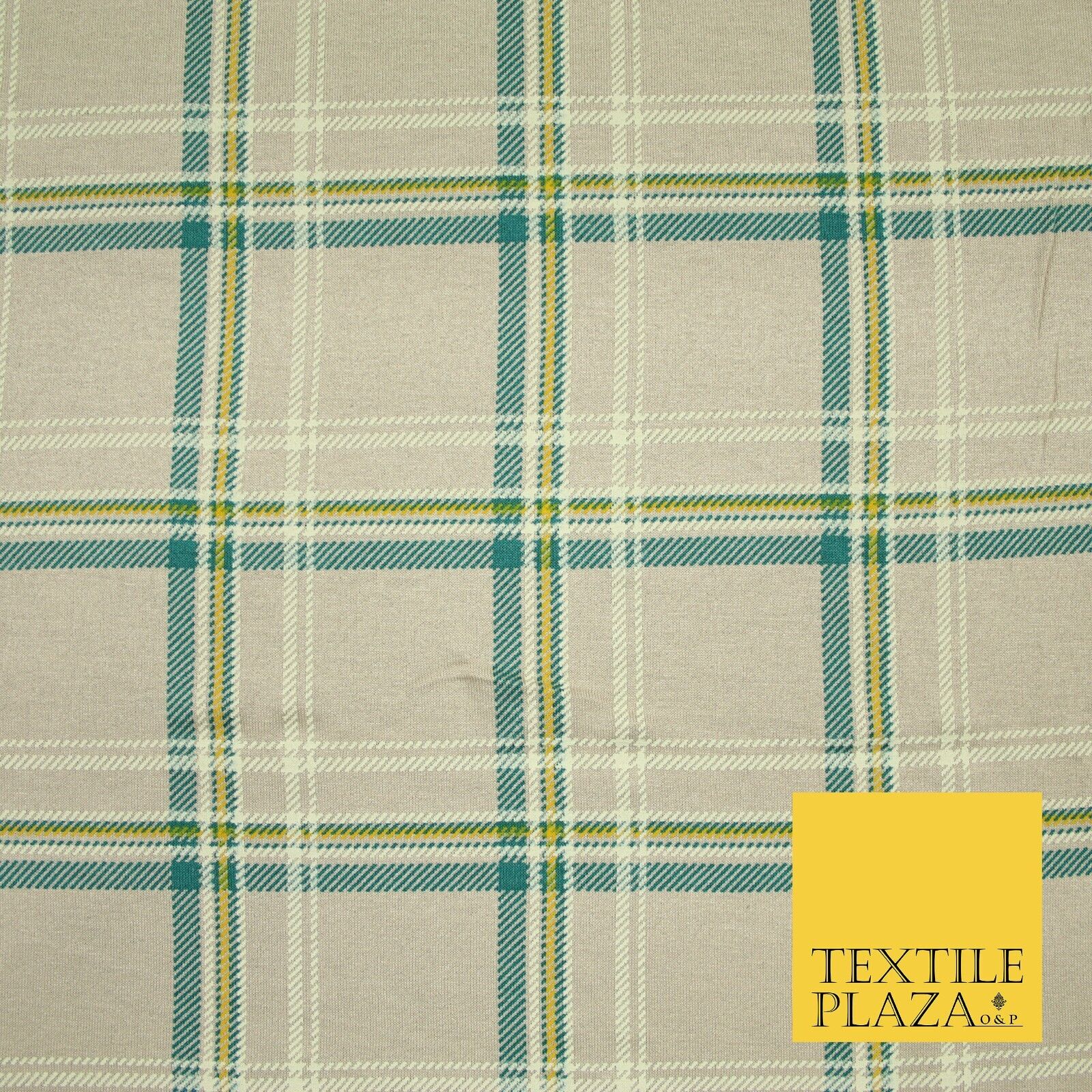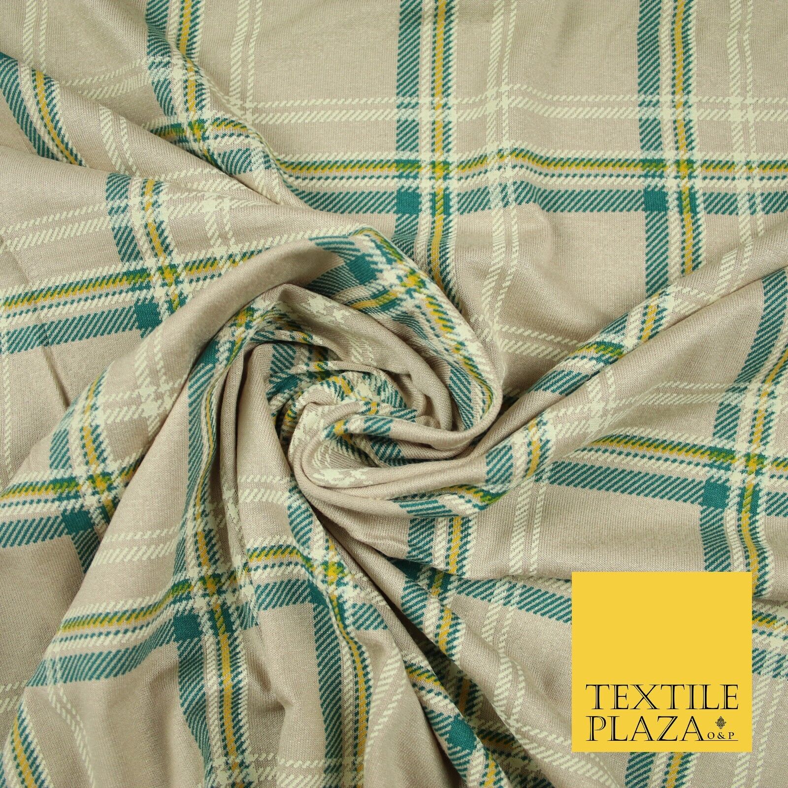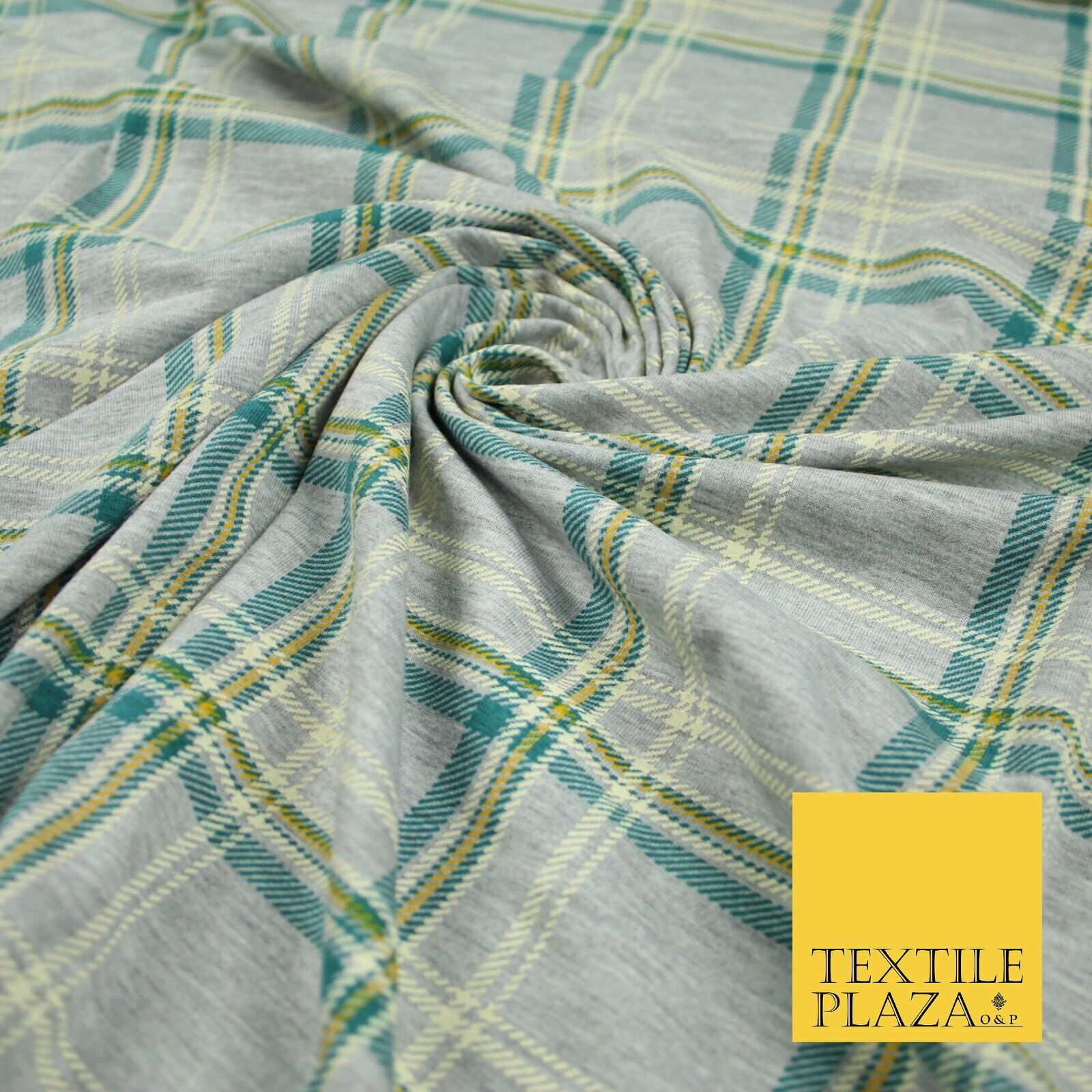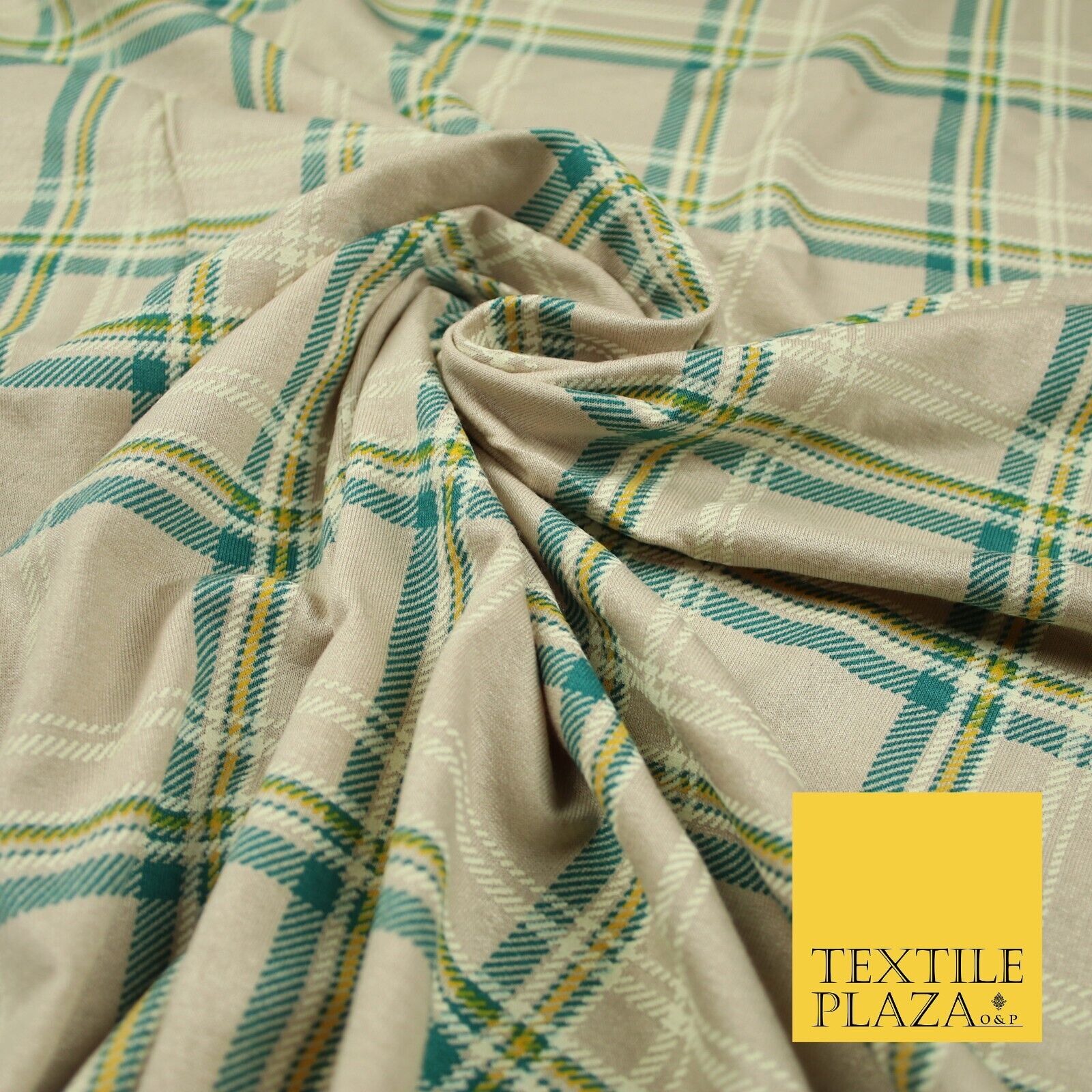 Grey/Beige with Teal & Mustard Tartan Print Soft Stretch Jersey Fabric 56"