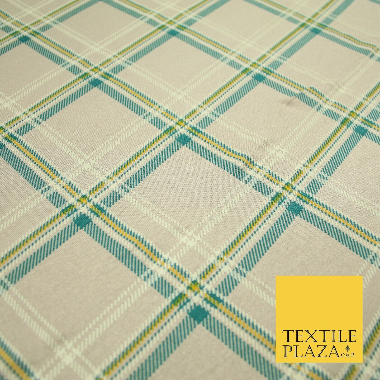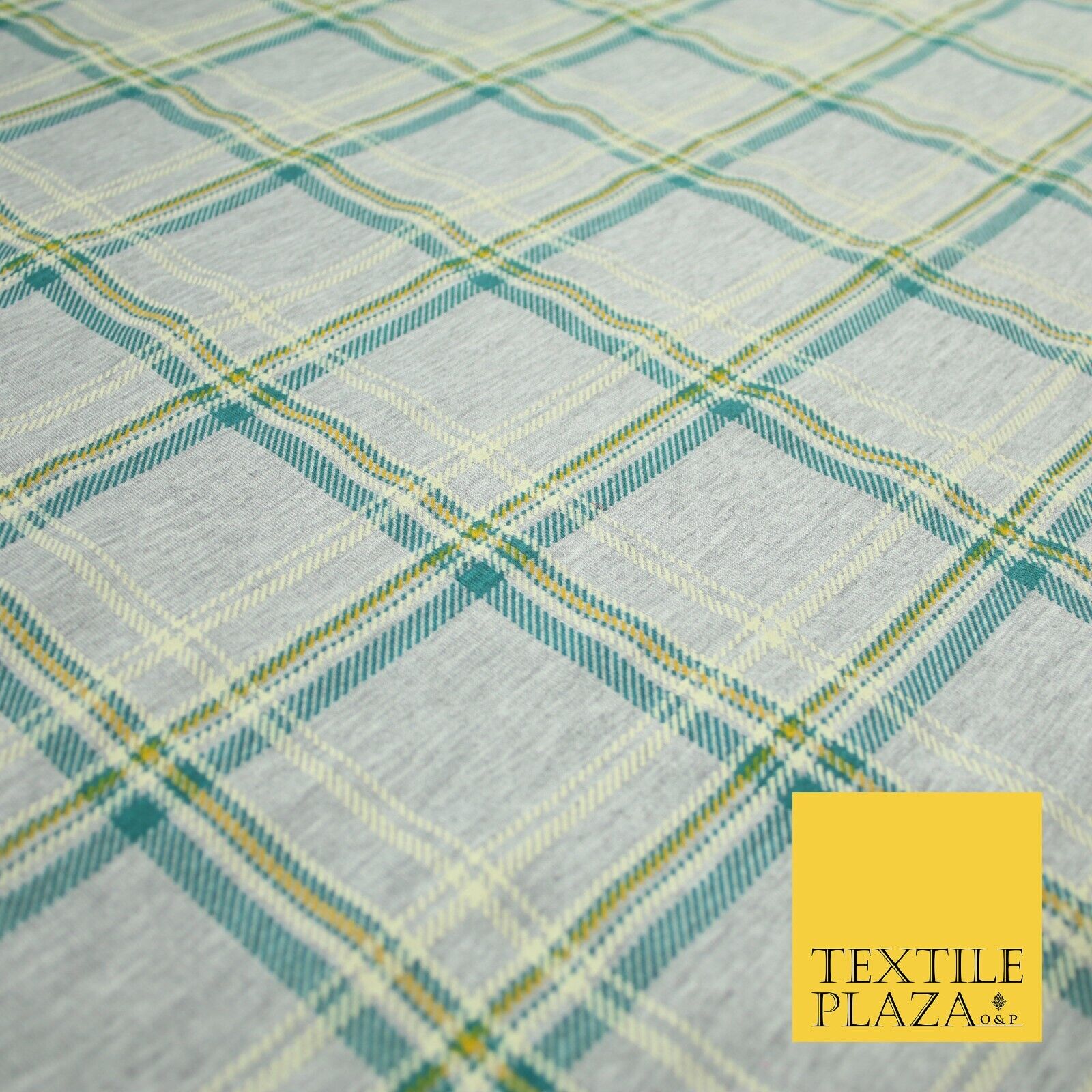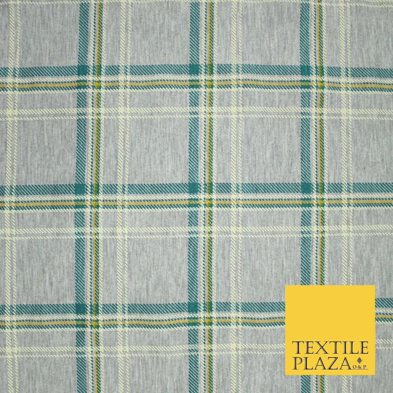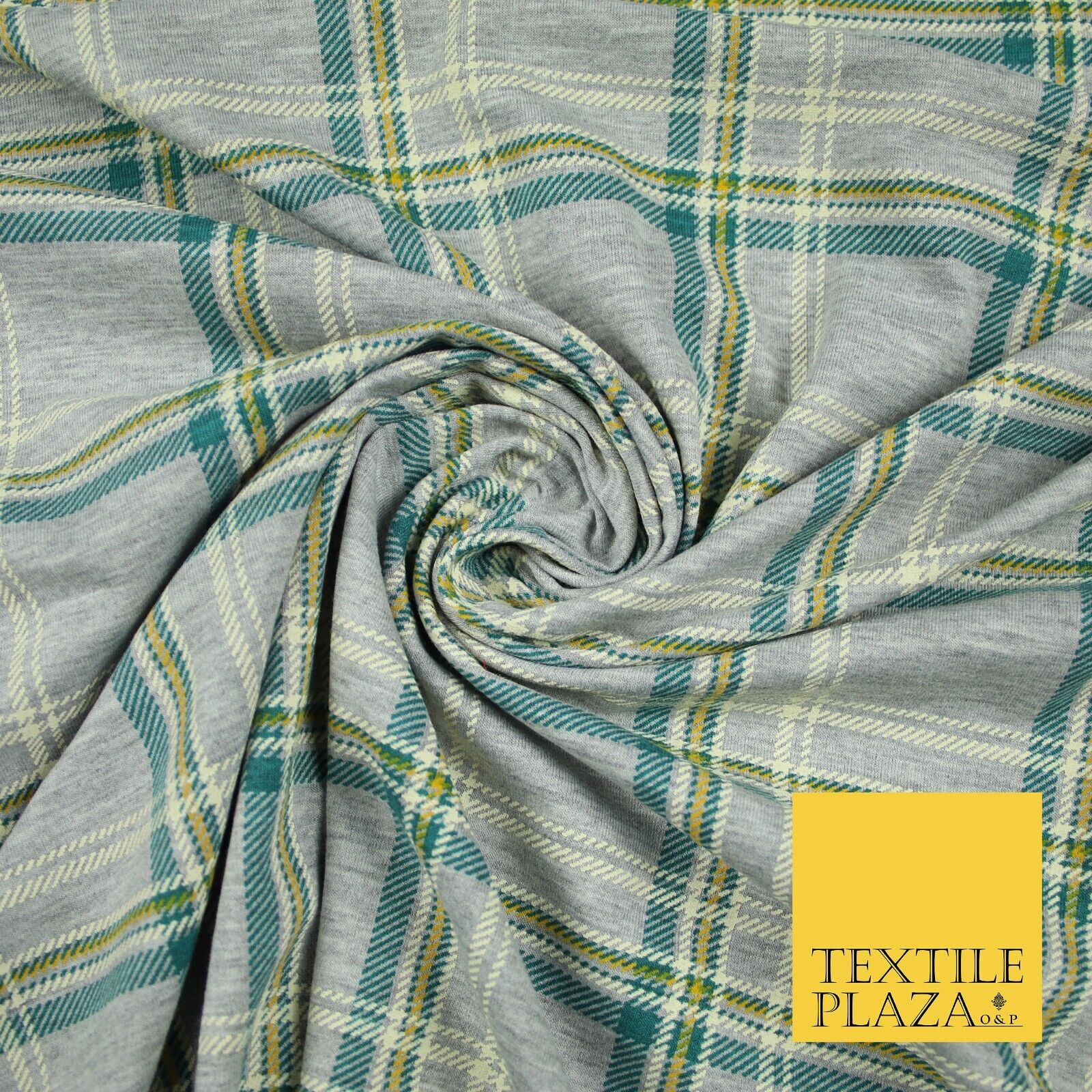 Grey/Beige with Teal & Mustard Tartan Print Soft Stretch Jersey Fabric 56"