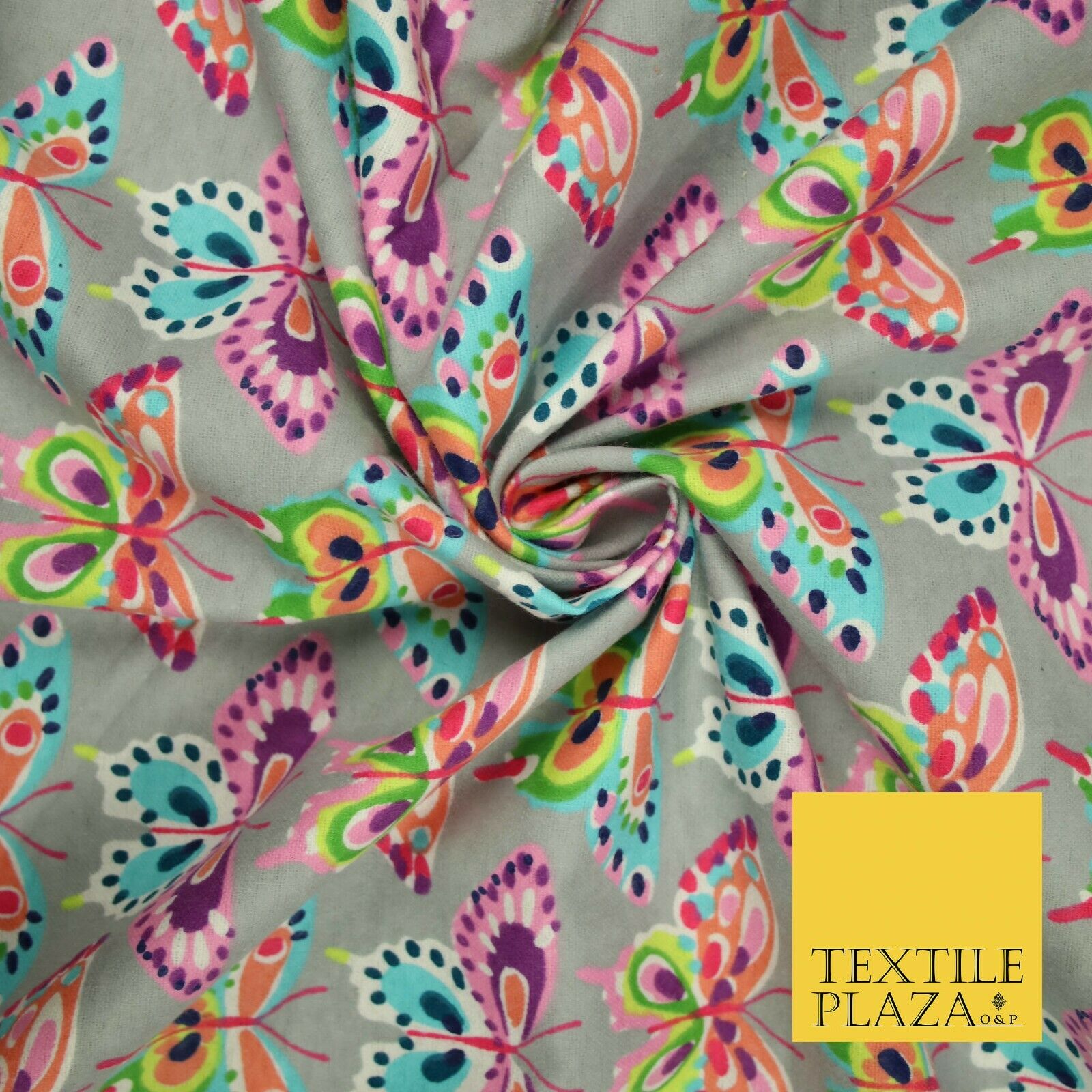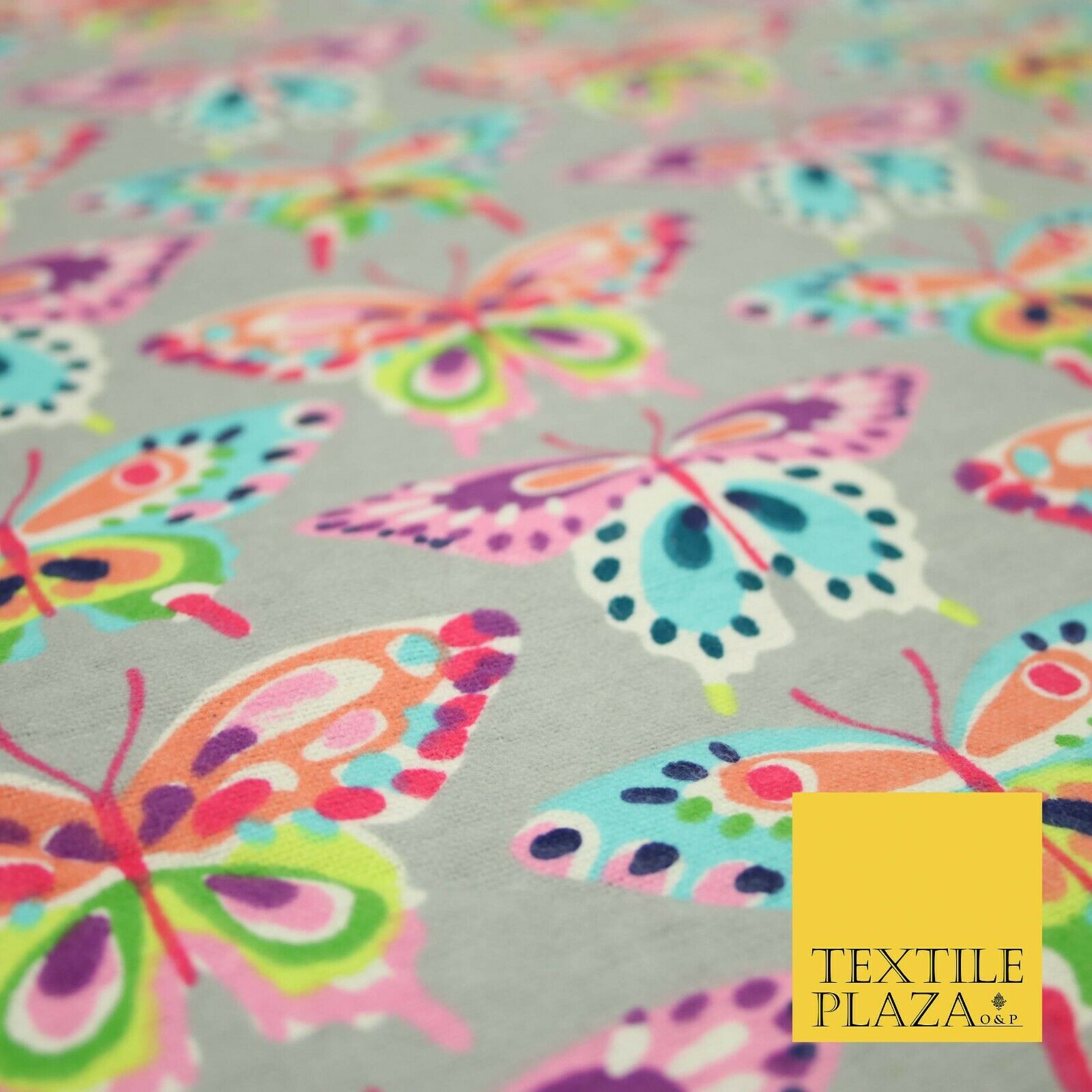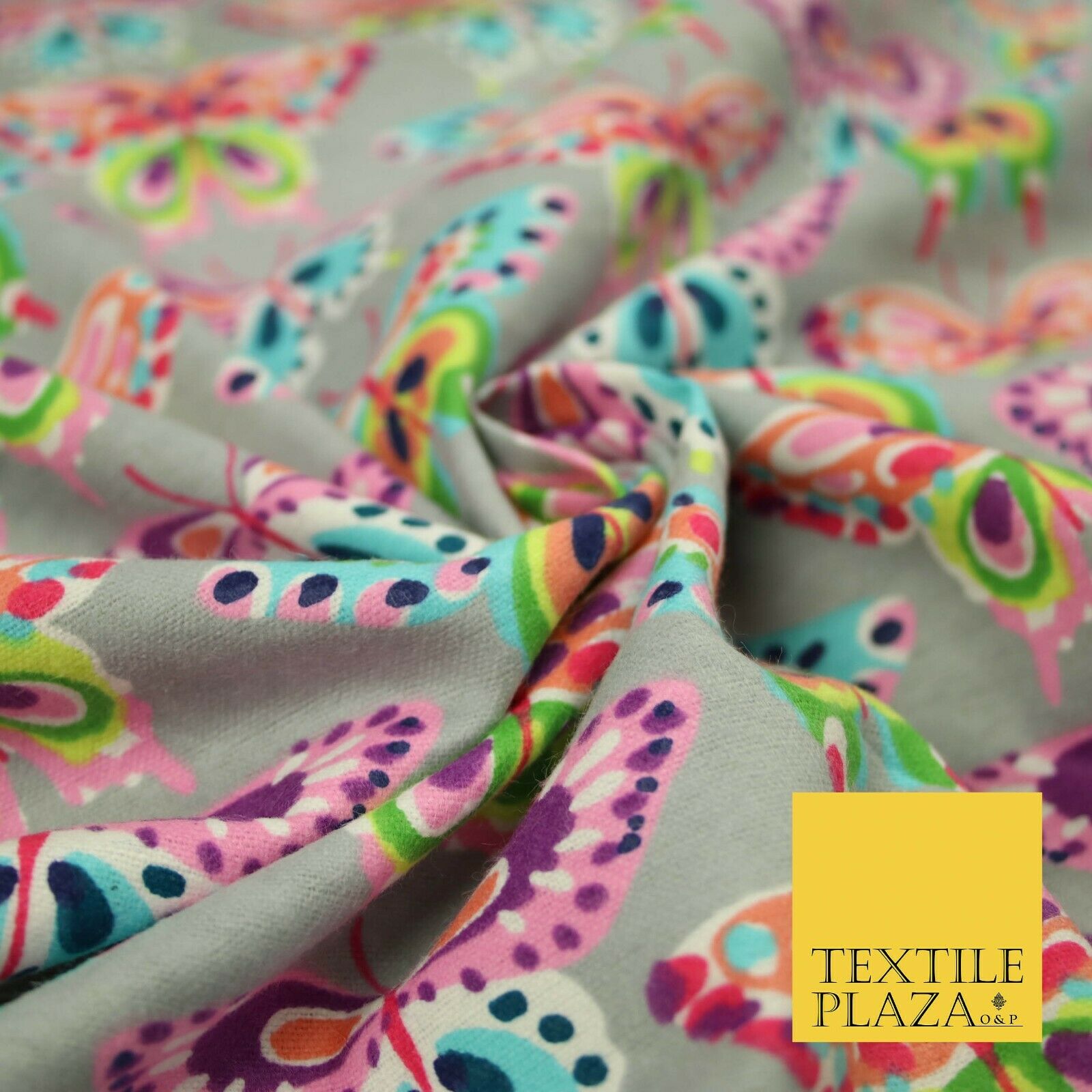 Grey Colourful Artsy Butterflies Brushed Cotton Winceyette Fabric Flannel 5525
