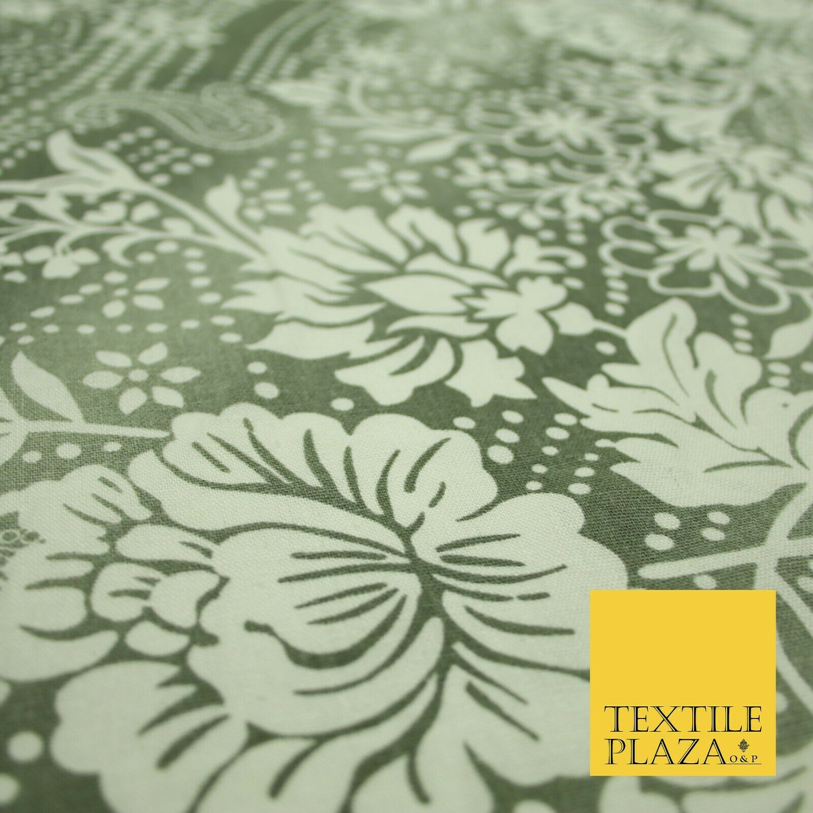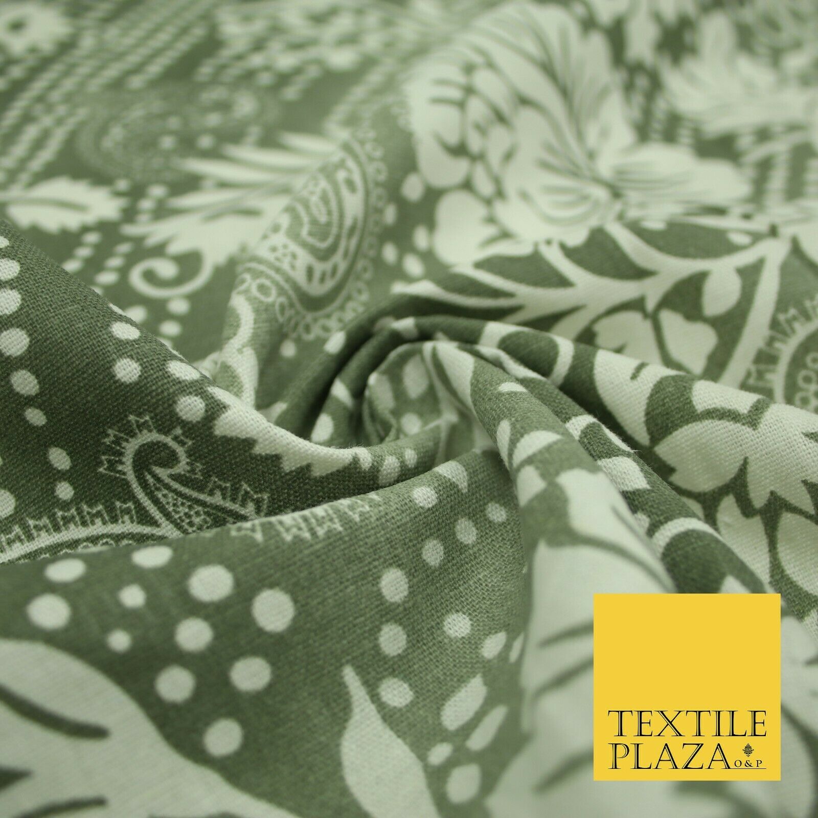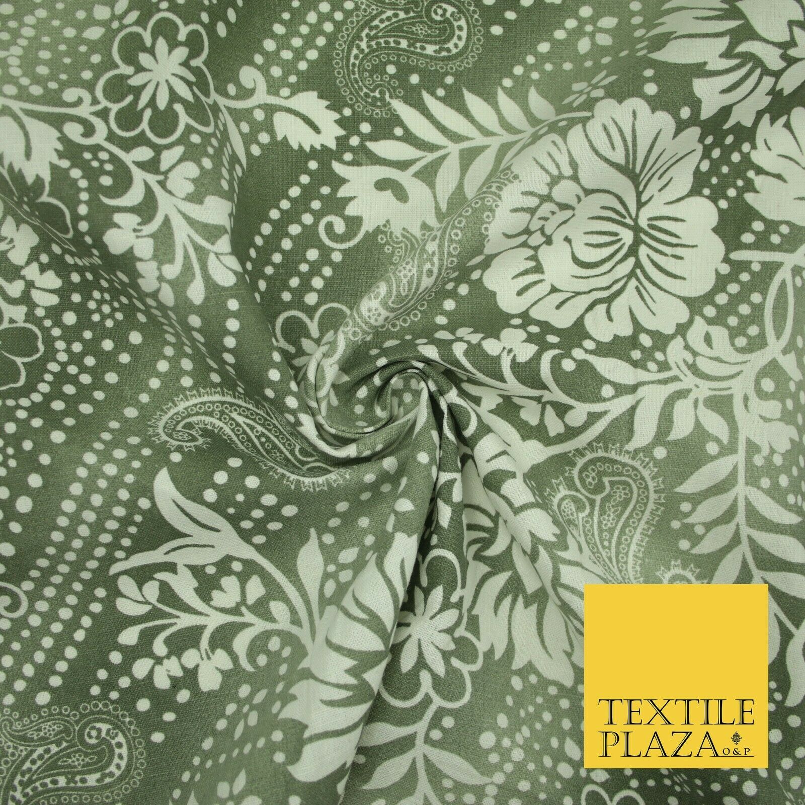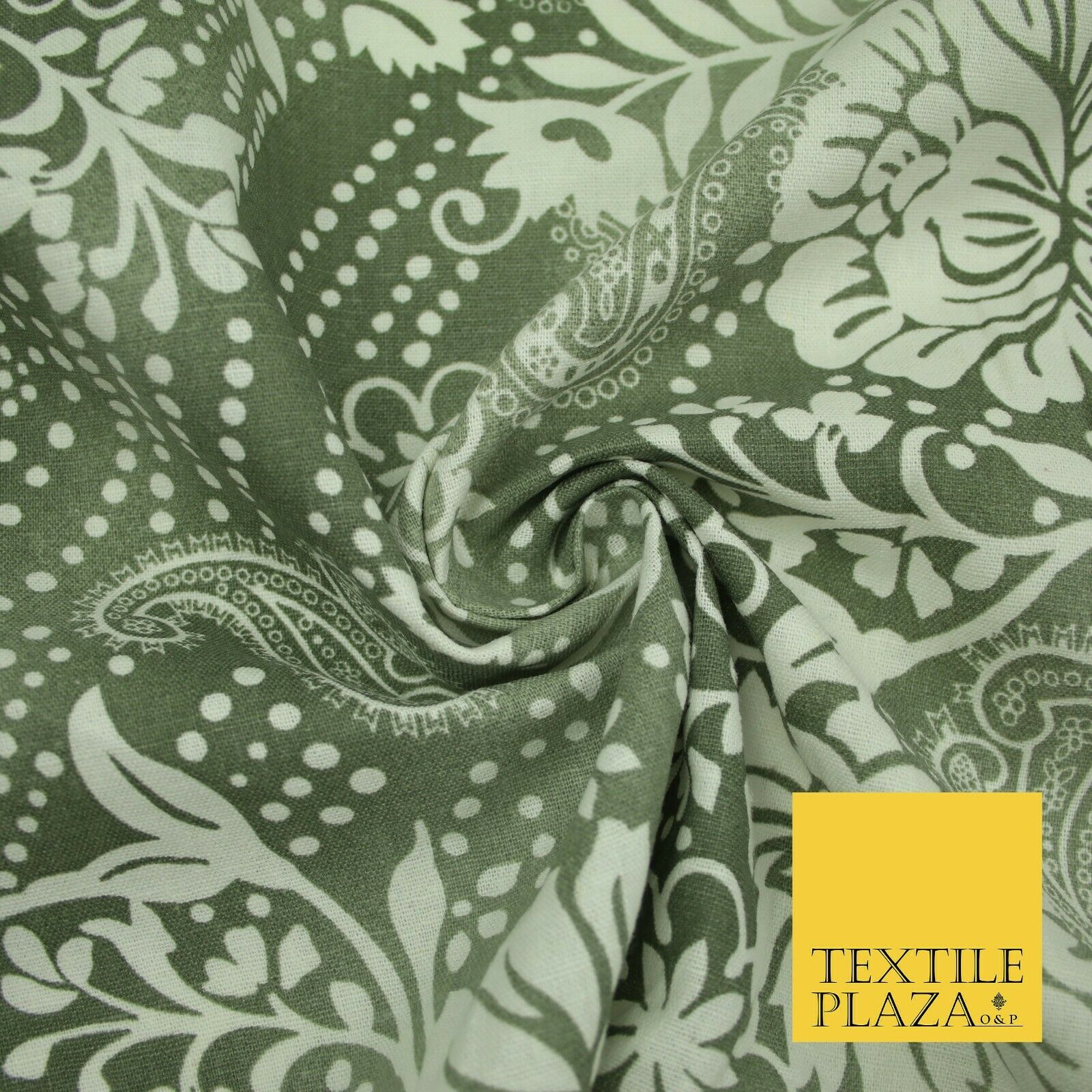 Grey White Shaded Floral Henna Dotted Paisleys Printed Cotton Linen Fabric 2204
