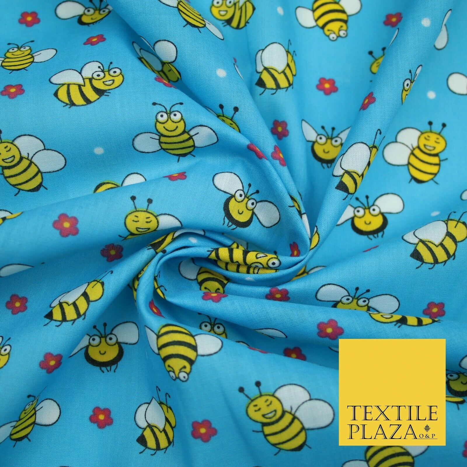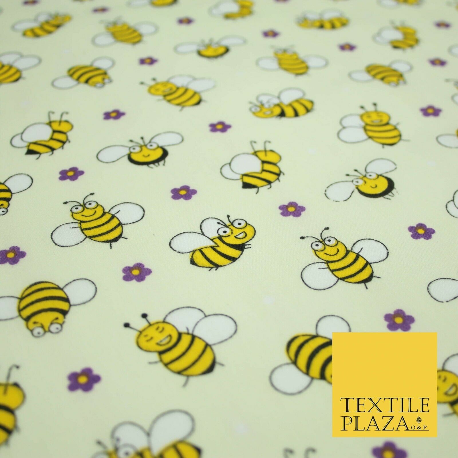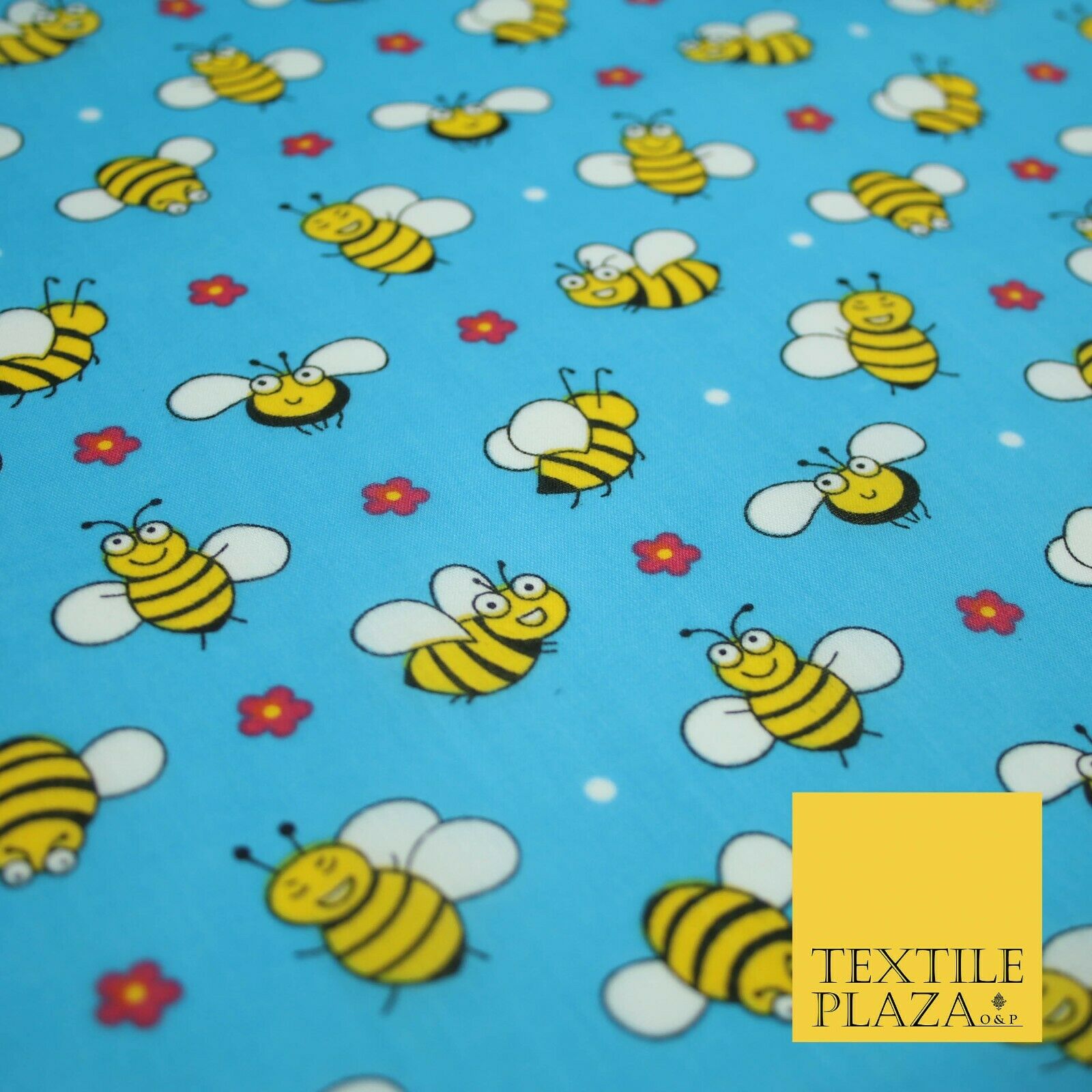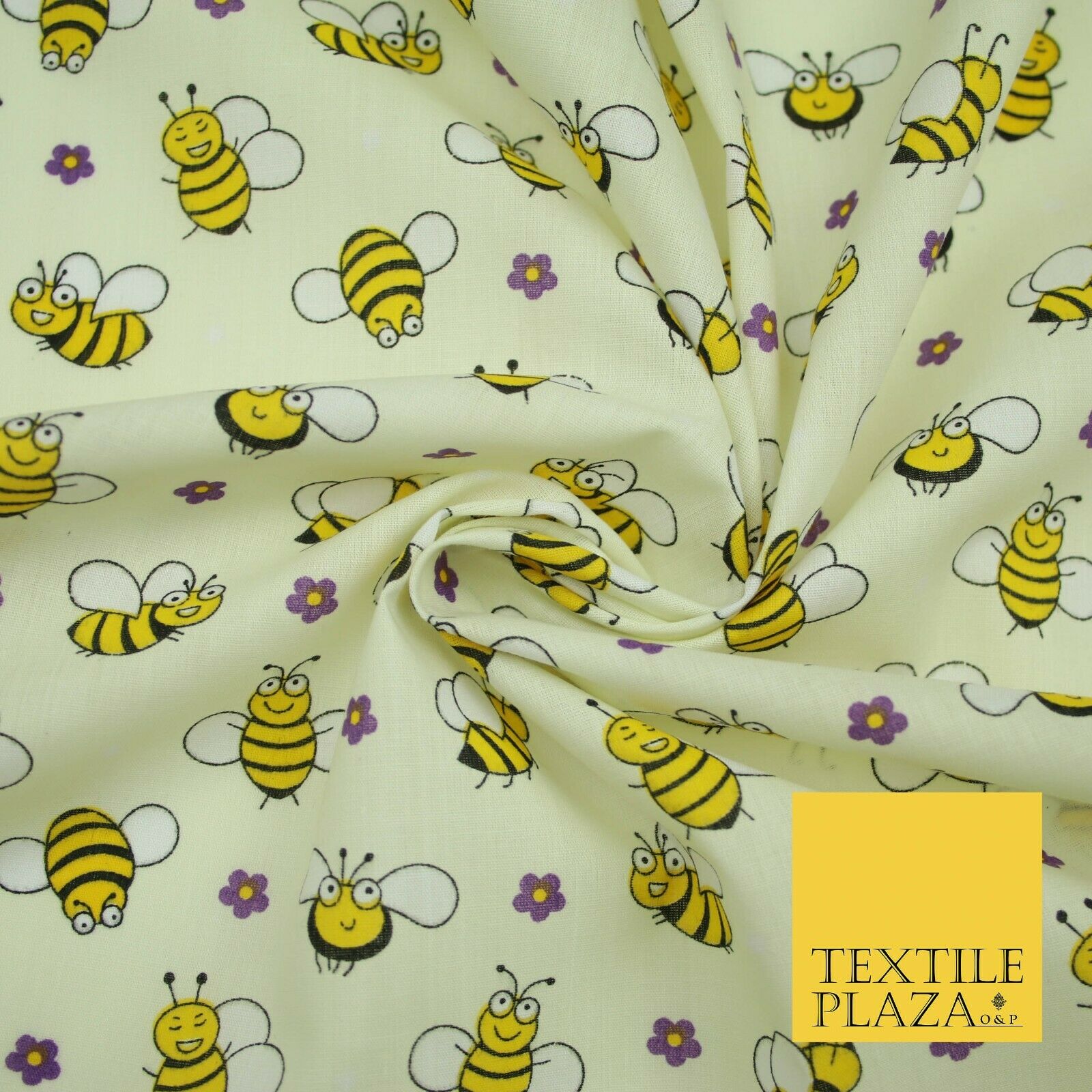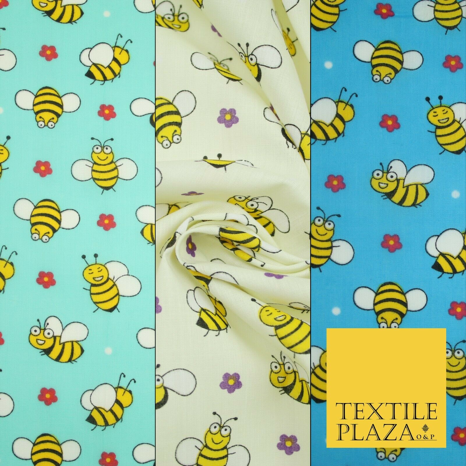 Happy Busy Bumble Bees Printed Polycotton Dress Craft Fabric Kids 44" 3 COLOURS
