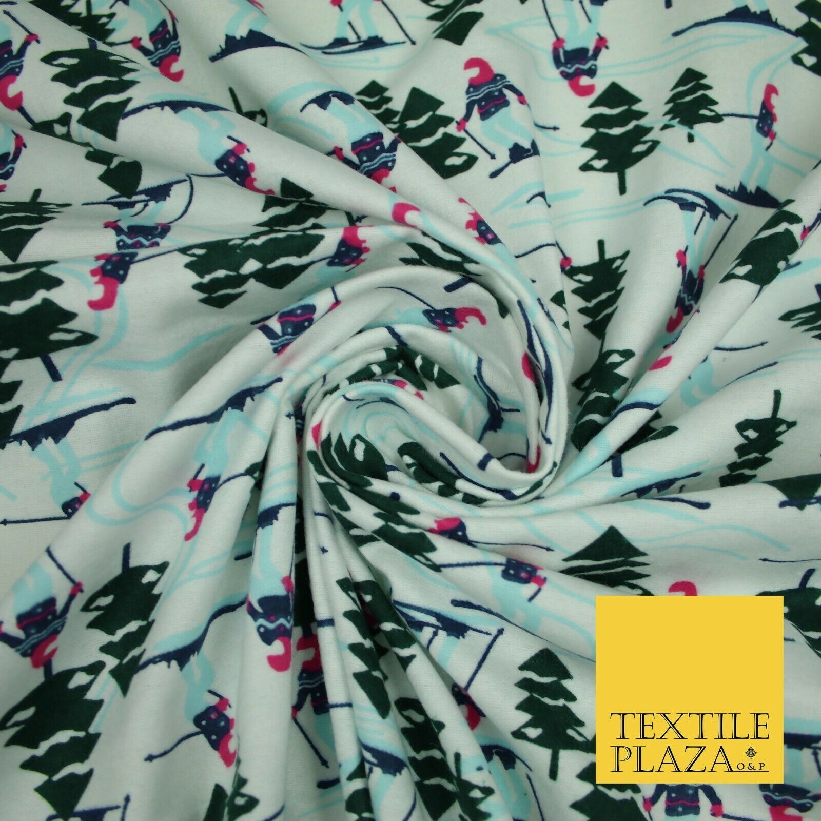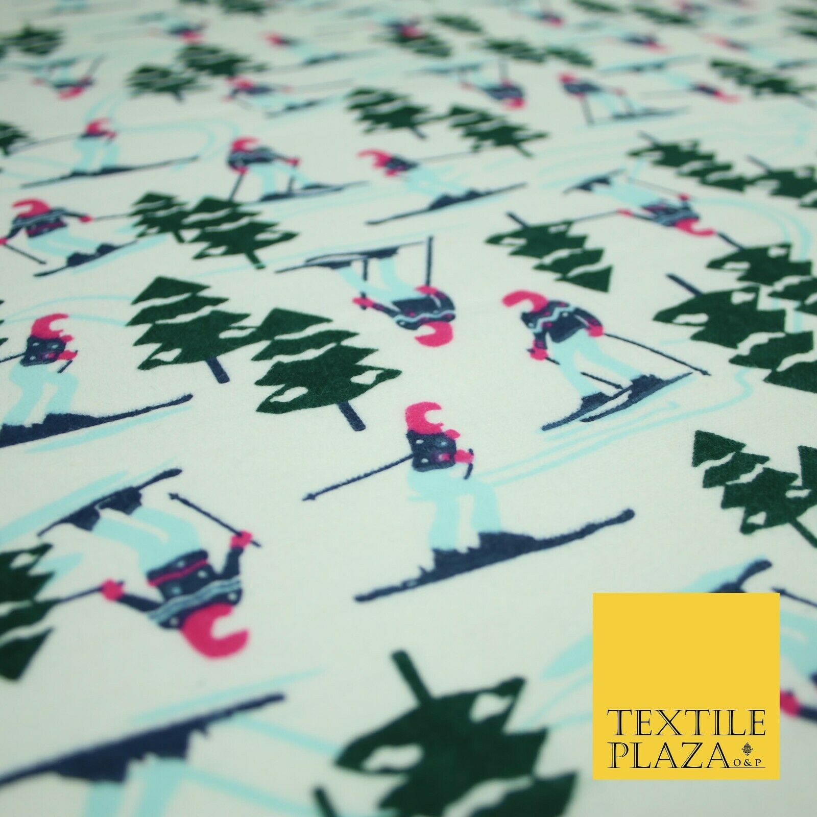 Ivory Alpine Skiing Snow Trees Winceyette Soft Brushed Cotton Print Fabric 3961