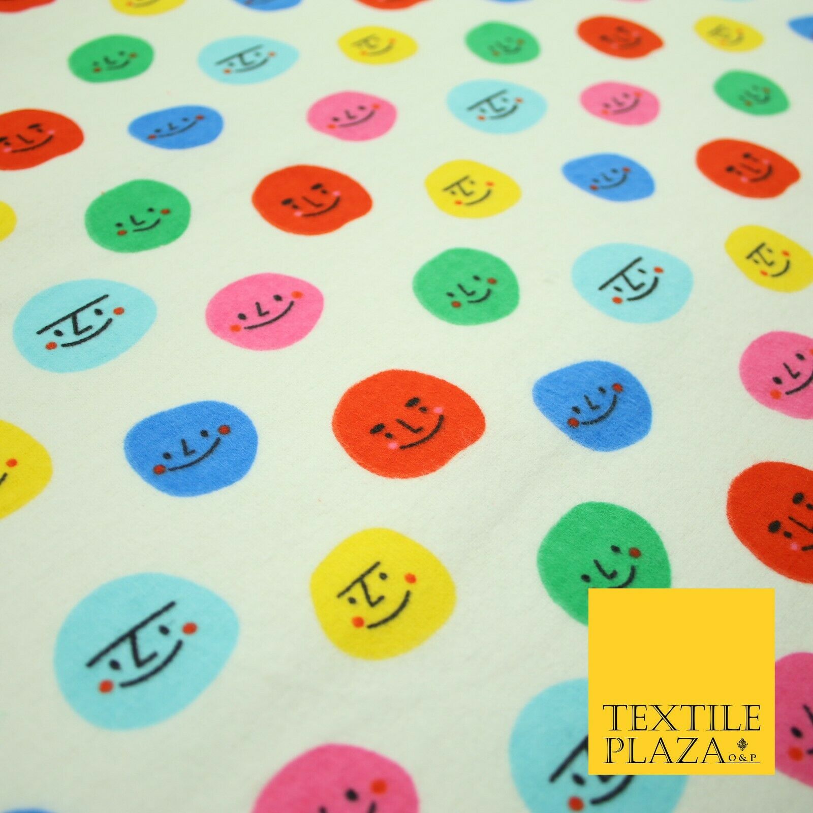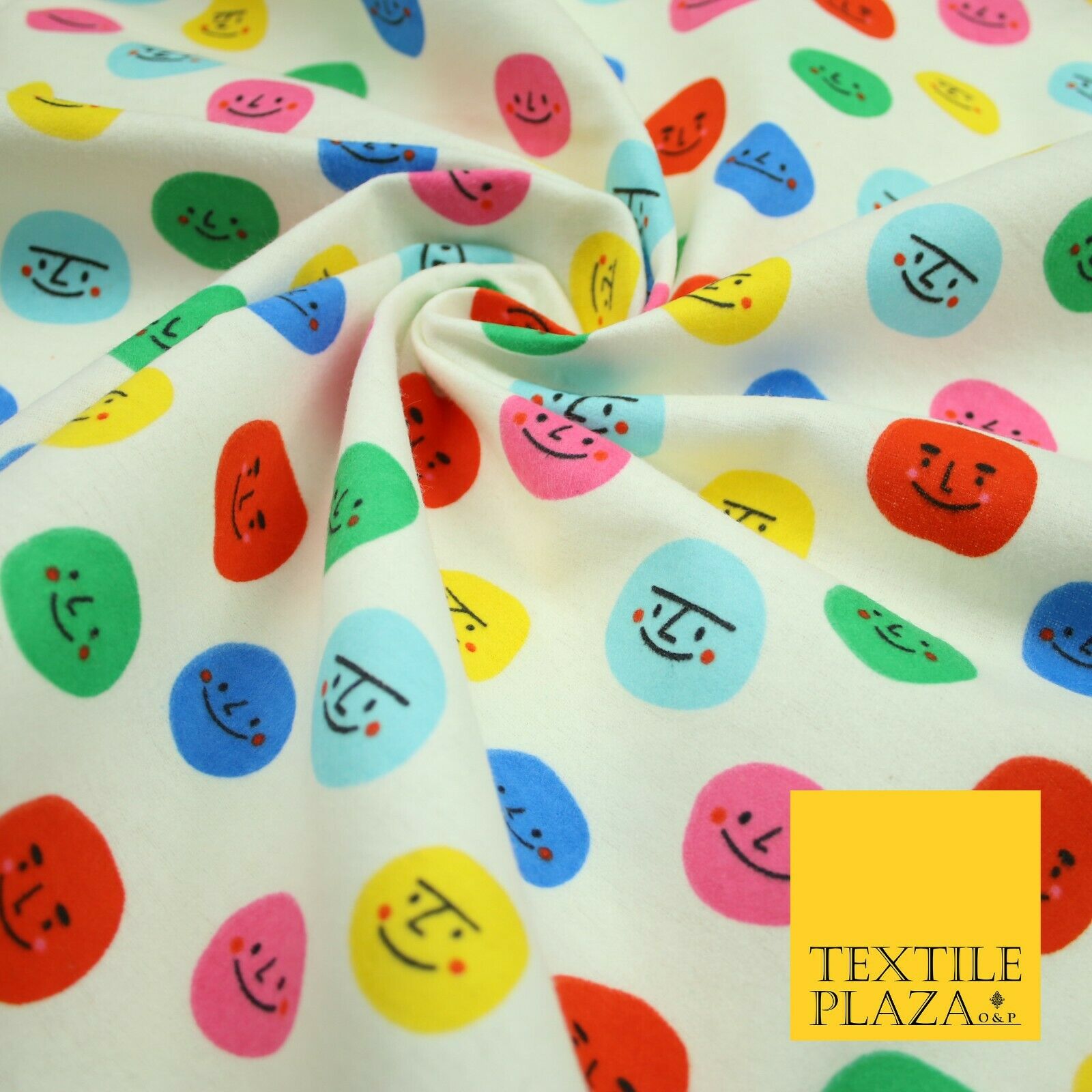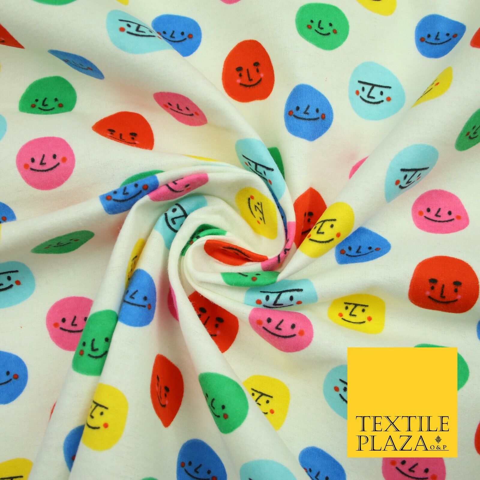 Ivory Colourful Smiley Faces Brushed Polycotton Winceyette Printed Fabric 7184