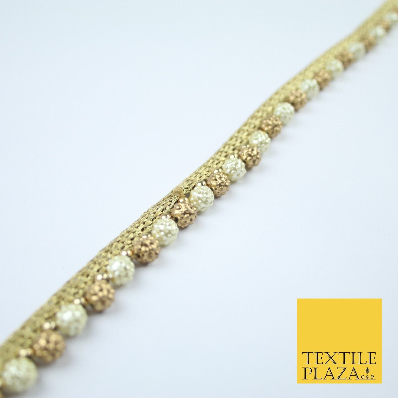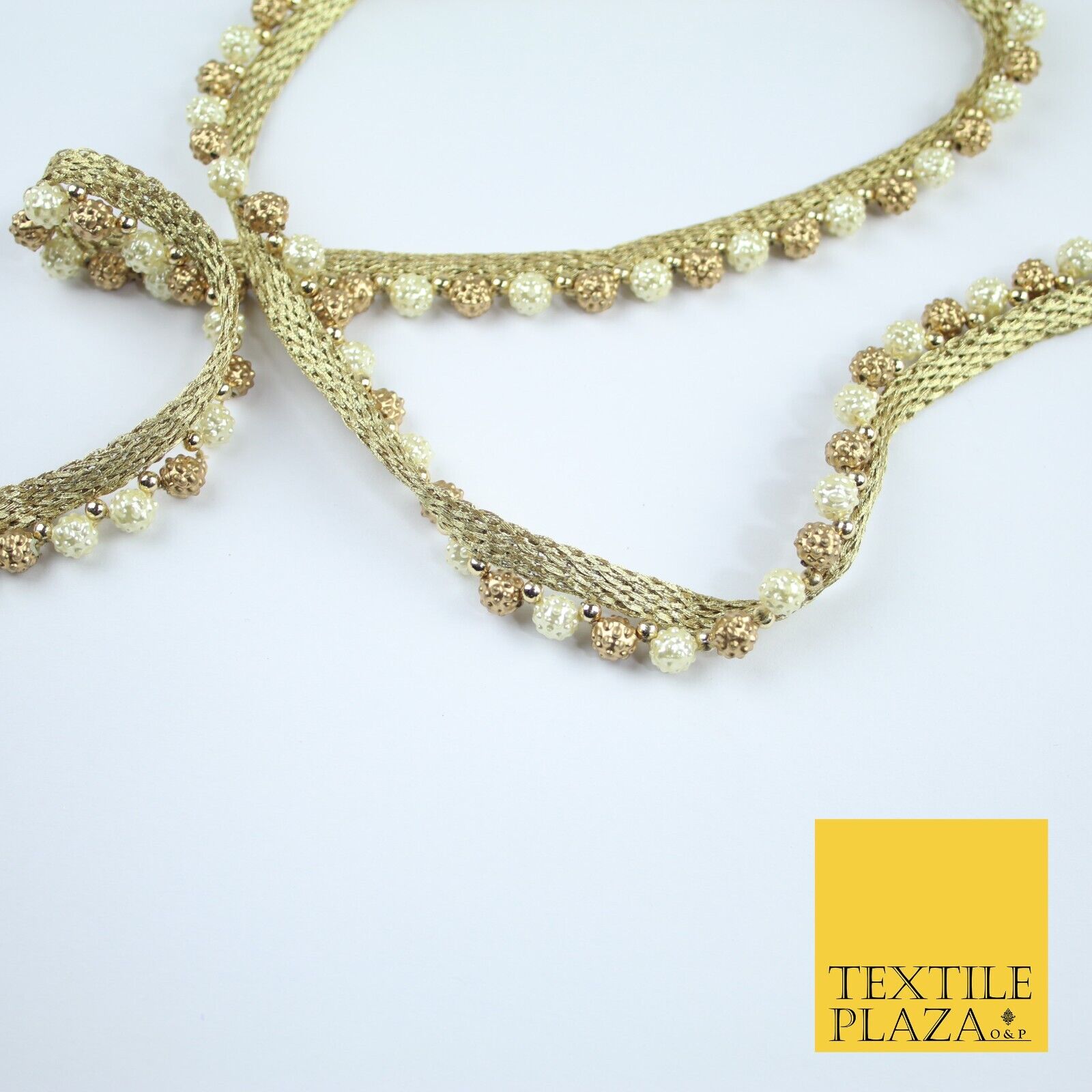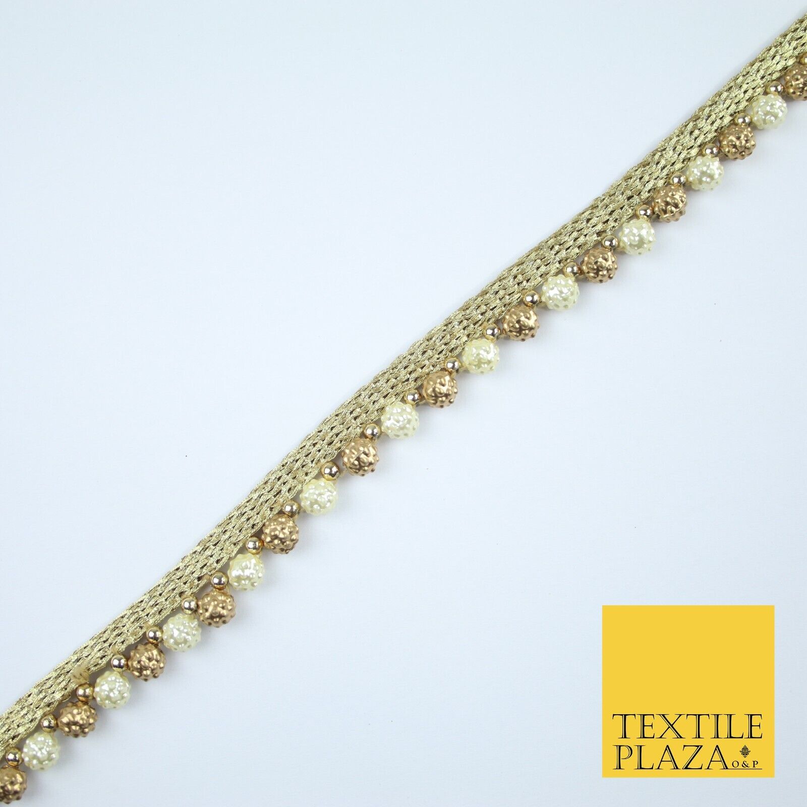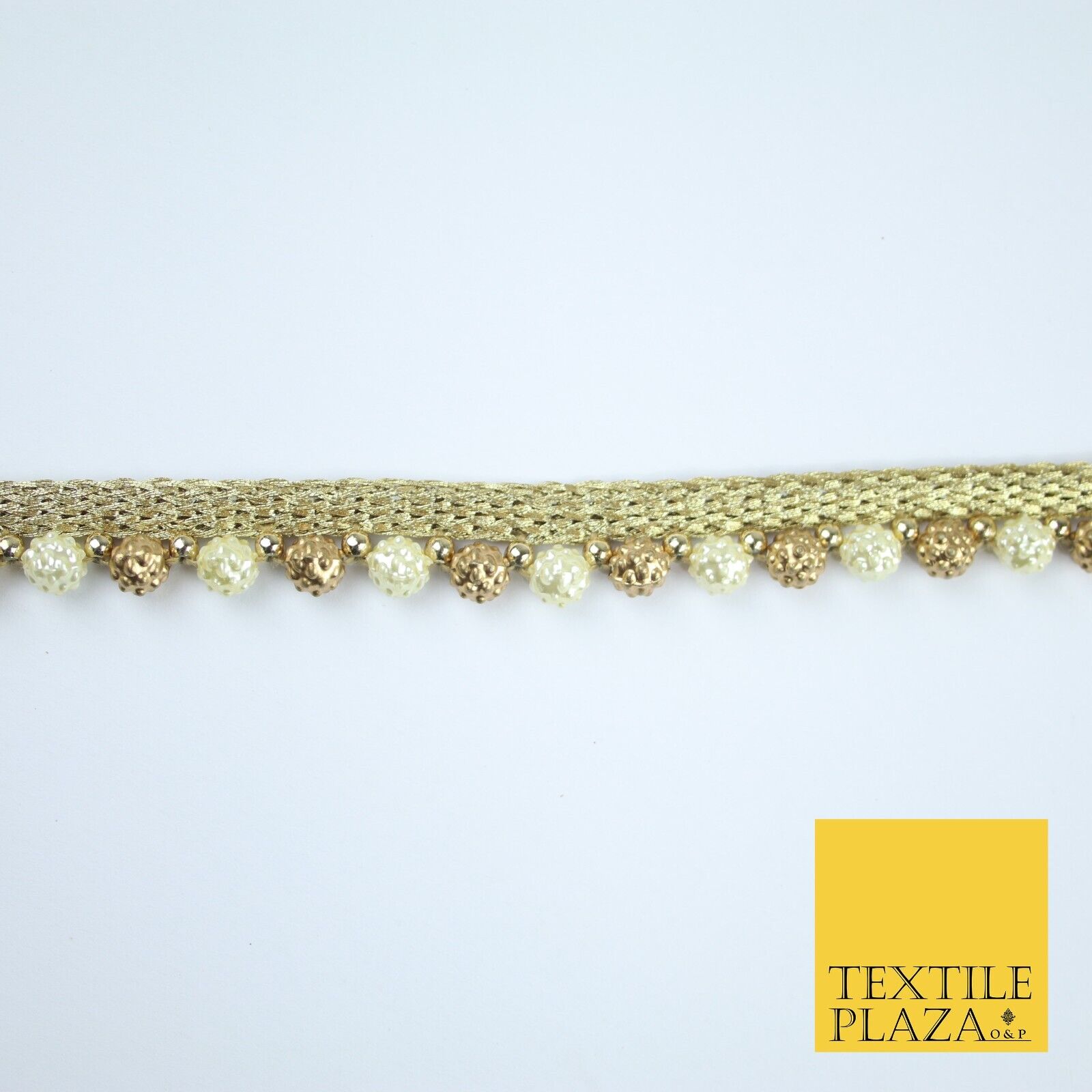 Ivory Cream / Antique Gold Textured Pearl Beaded Trim Border Gota Lace - X209