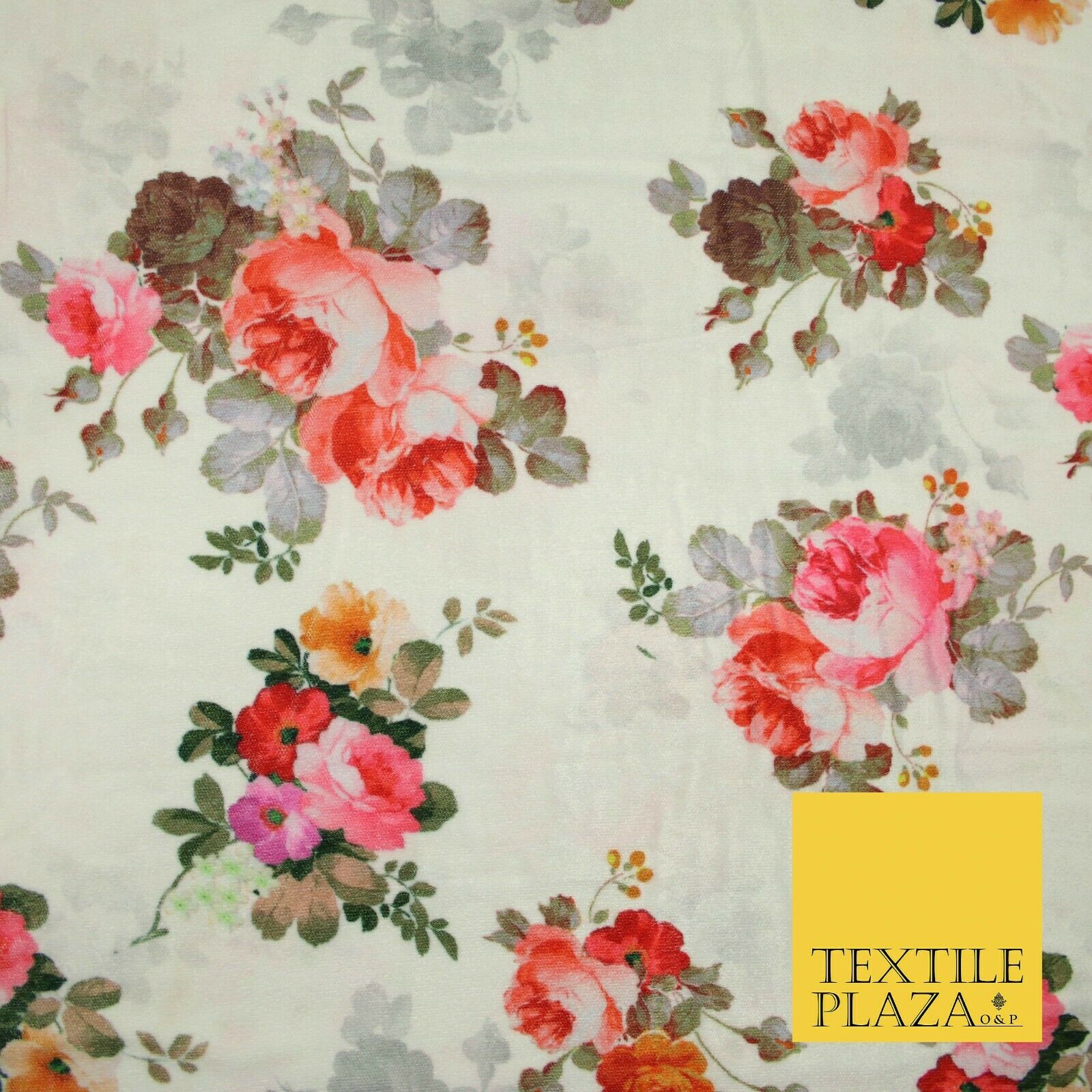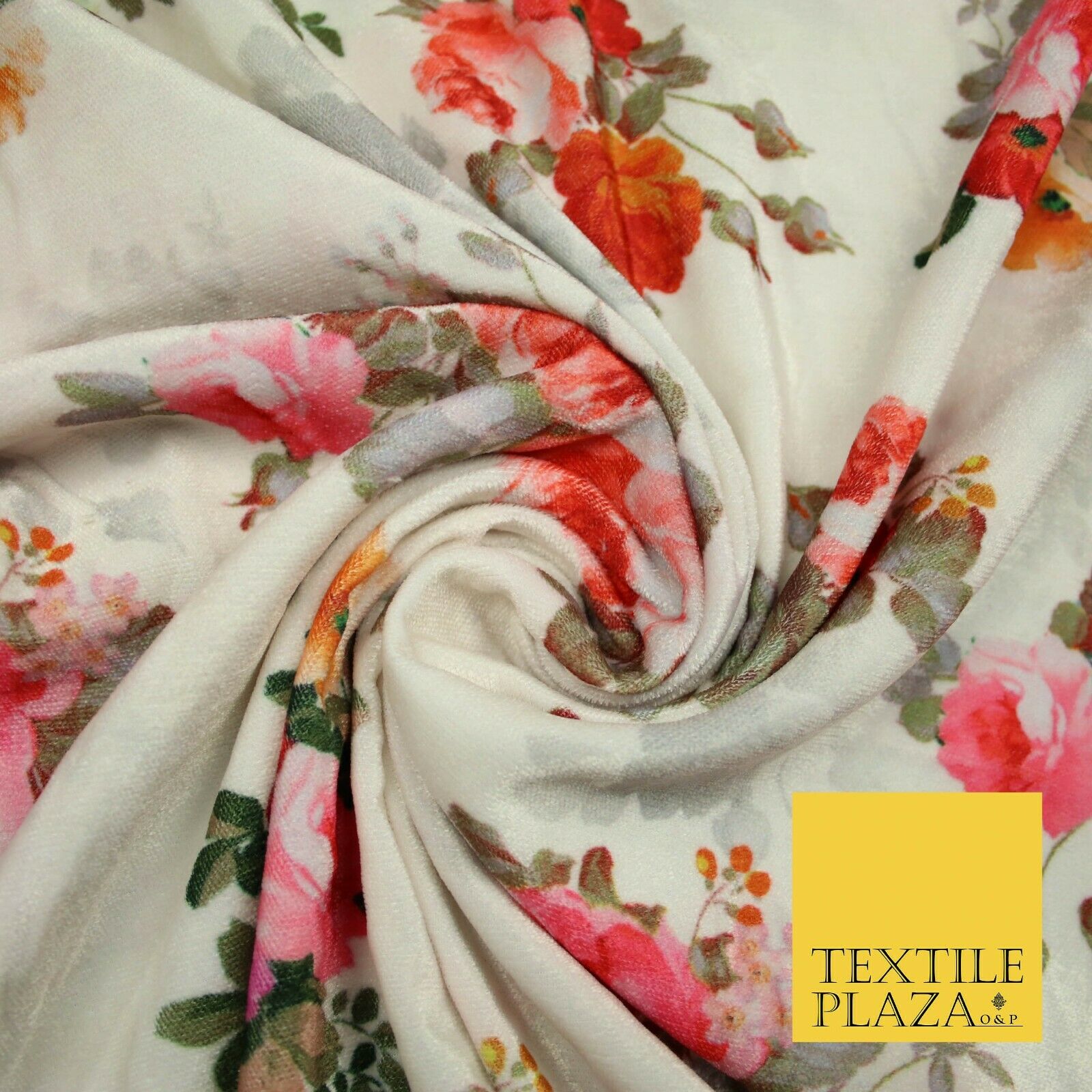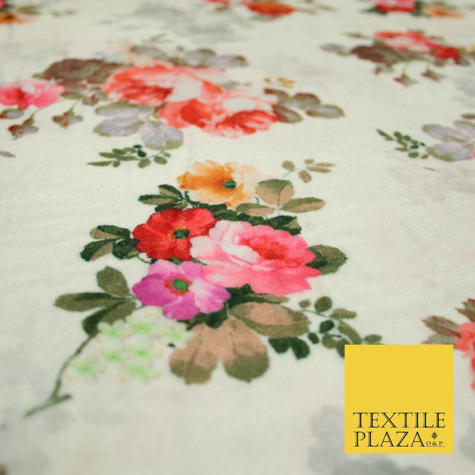 Ivory Cream Floral Printed Soft Micro Velvet Velour Non Stretch Fabric Dress5250