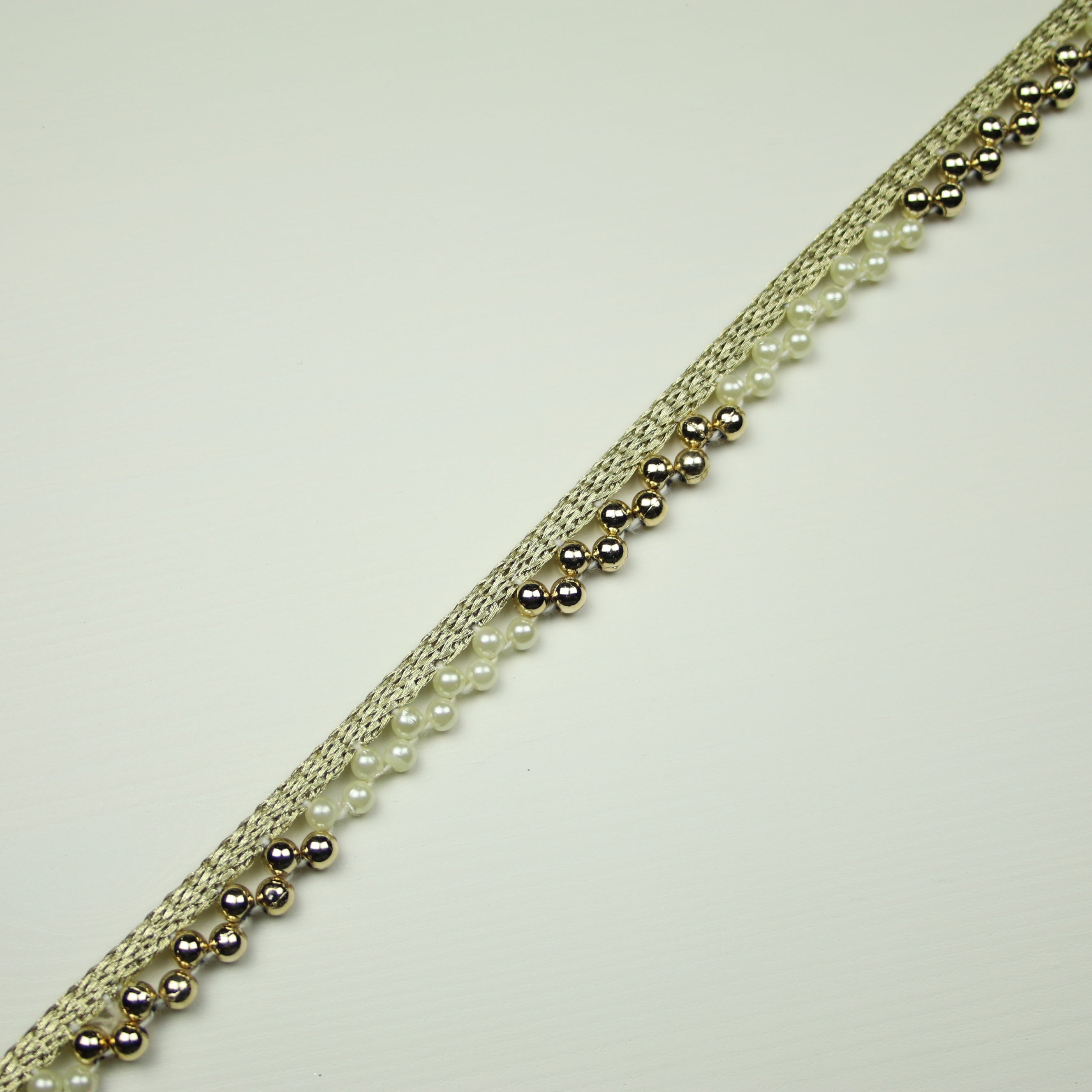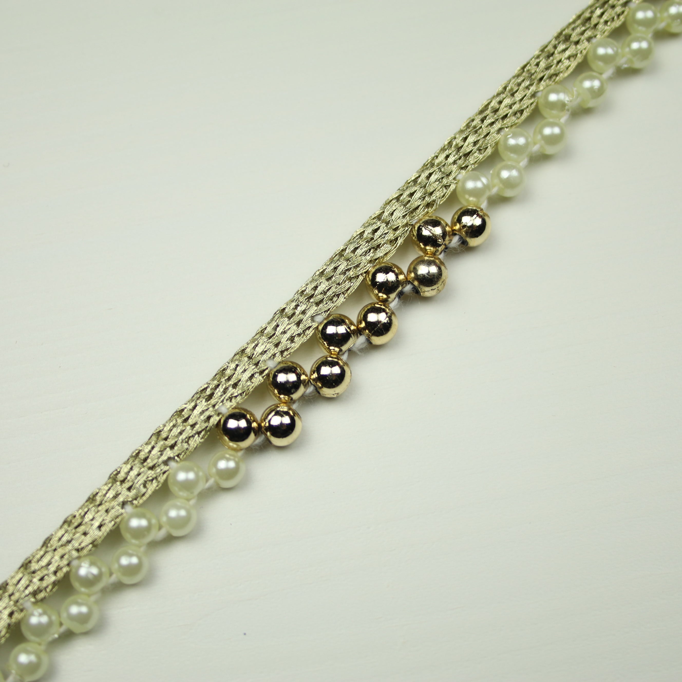 Ivory Gold Chrome Pearl Dashed Beaded Trimming Border Ribbon Gota Trim X406