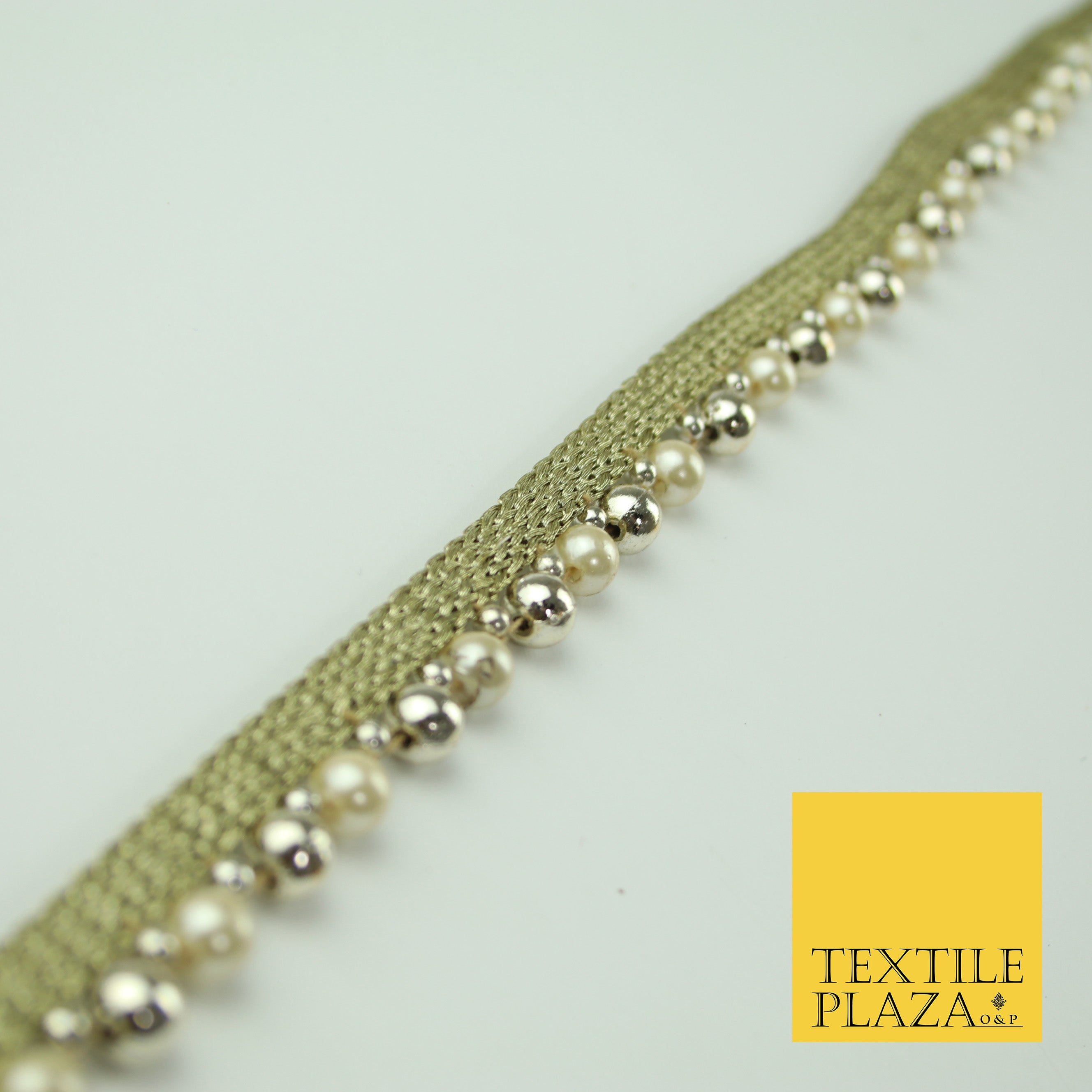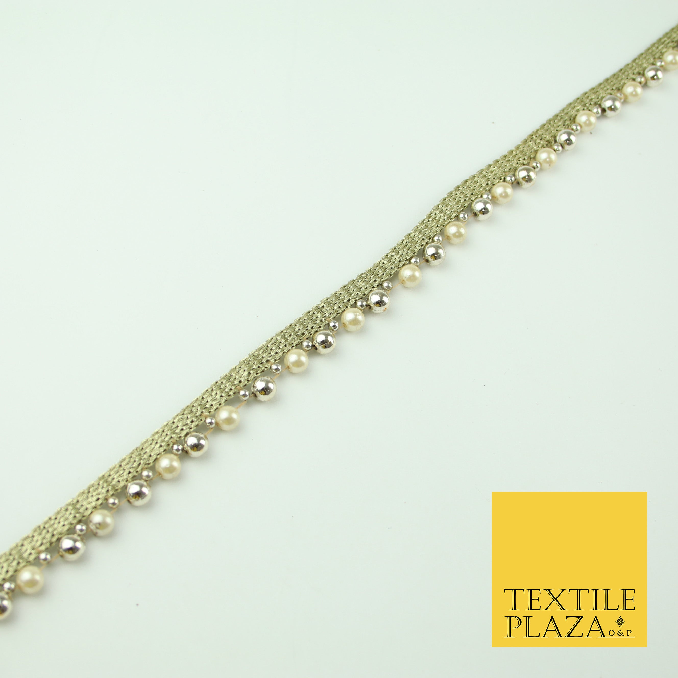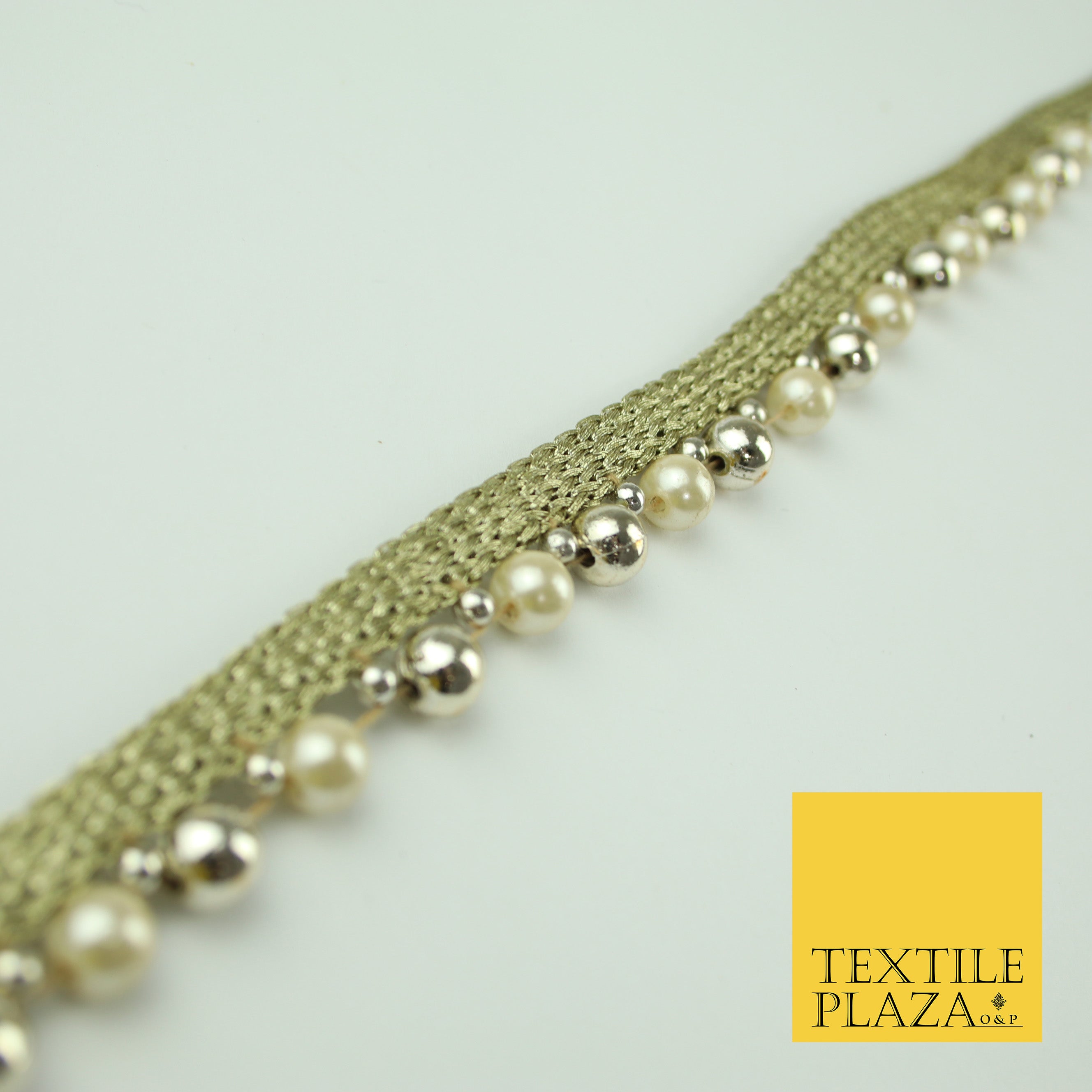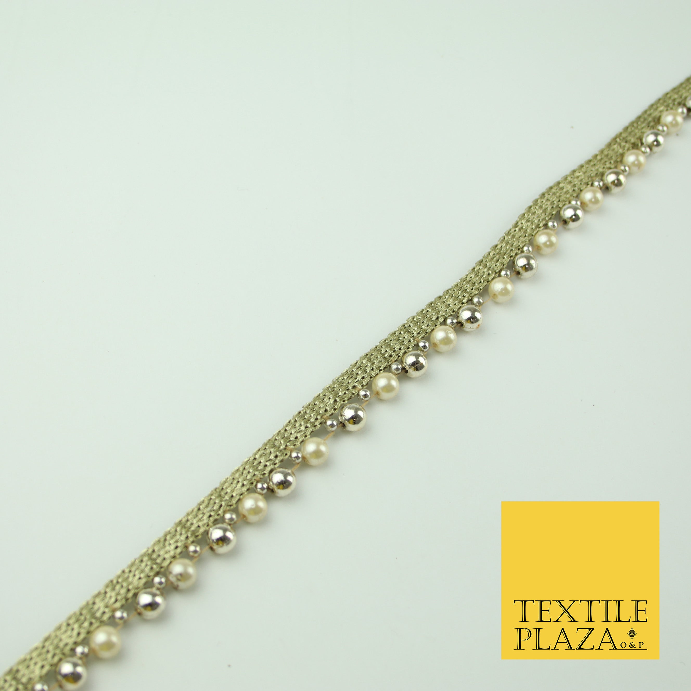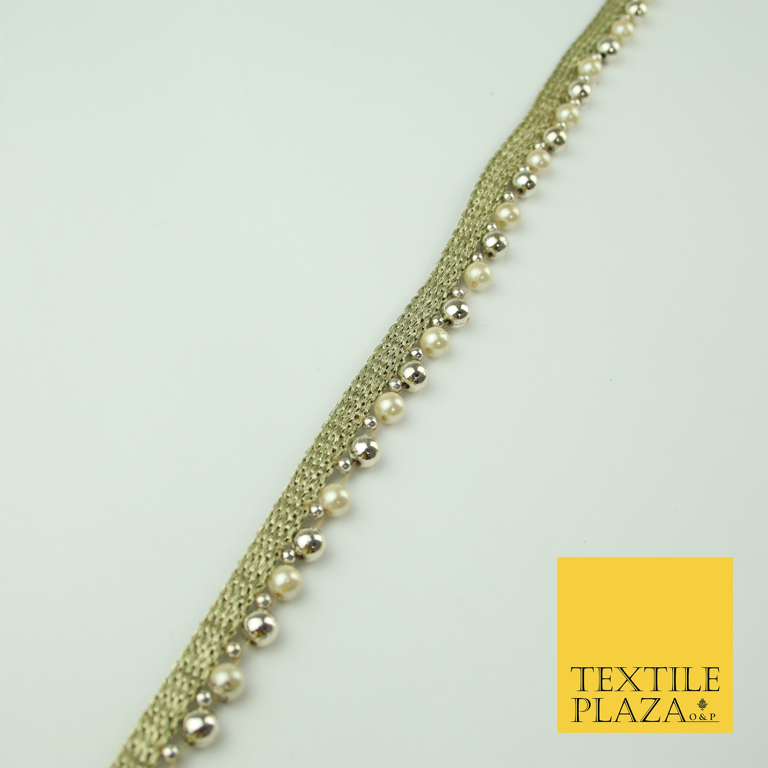 Ivory White Gold Mini Chrome Pearl Beaded Ribbon Trim Border Indian Lace X331