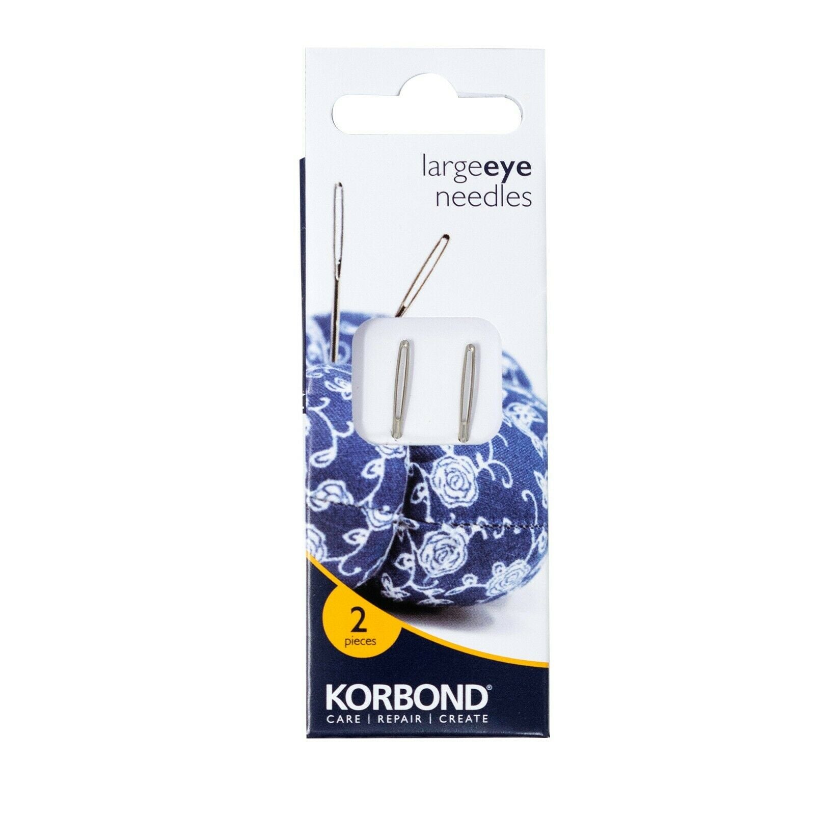 Korbond Large Eye Needle pack contains a Tapestry and a Chenille Needle. Extra-long eyes on the Tapestry needle make it easier to thread floss and yarn, whilst the blunt point enables the needle to move smoothly between the weave of canvas, or fabric separating to ensure no splits. The Chenille Needle similarly has a large, long eye but sharp point to penetrate closely woven fabrics.