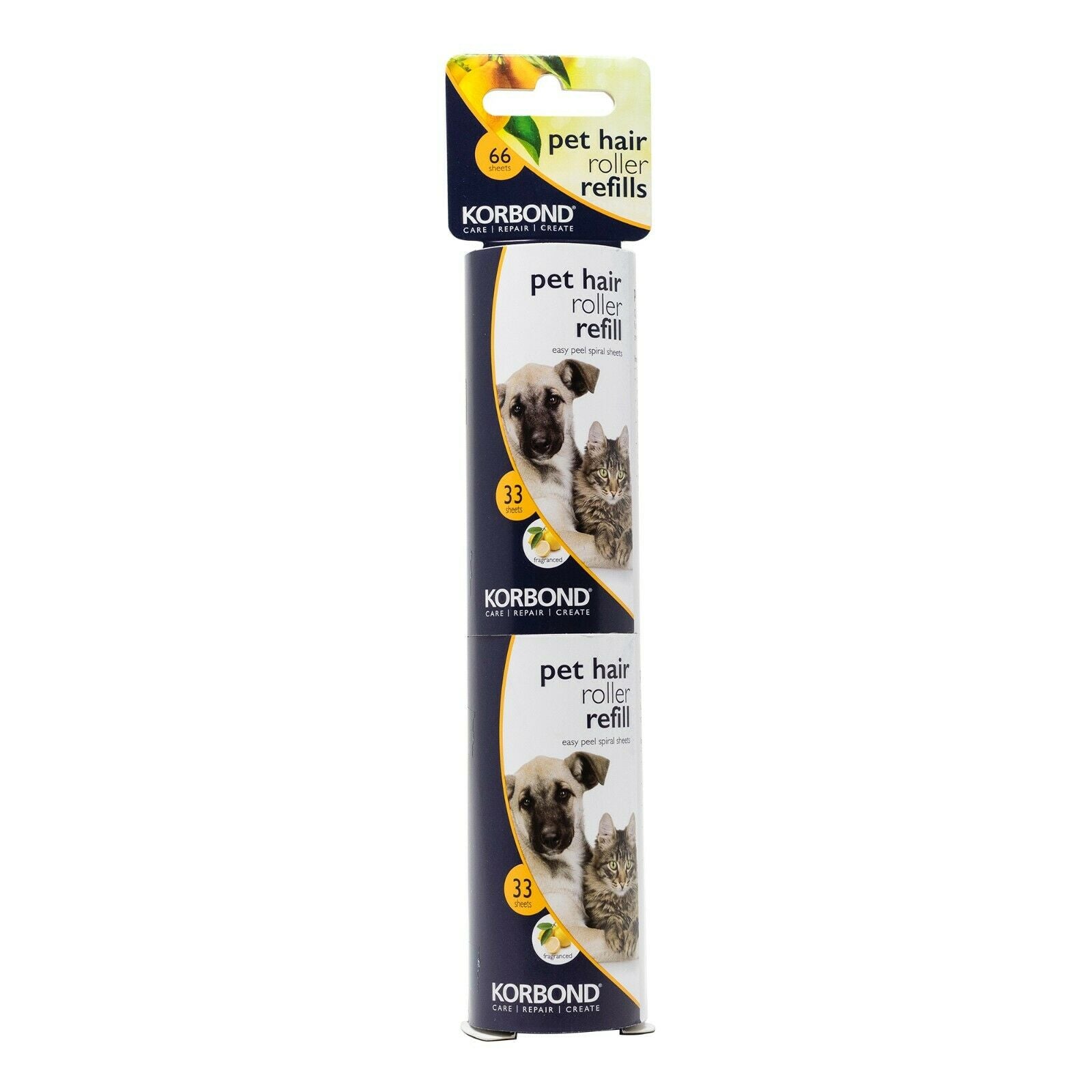KORBOND Pet Hair Sticky Roller REFILLS 2 x 33 Sheets Lightly Scented 110721