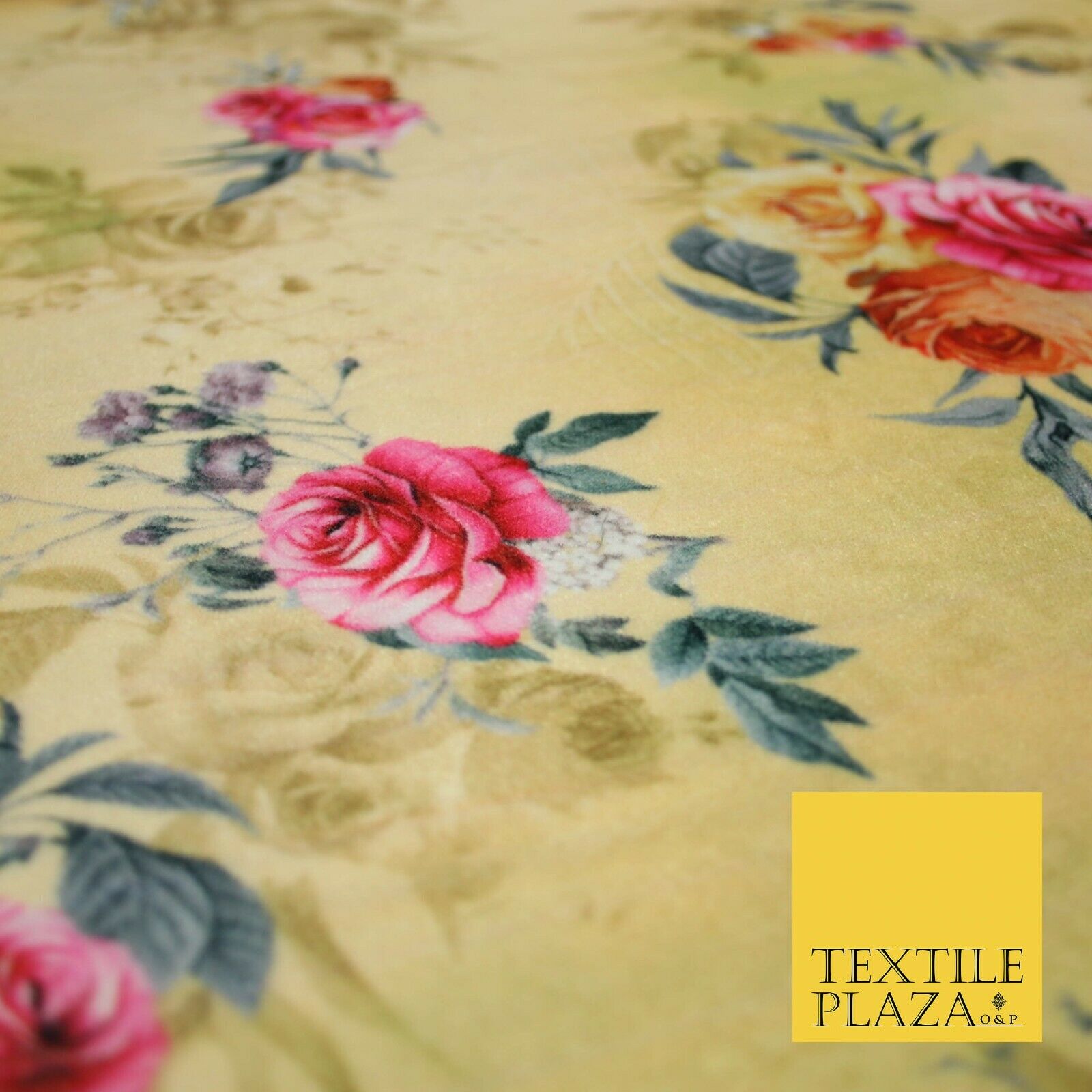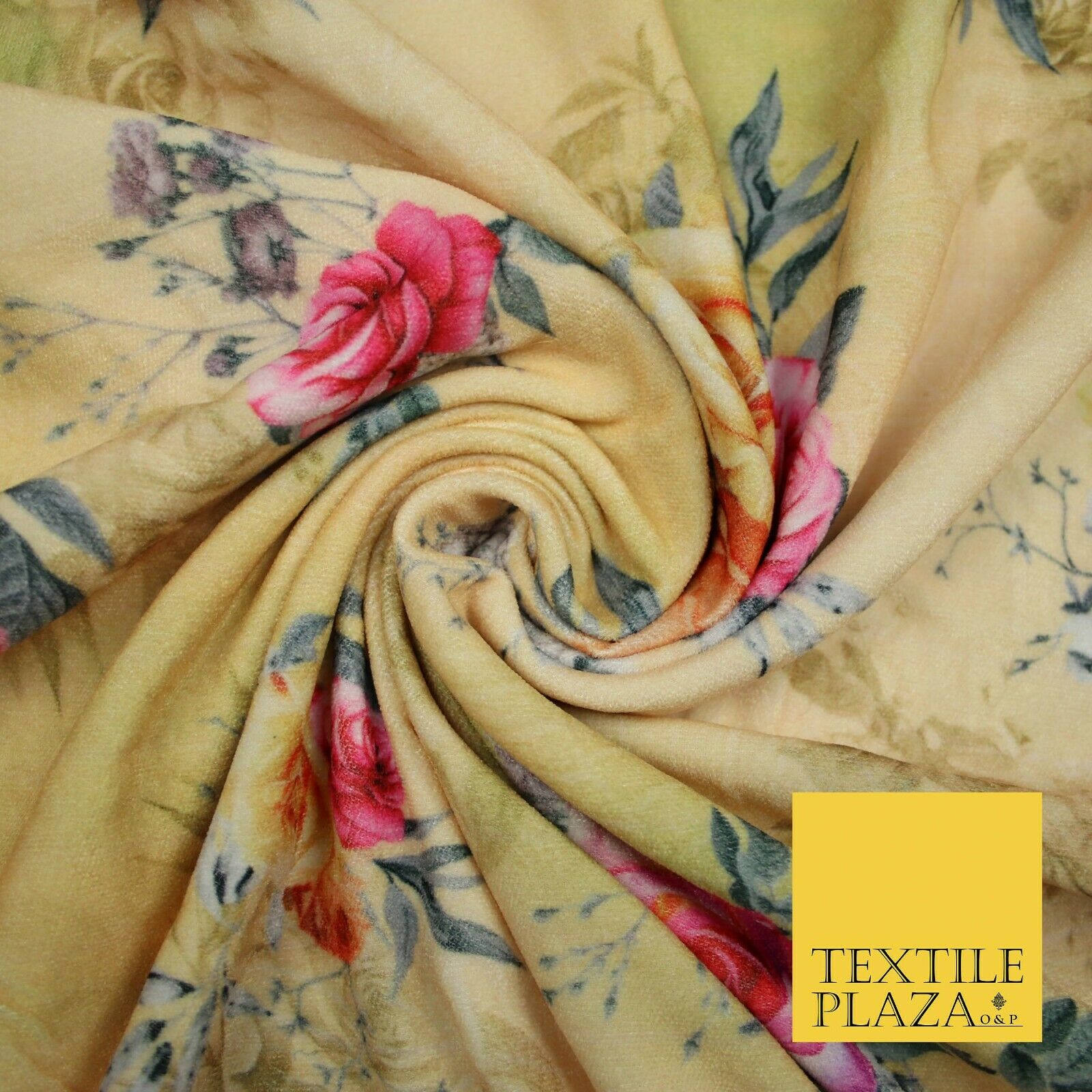 Lemon Gold Floral Printed Soft Micro Velvet Velour Non Stretch Fabric Dress 5246