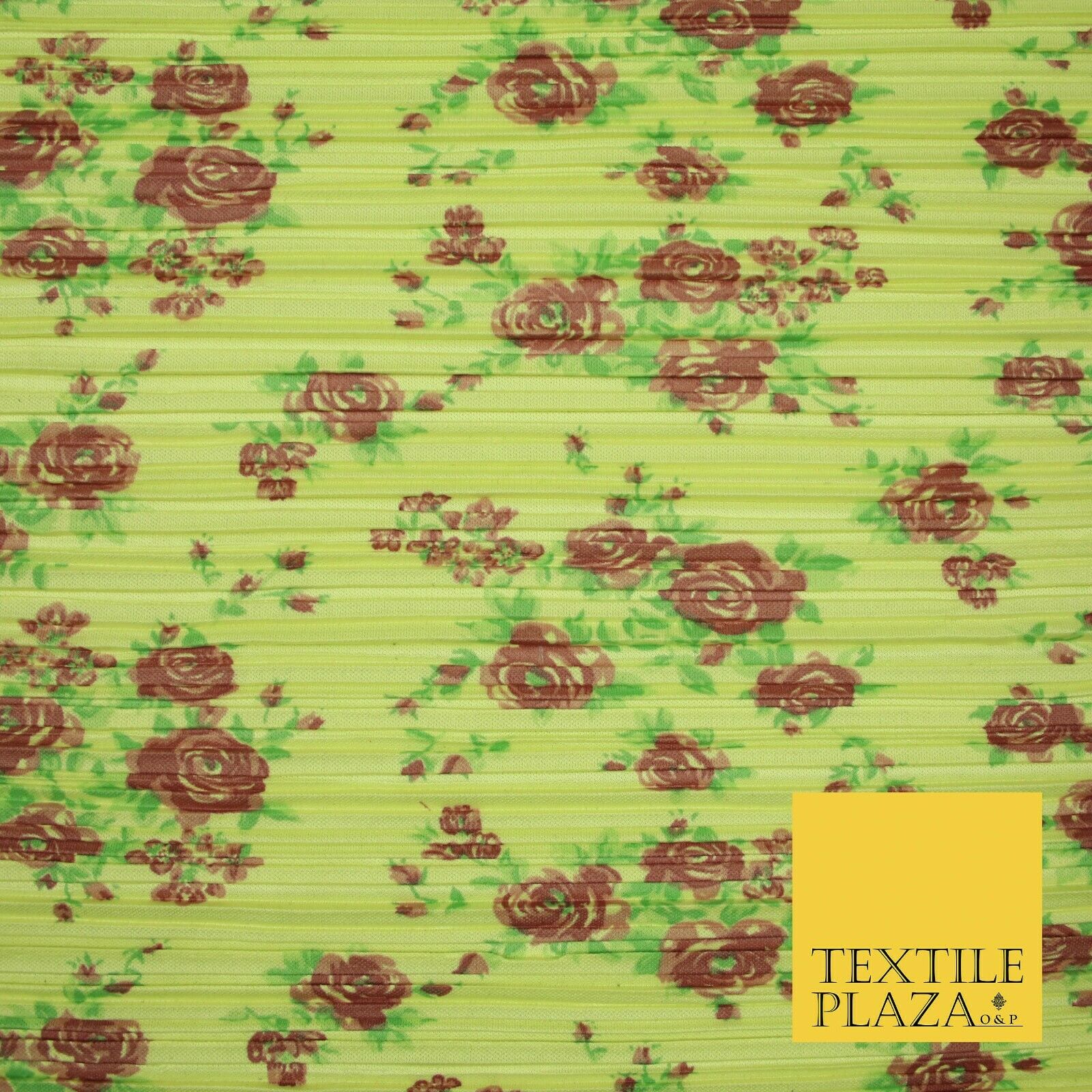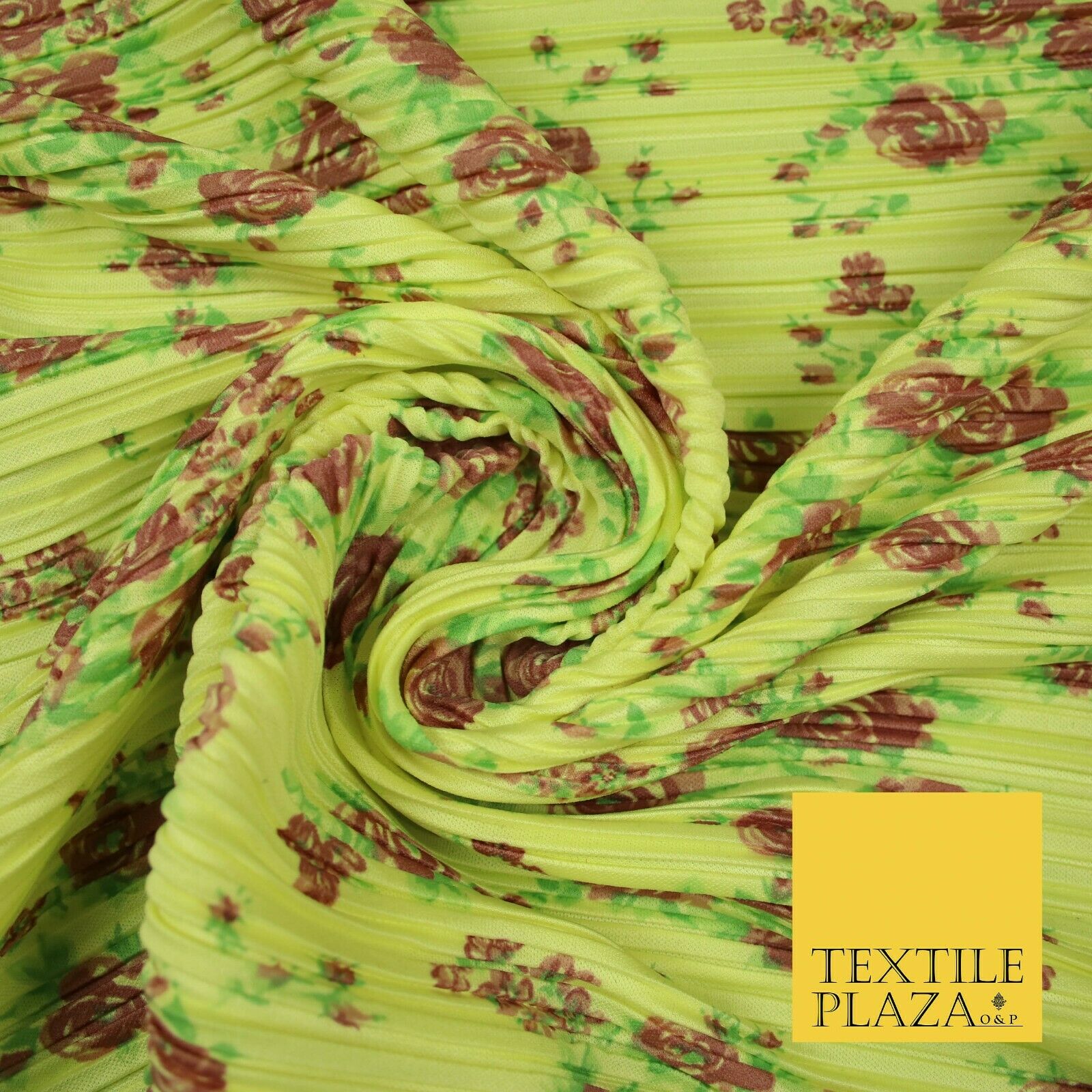 Lemon Yellow Floral Rose Cluster Printed Pleated Plisse Jersey Dress Fabric 5400