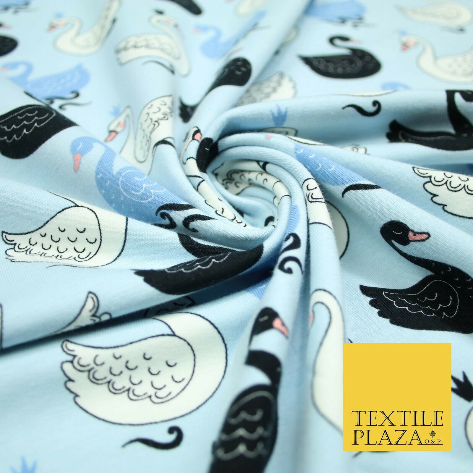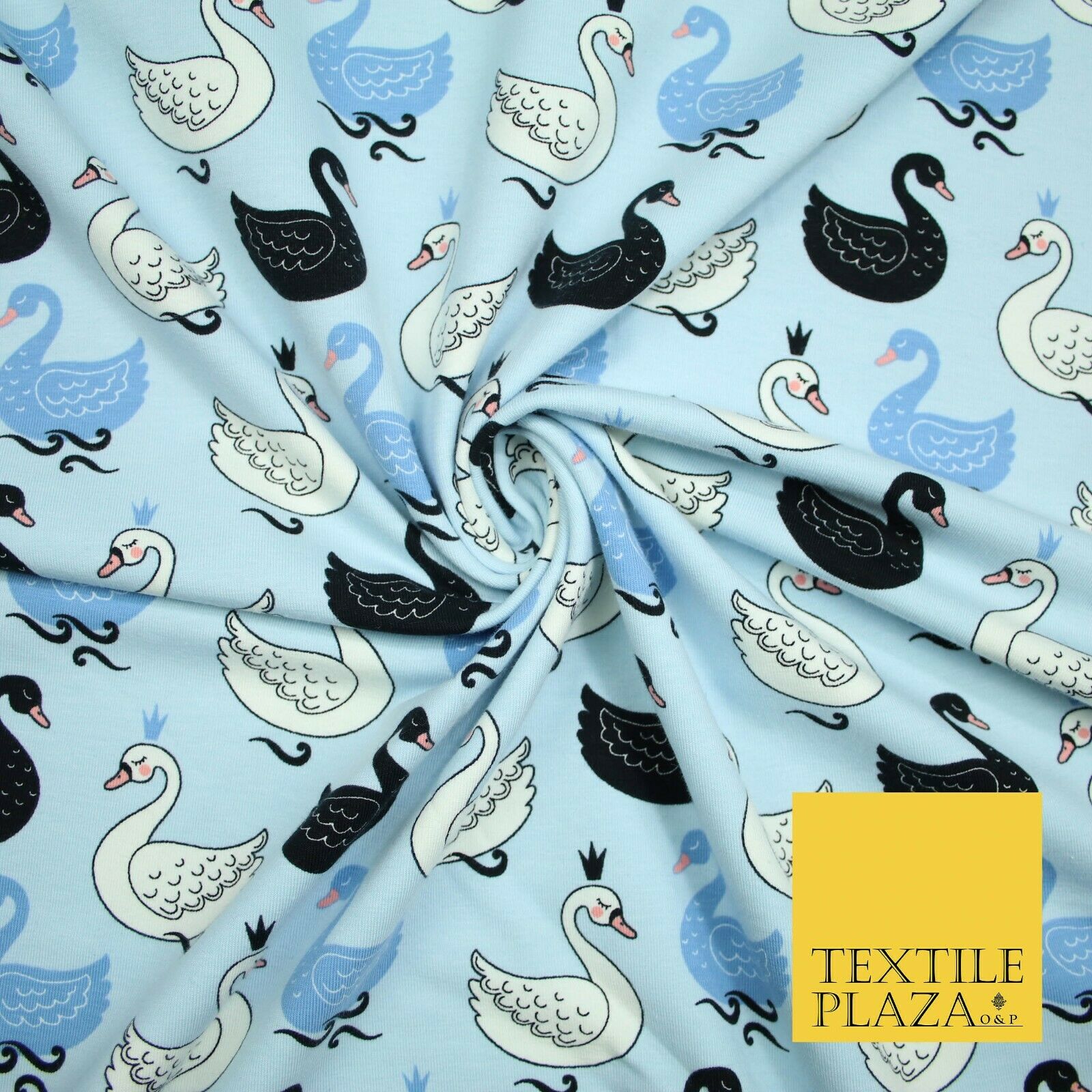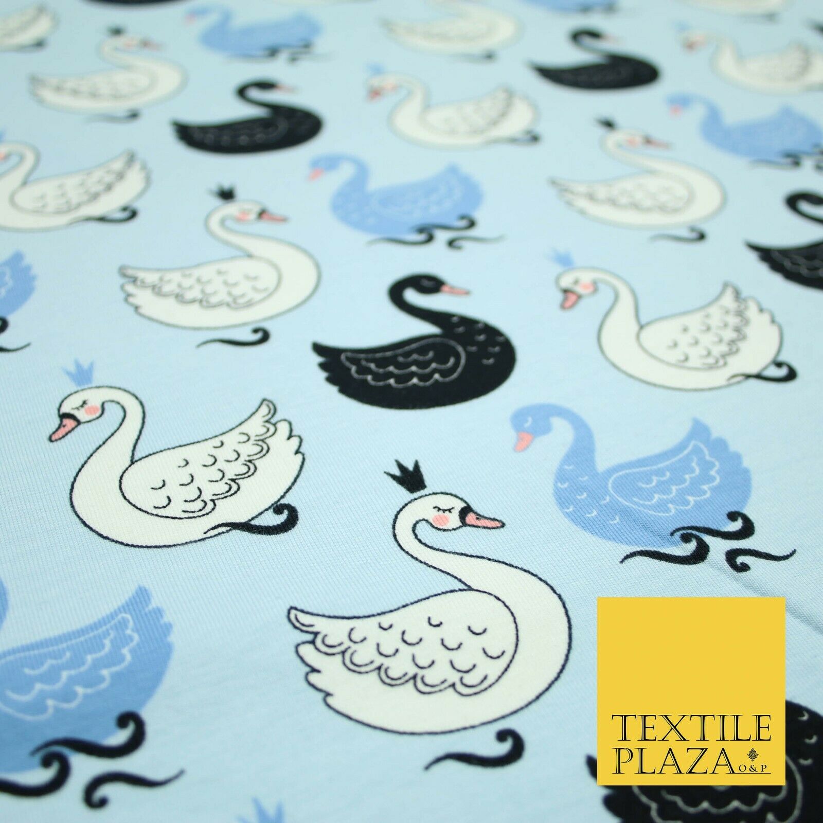 Light Blue Elegant Swan Birds Printed Soft Cotton Jersey Stretch Fabric 59" 4980