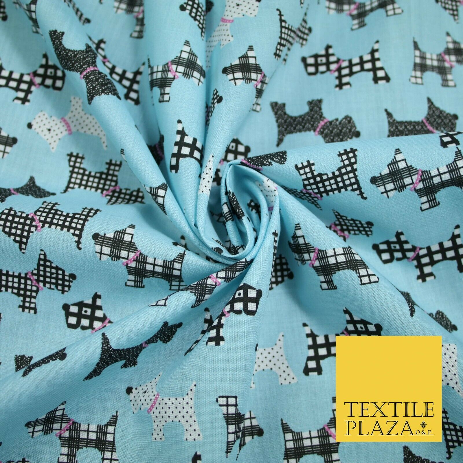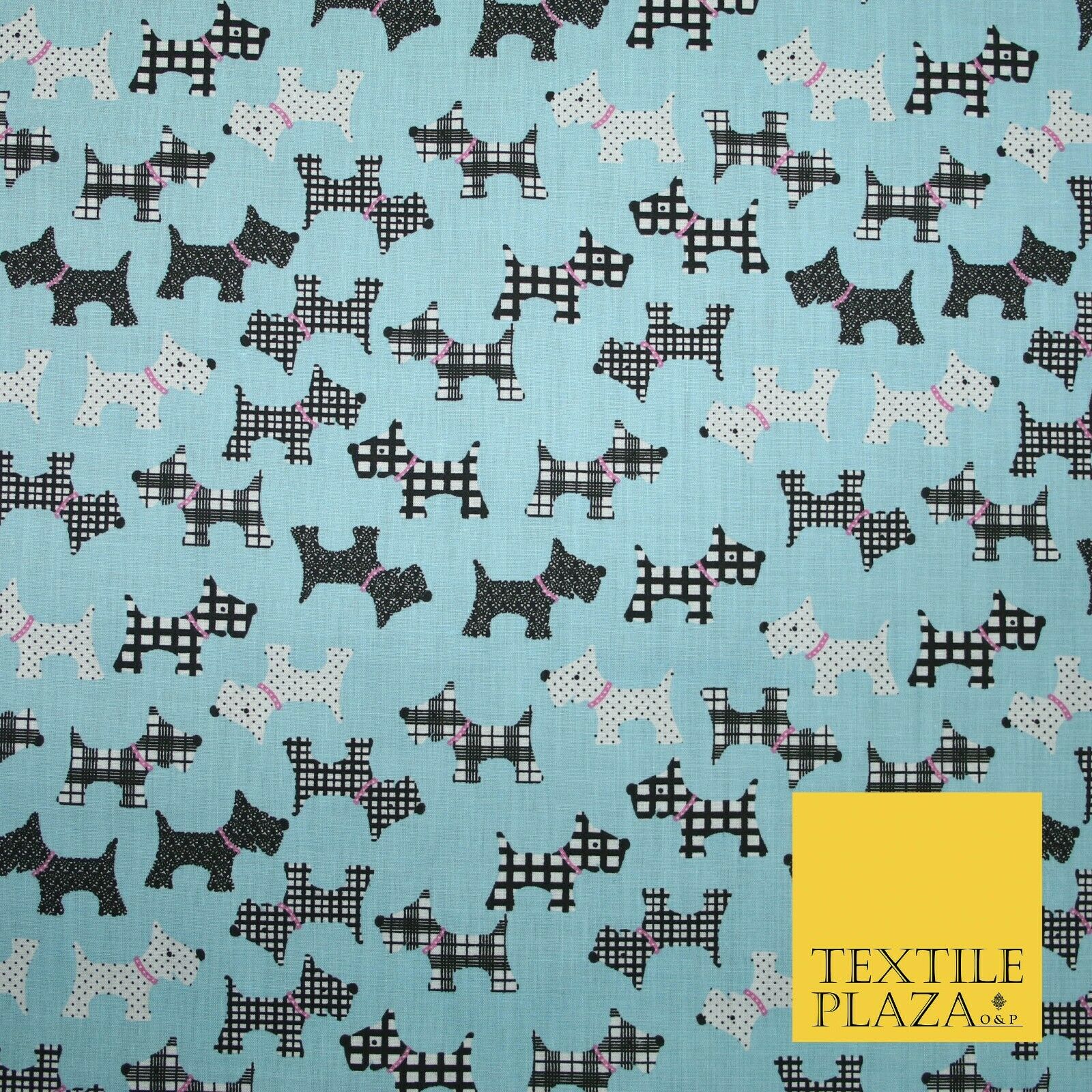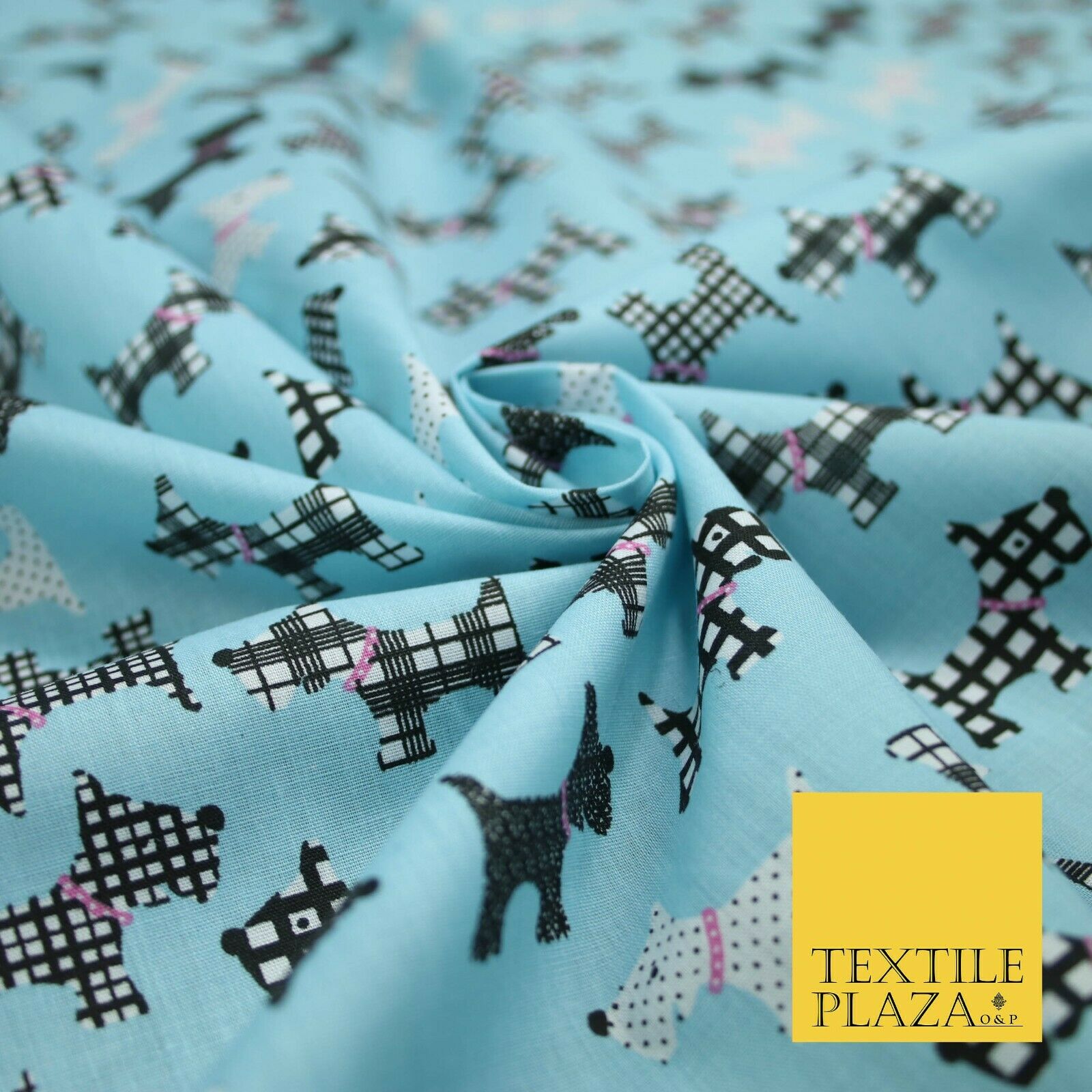 Light Blue Tartan Scottie Dog Patch Printed Poly Cotton Fabric Polycotton 5020