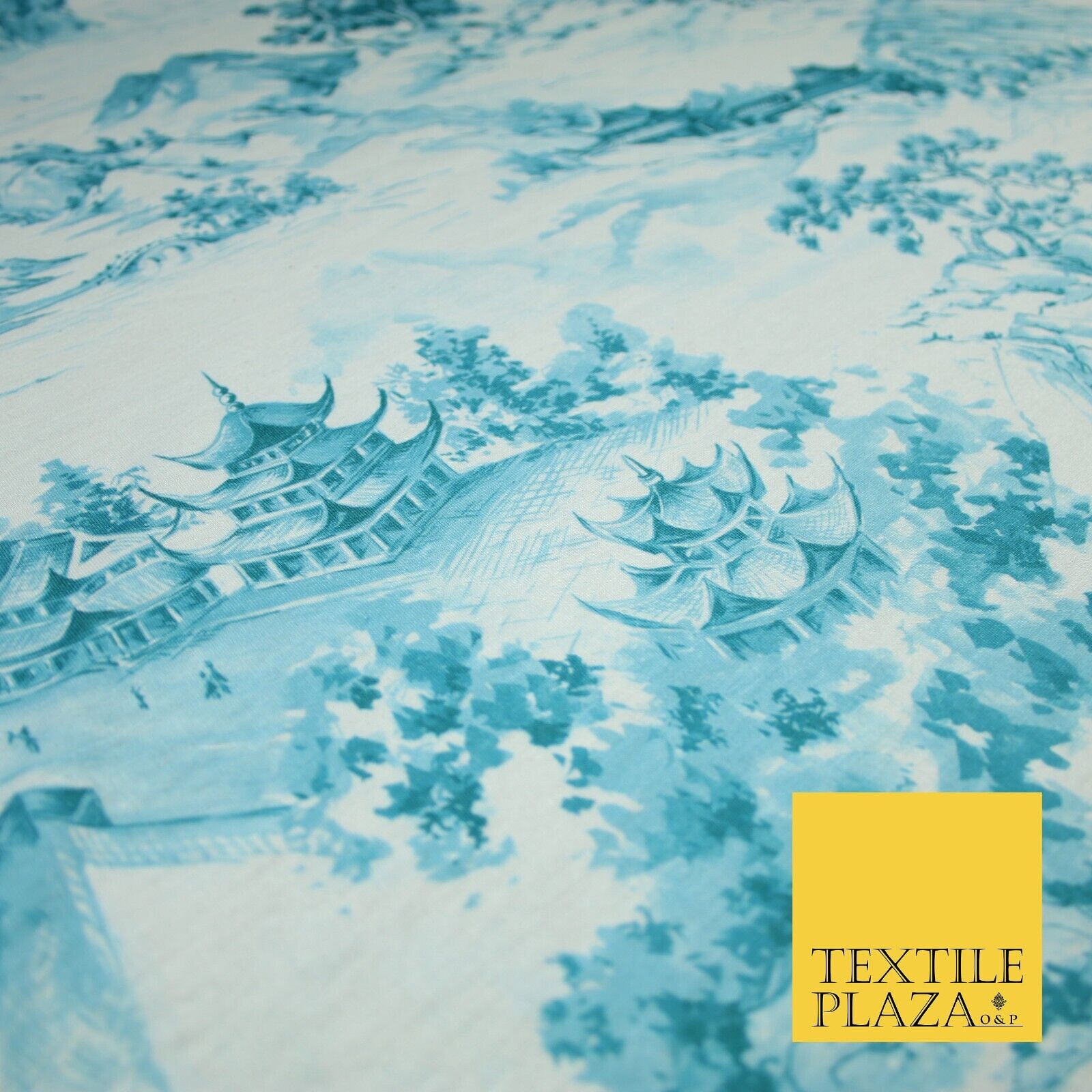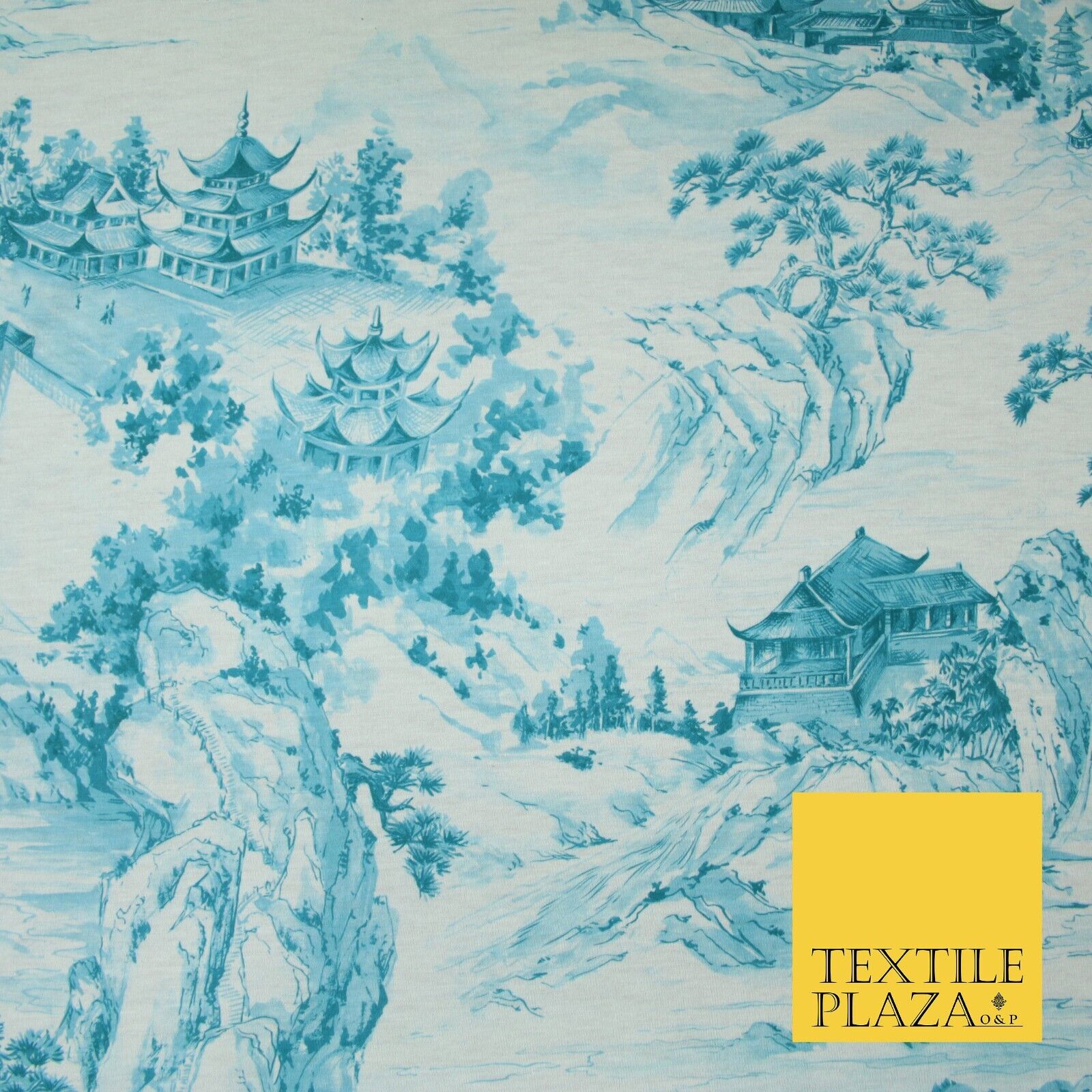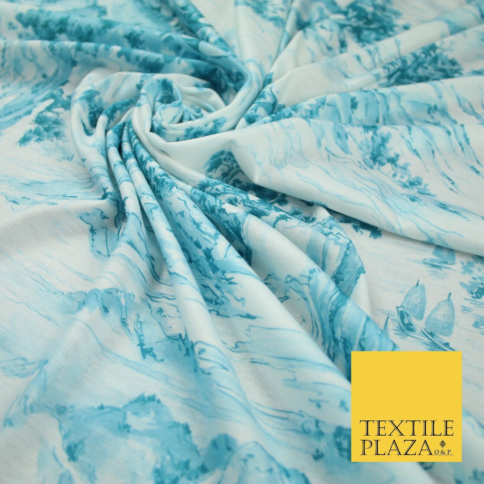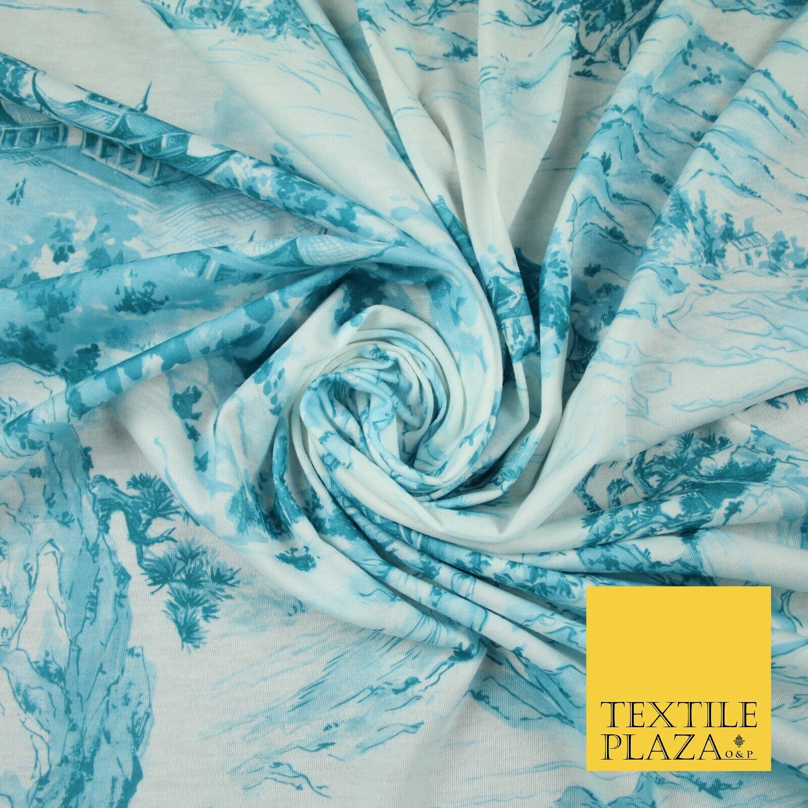 Light Blue with Off White Oriental Landscape Print Stretch Jersey Fabric 56"6651