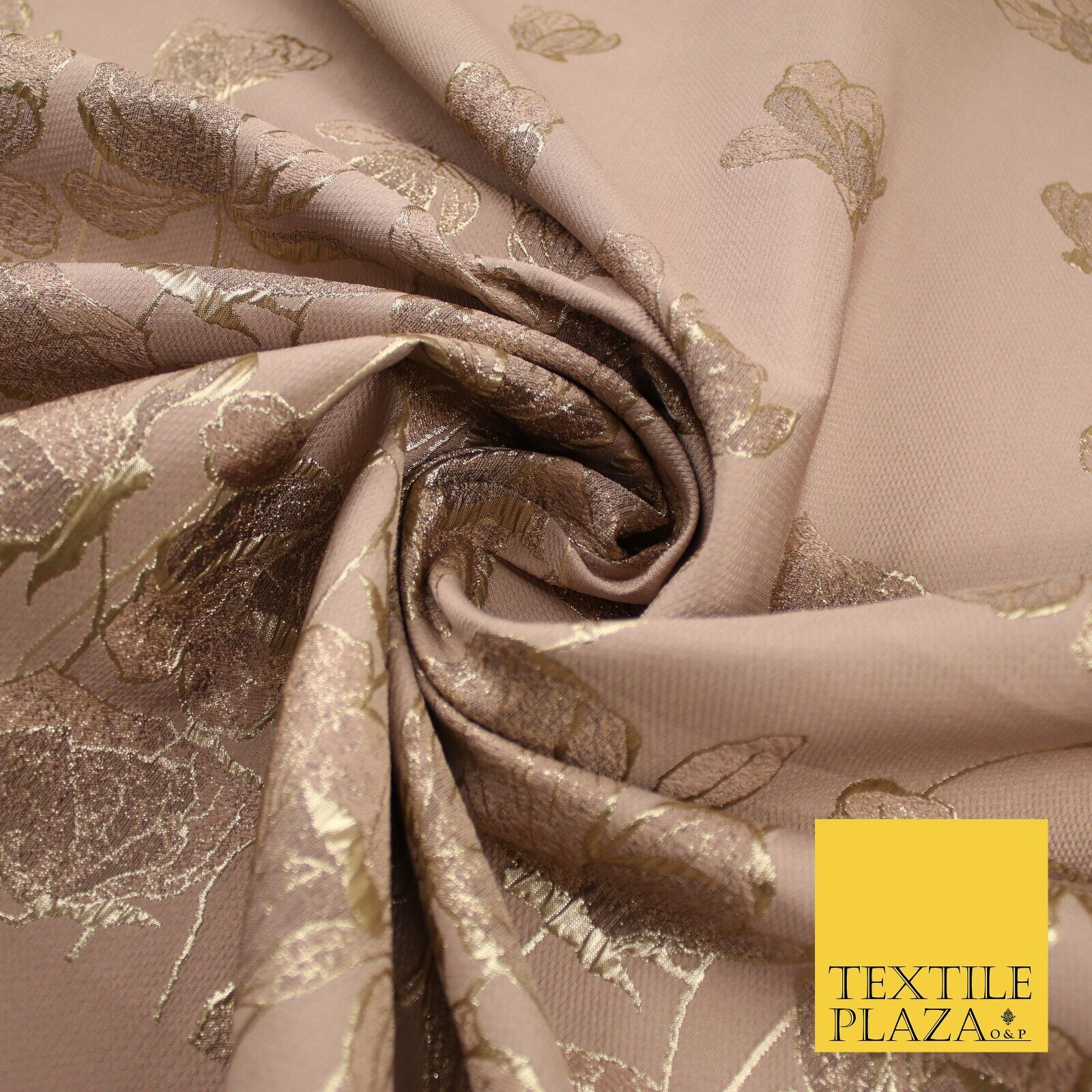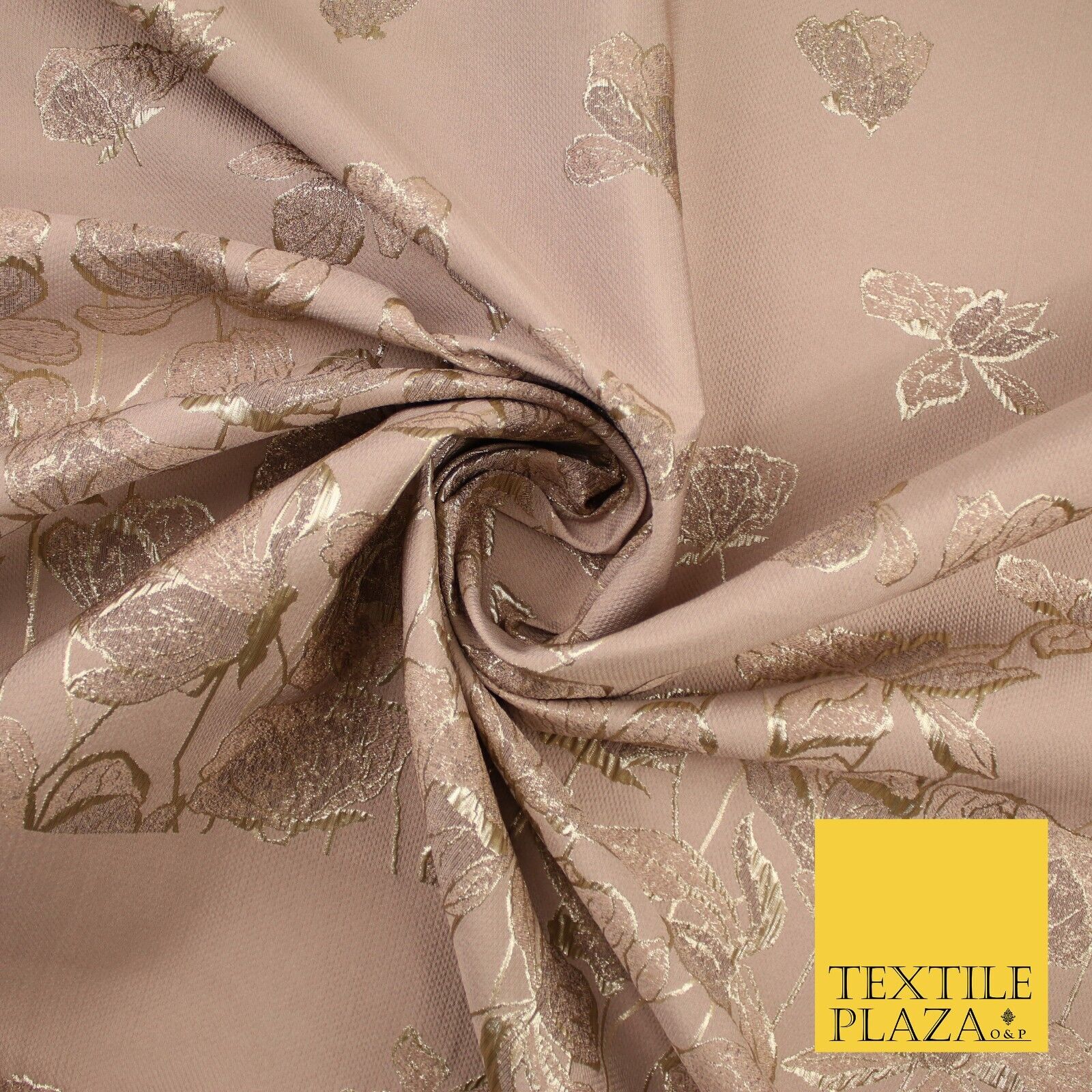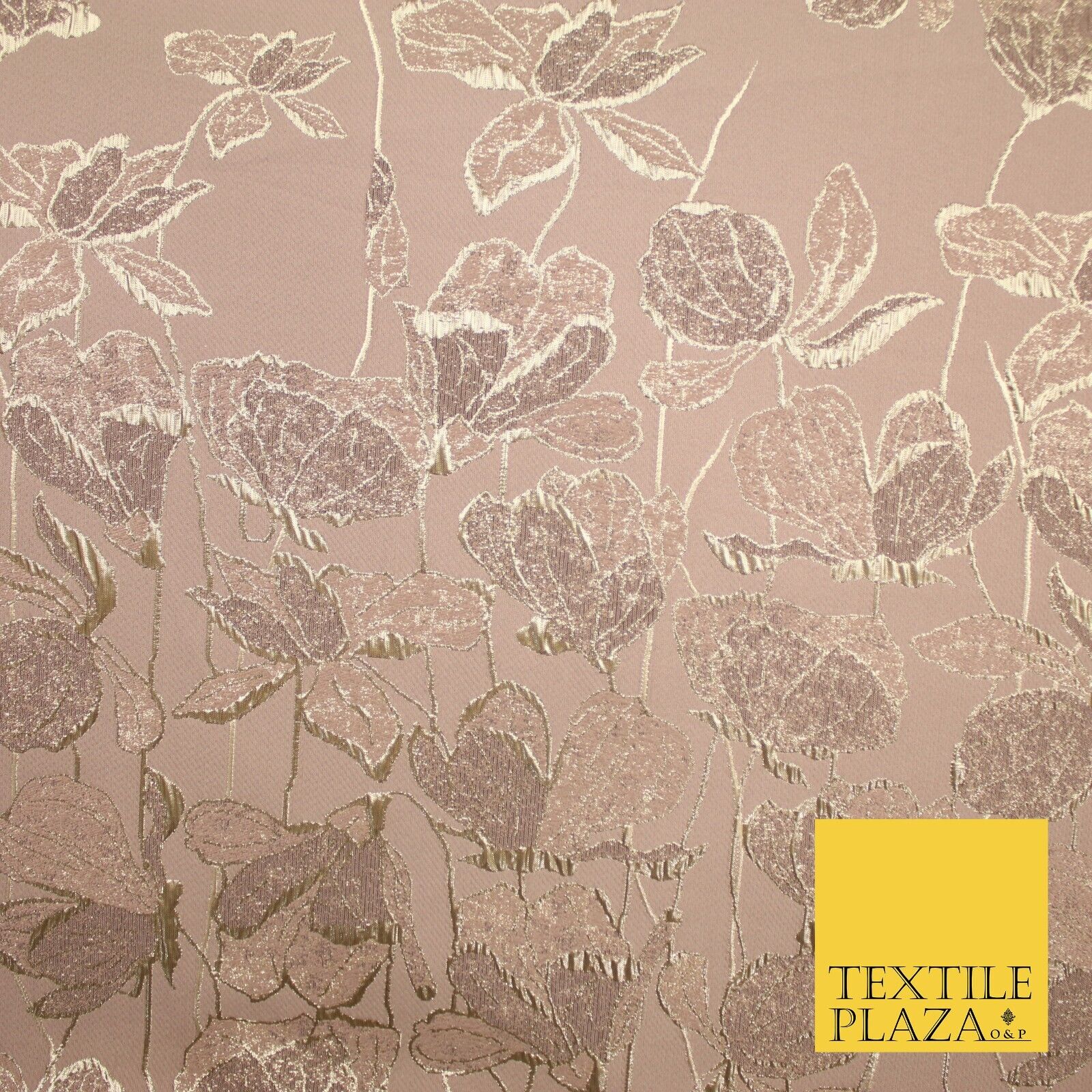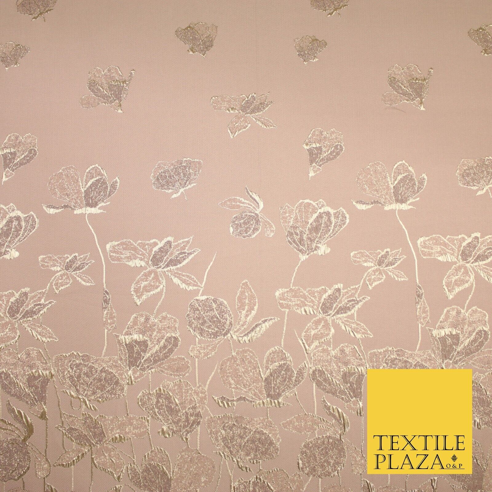 Light Peach Gold Falling Floral Border Metallic Textured Brocade Fabric 8513