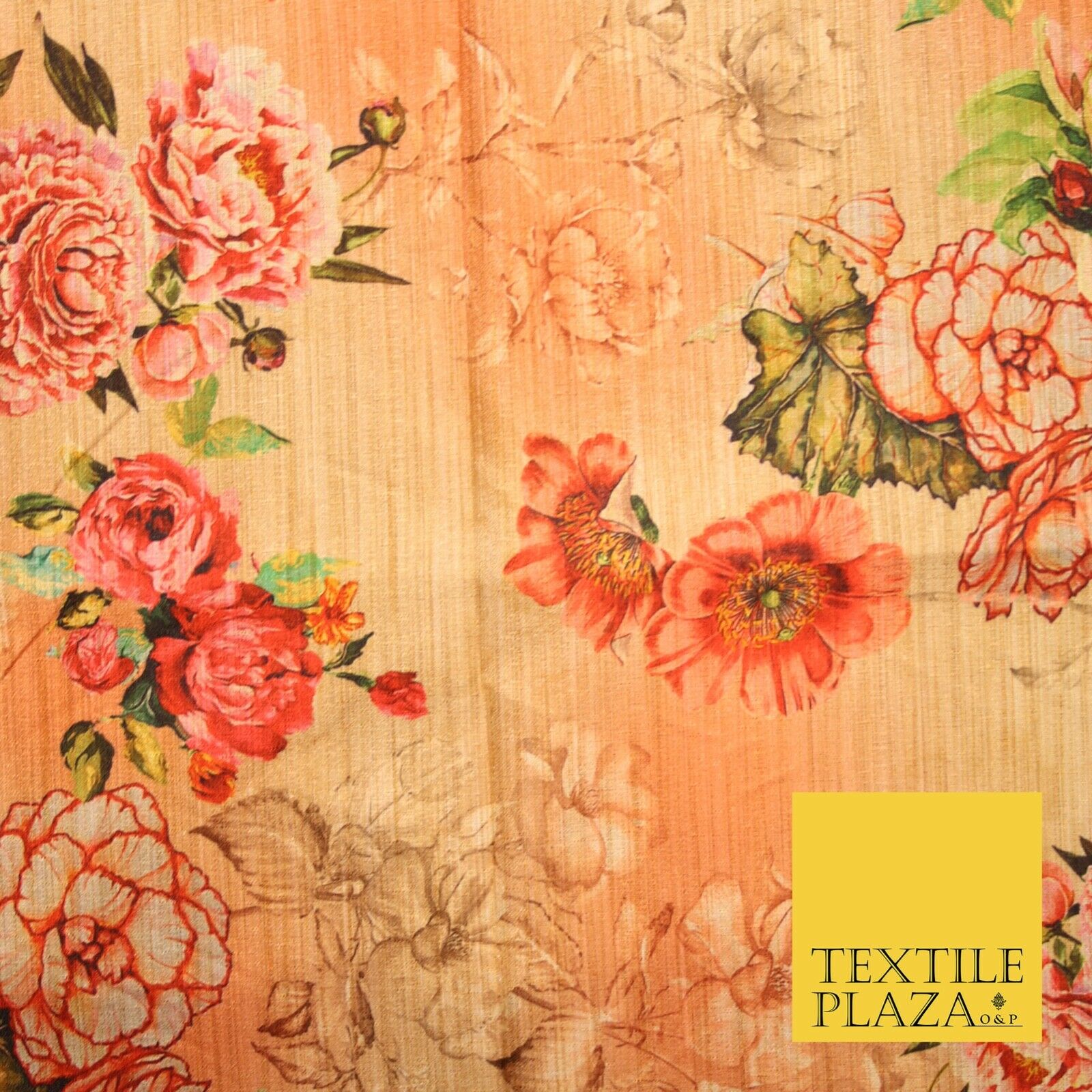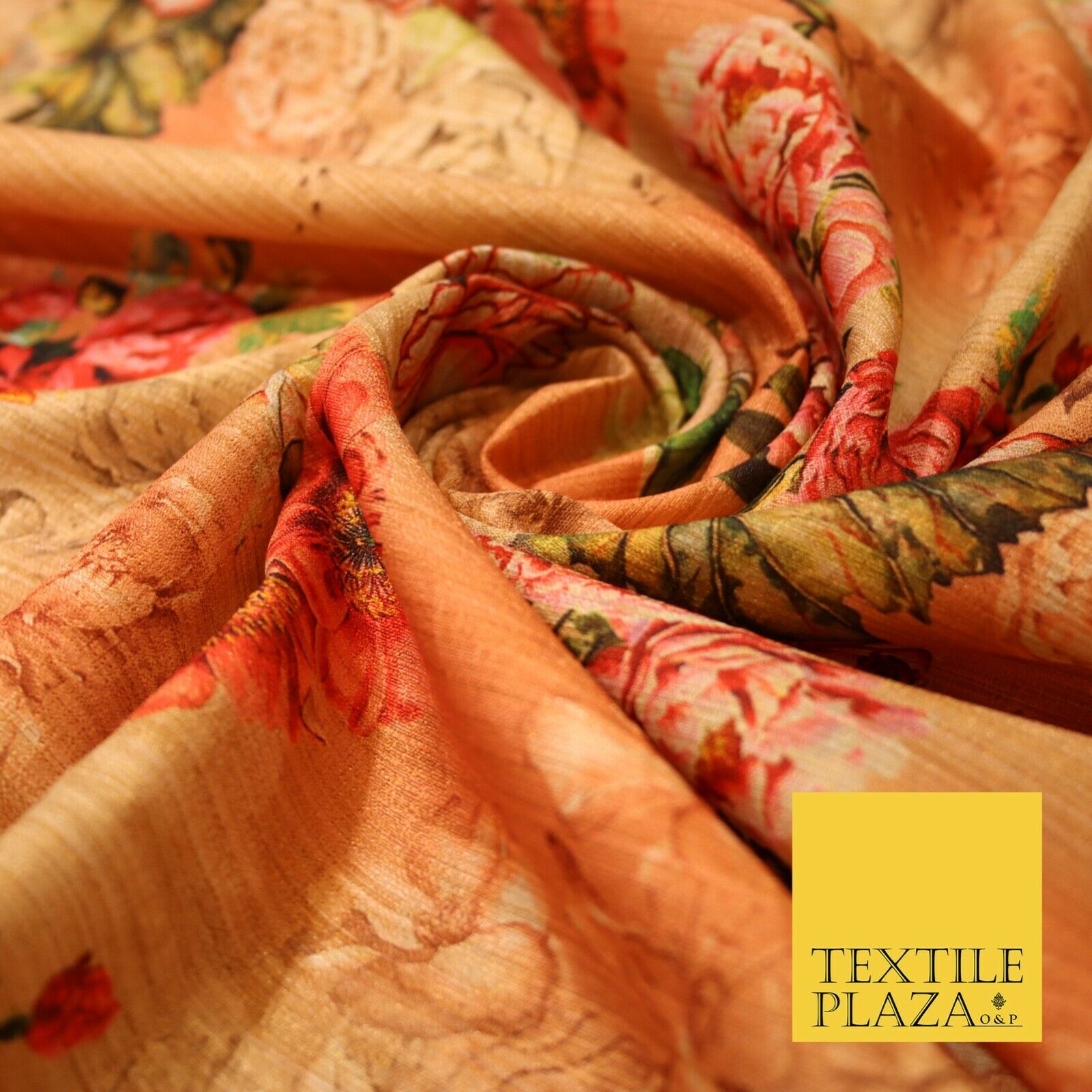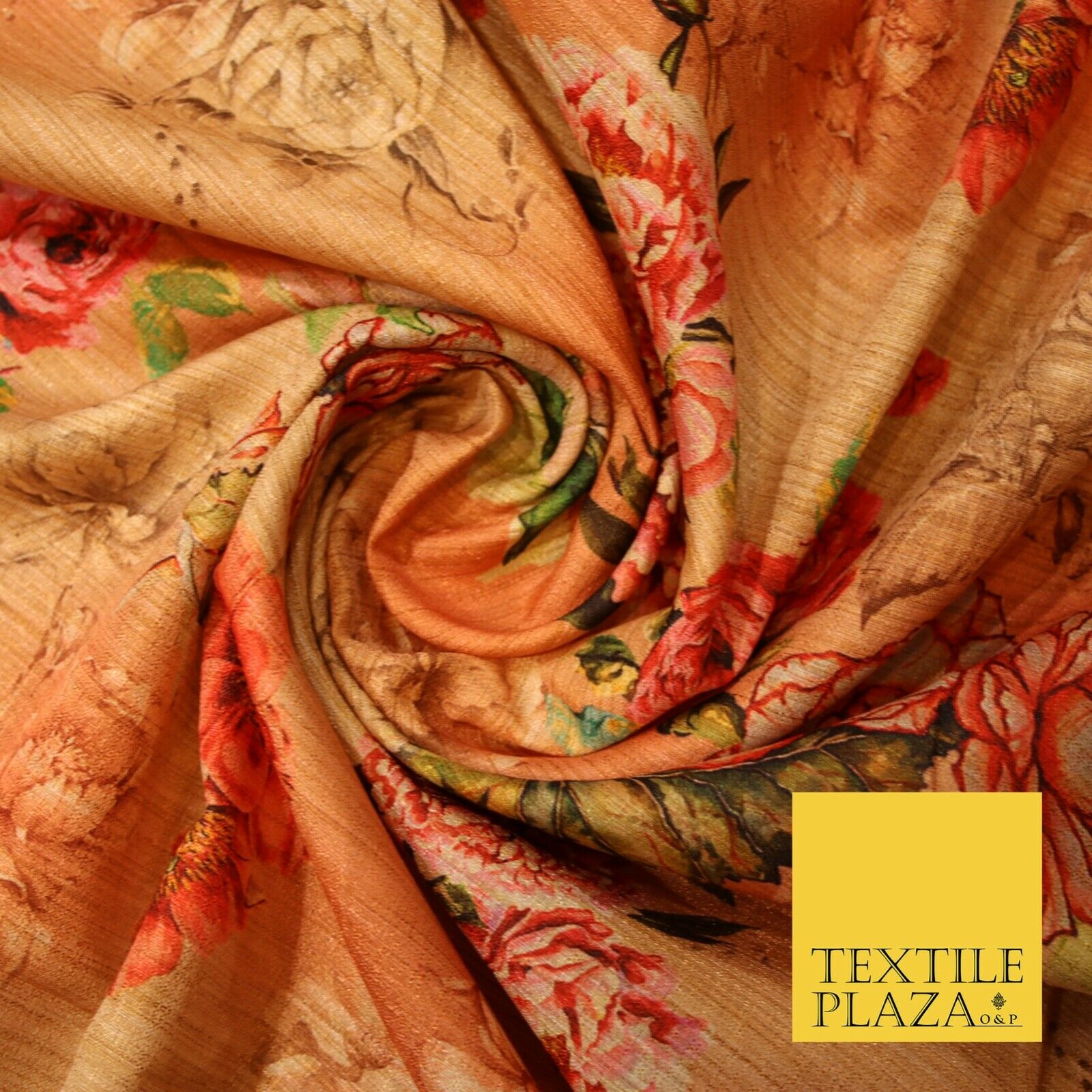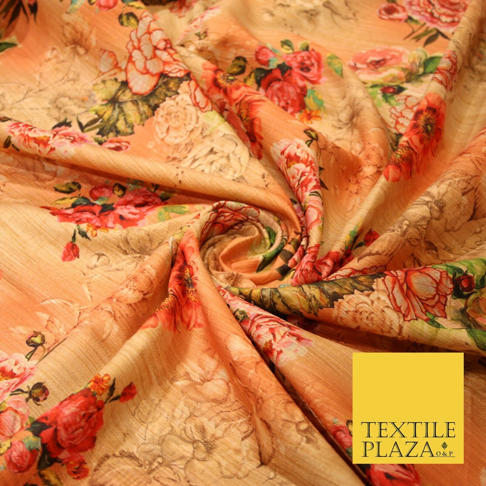Light Peach Gold Rose Floral Digital Print Faux Raw Silk Fabric Dress Craft 3002