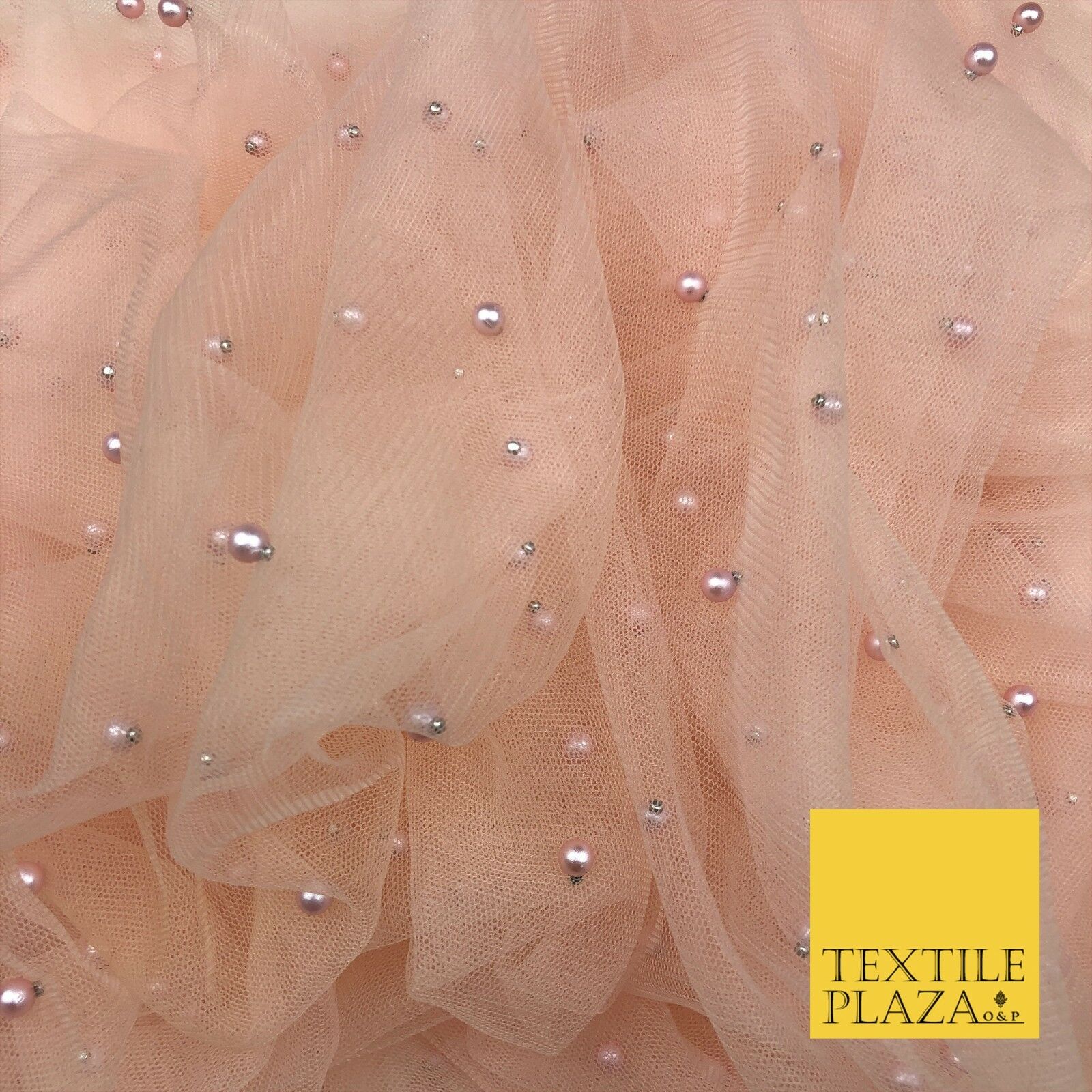 LIGHT PEACH Studded Pearl Mesh Net Fabric Bridal Sheer Craft Dress N1102