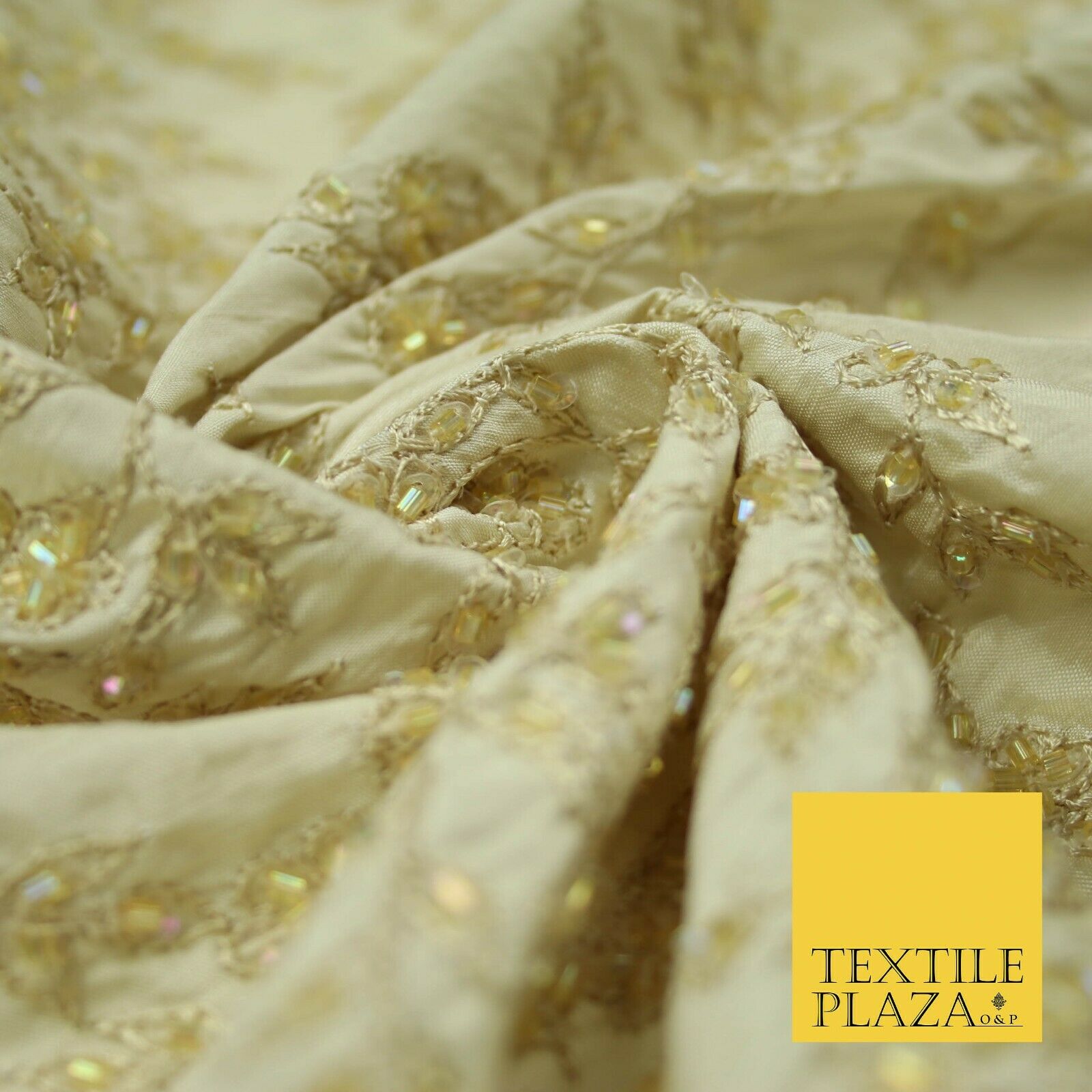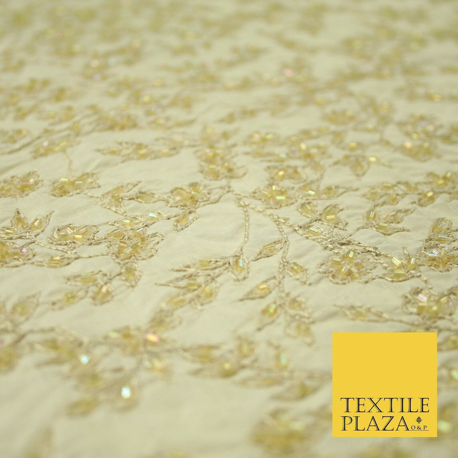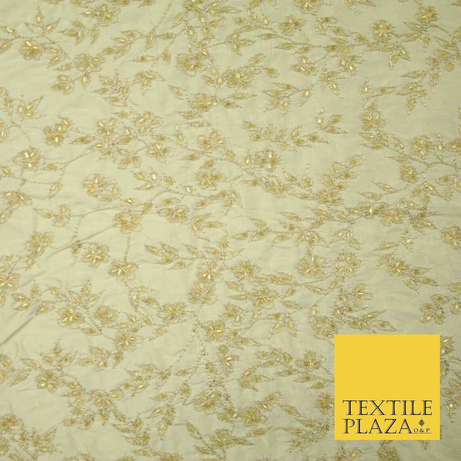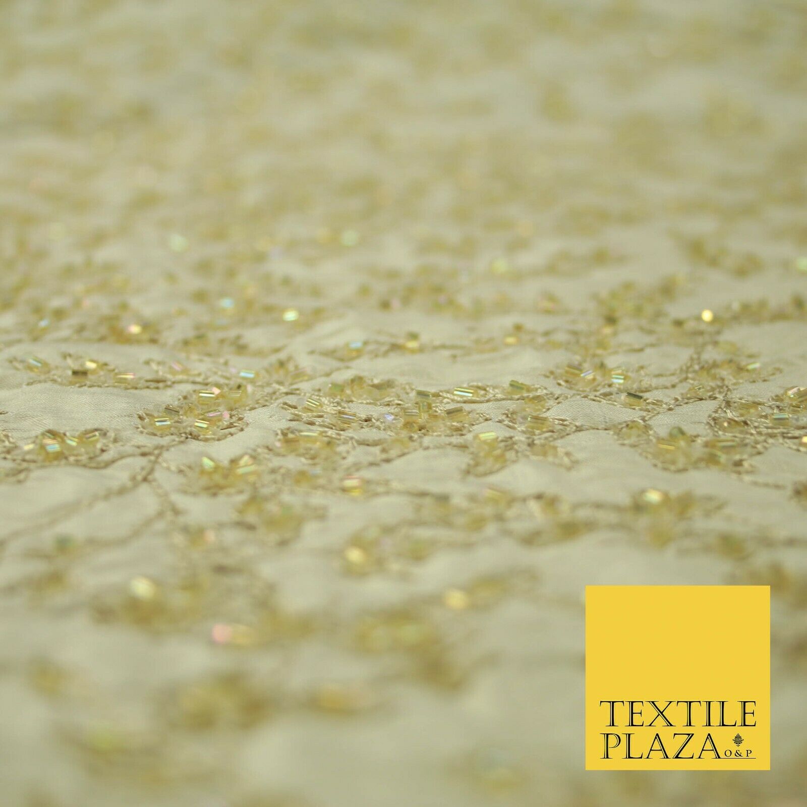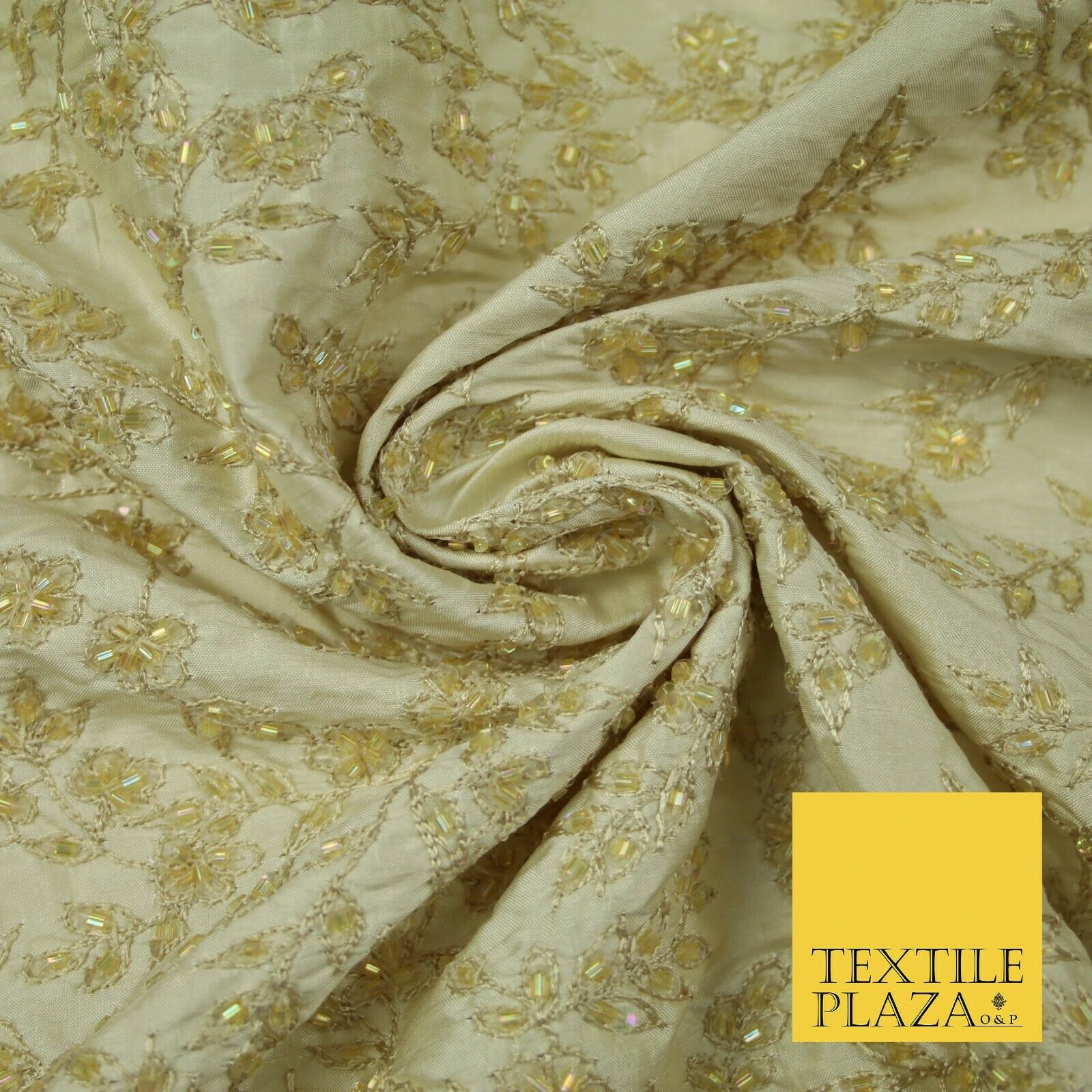 Luxury BEIGE GOLD Floral Beaded HAND EMBROIDERED 100% PURE SILK Fabric 46" 4500