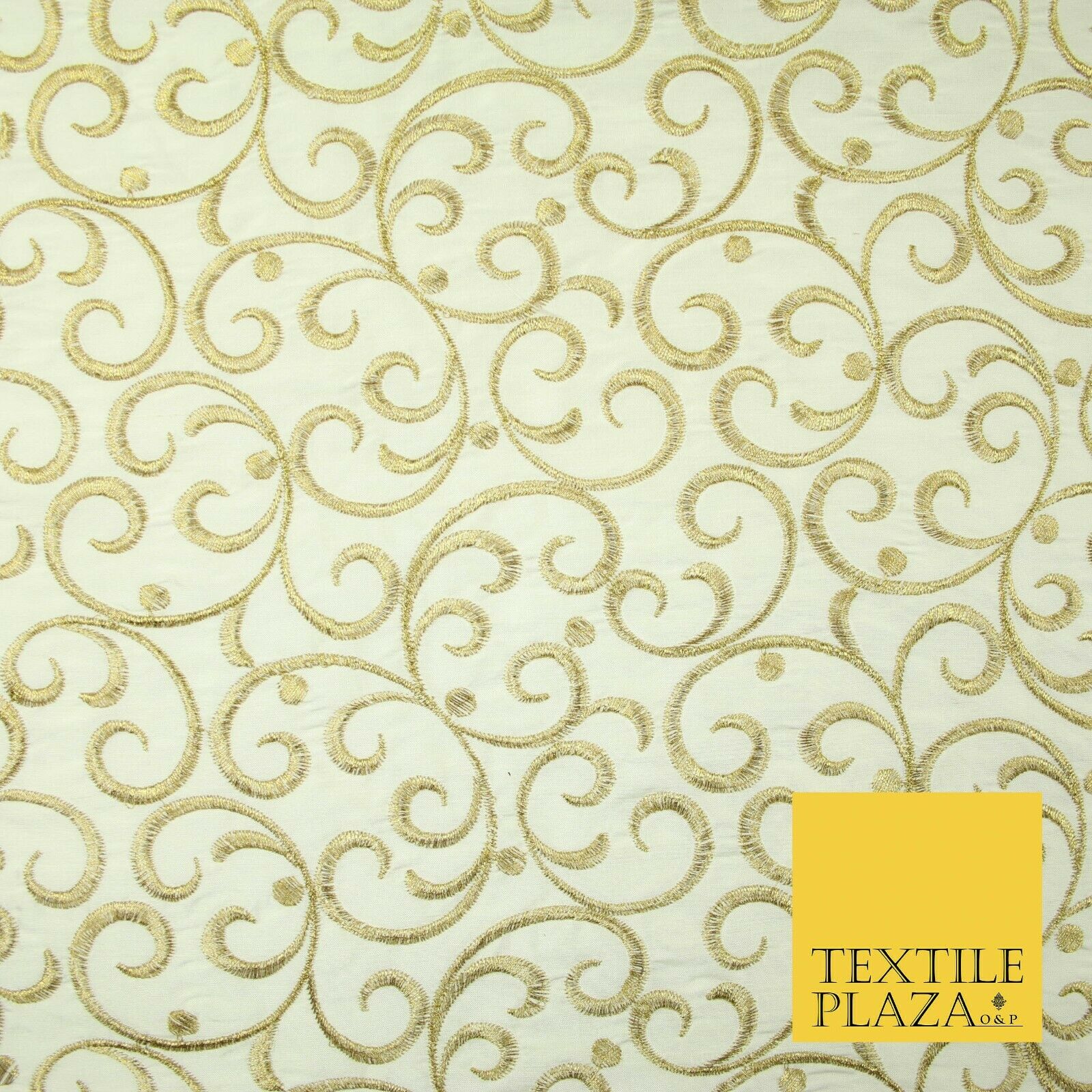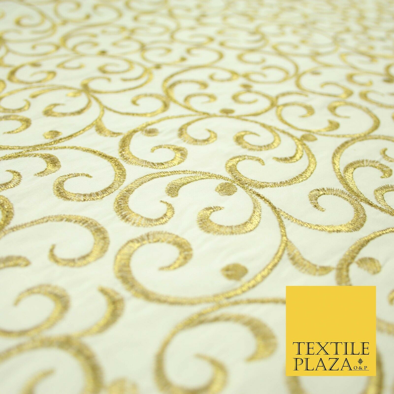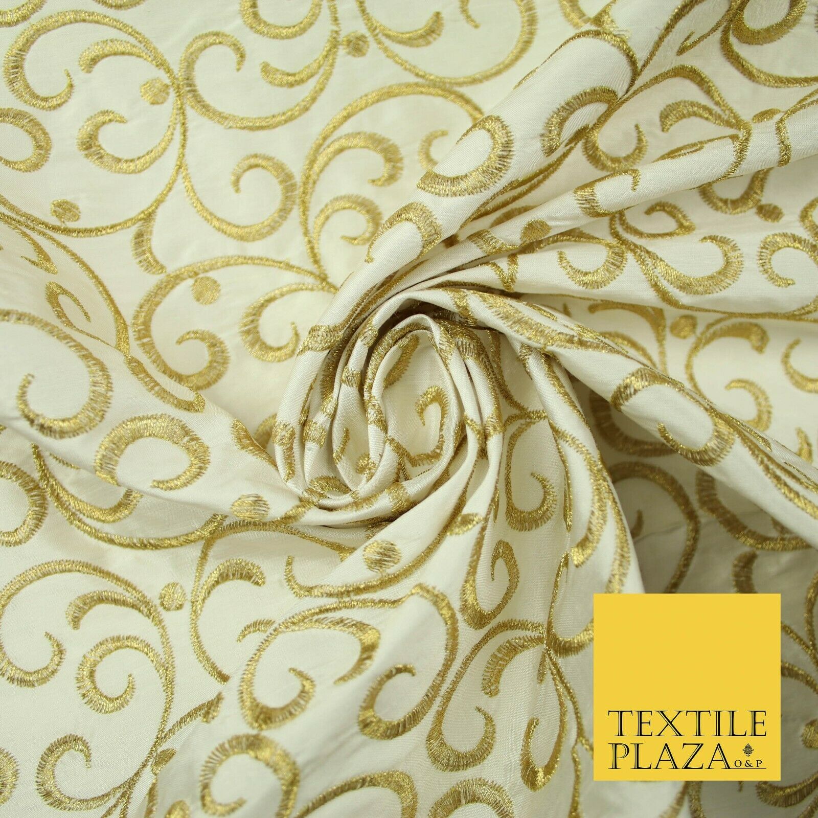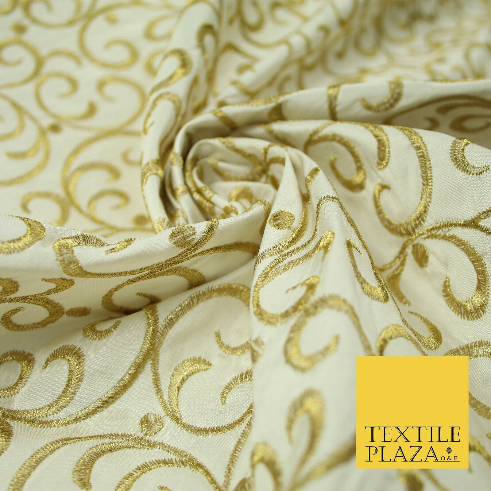 Luxury CREAM GOLD Intricate Swirls Embroidered 100% PURE SILK Fabric 45" 4509