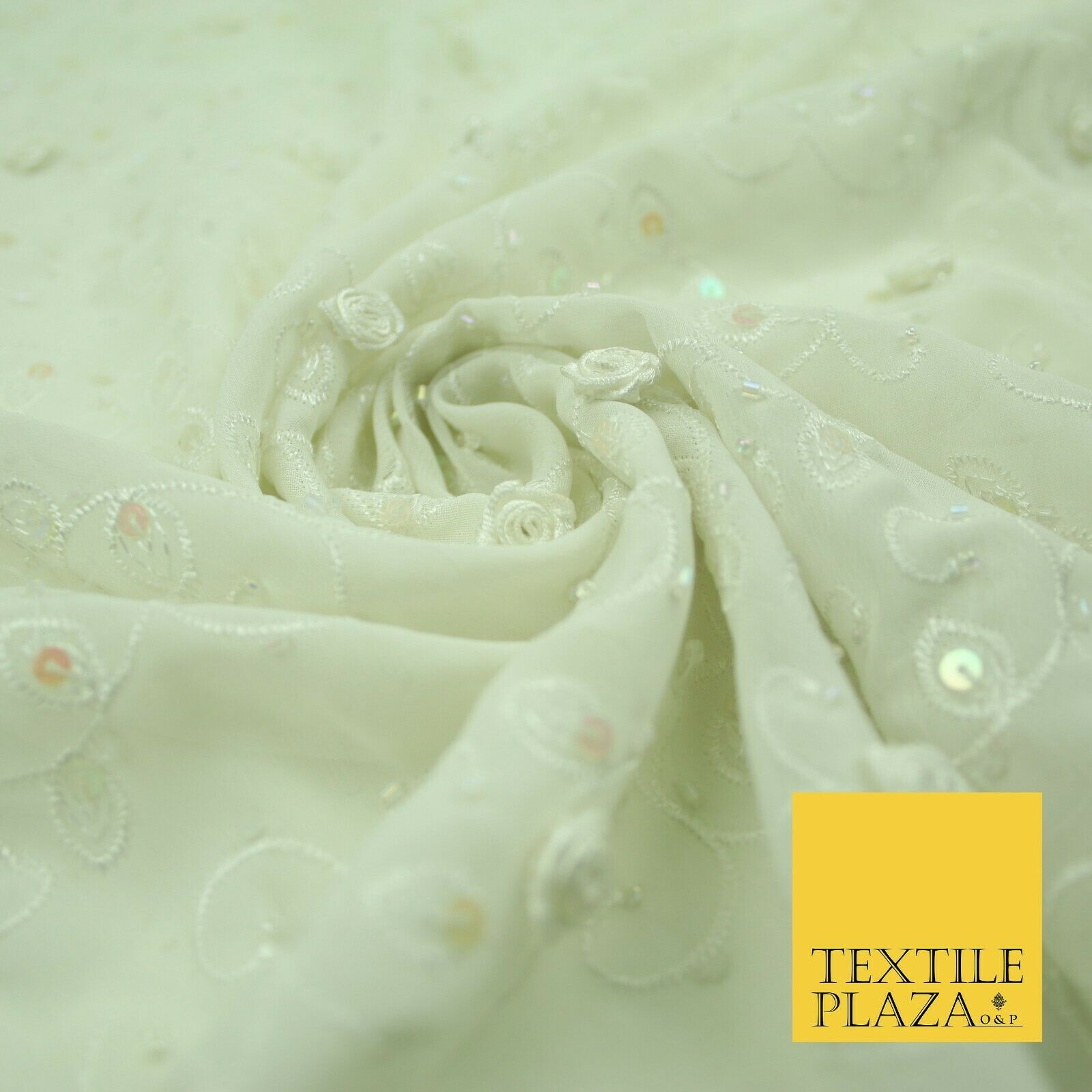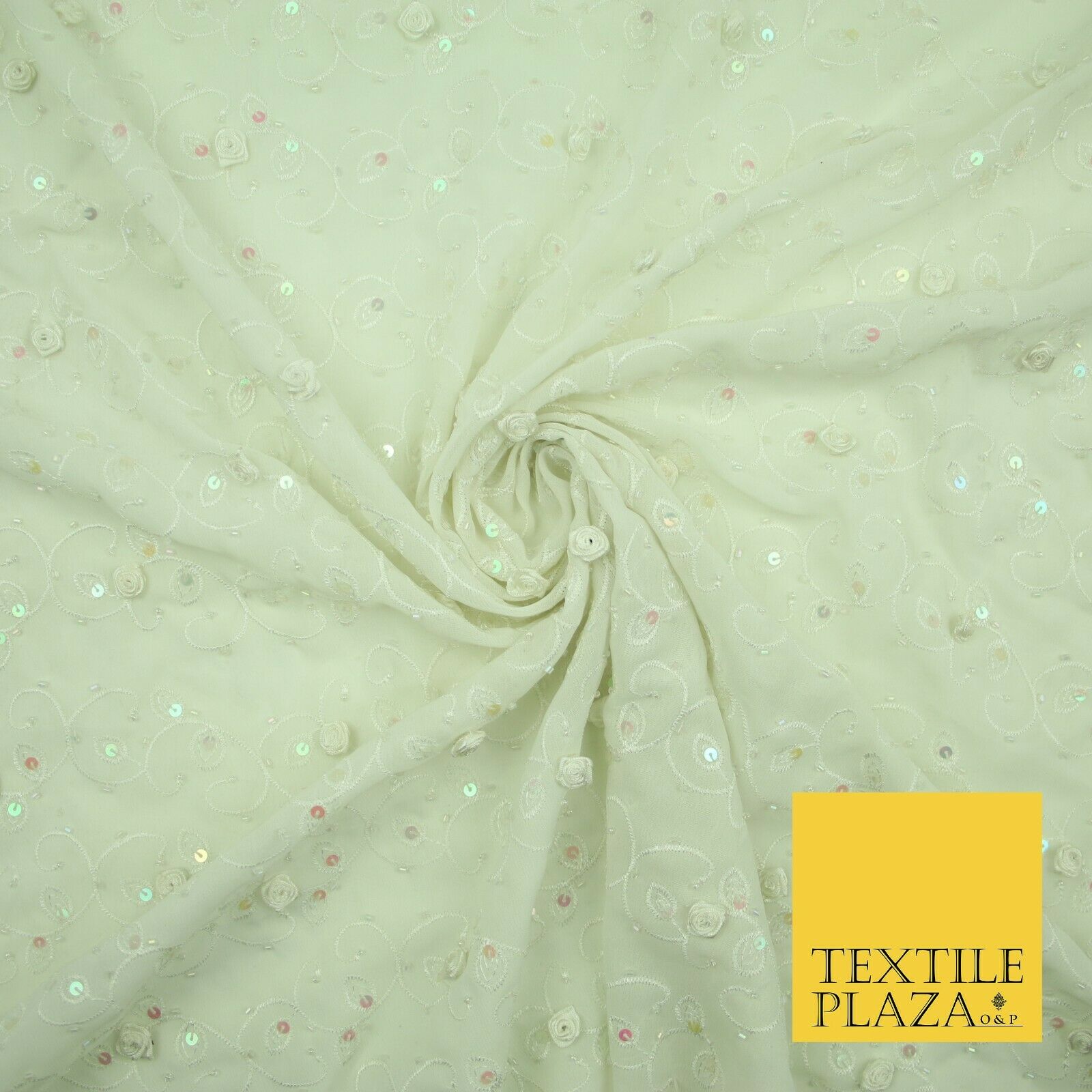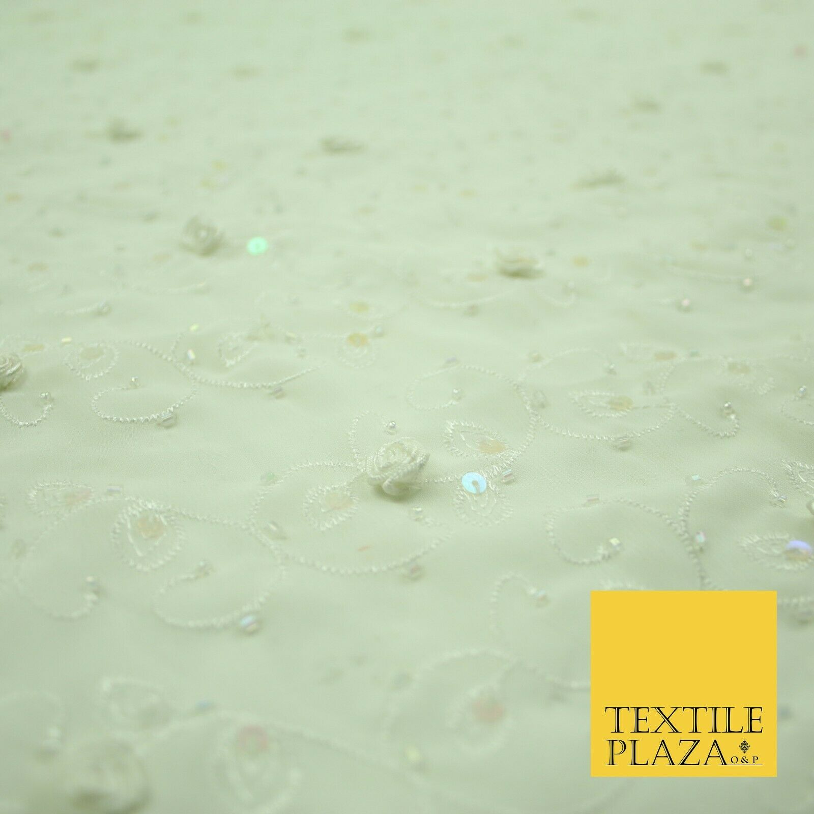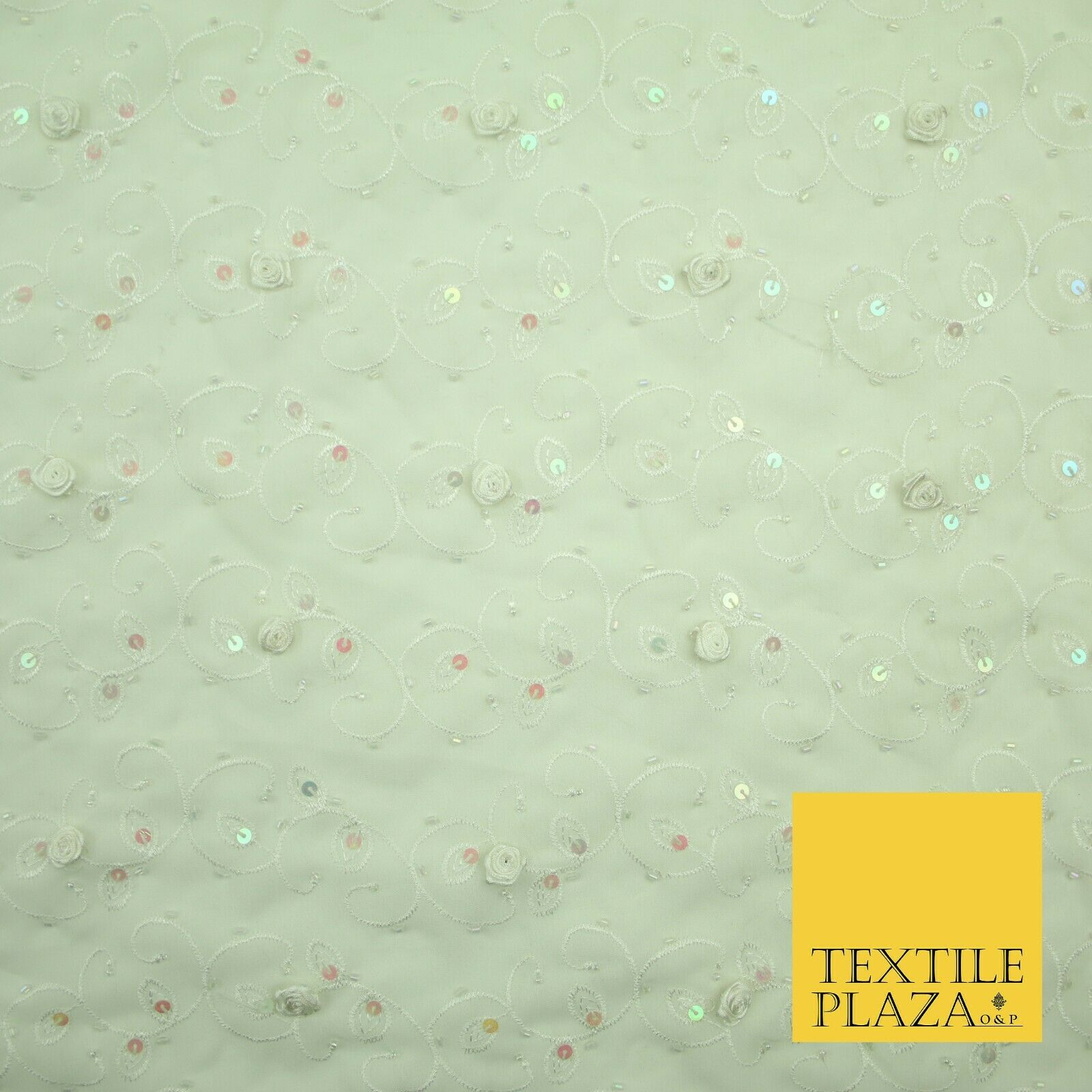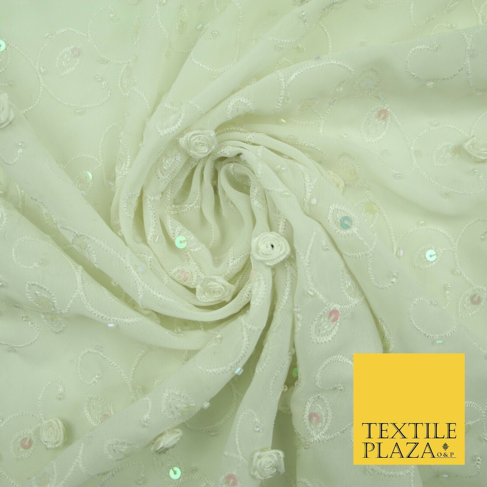 Luxury Cream Sequin Pearl 3D Roses Beaded Swirls Georgette Dress Fabric 2762