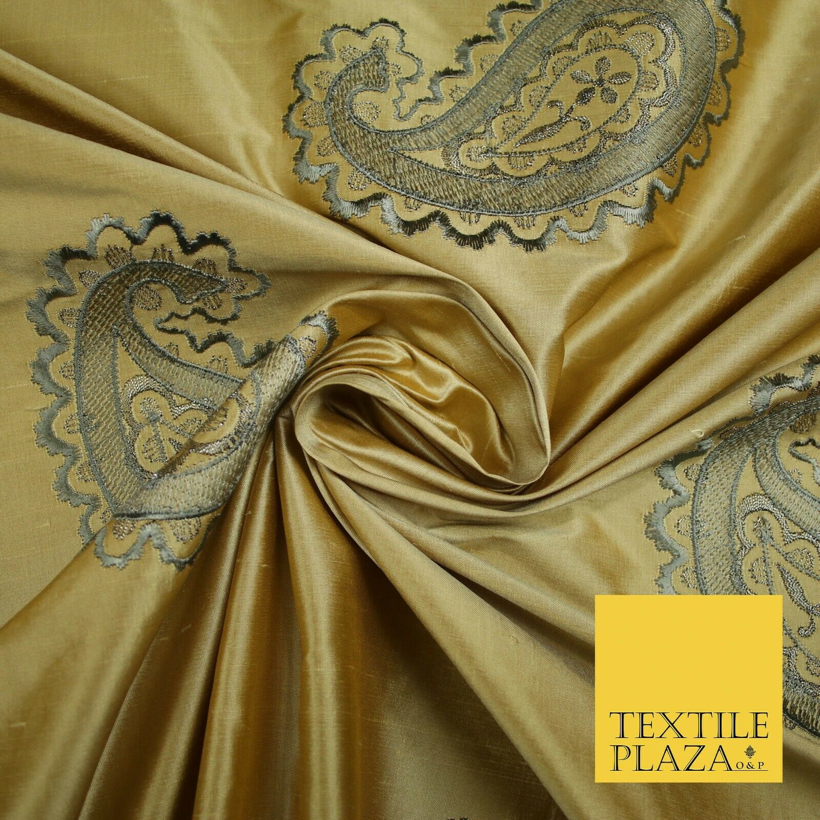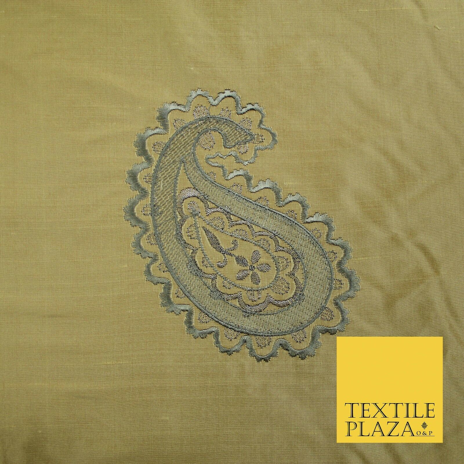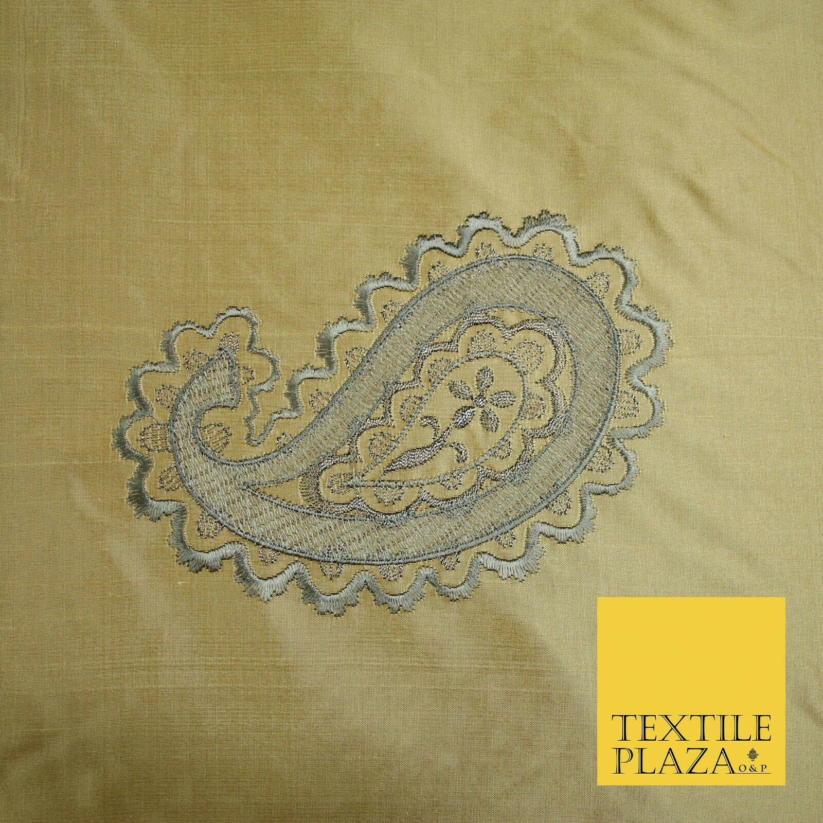 Luxury Gold Large Grey Ornate Paisley Embroidered 100% PURE SILK Fabric 53" 4641