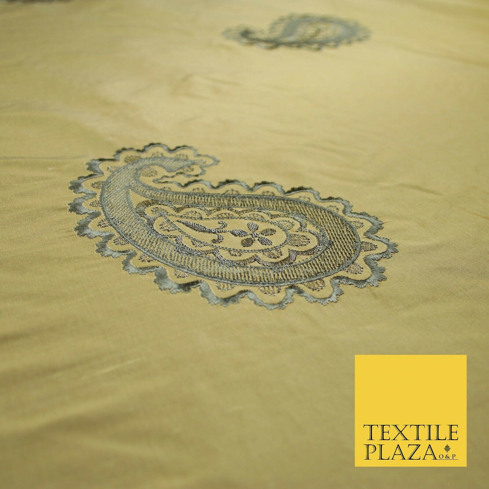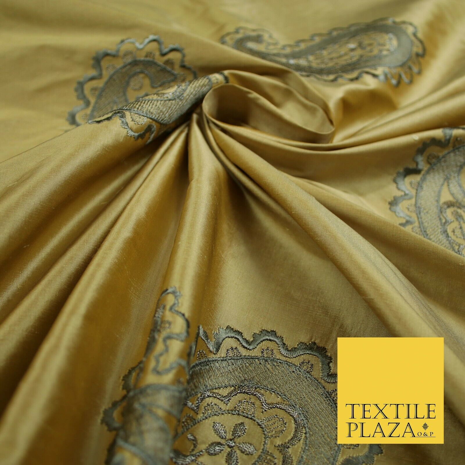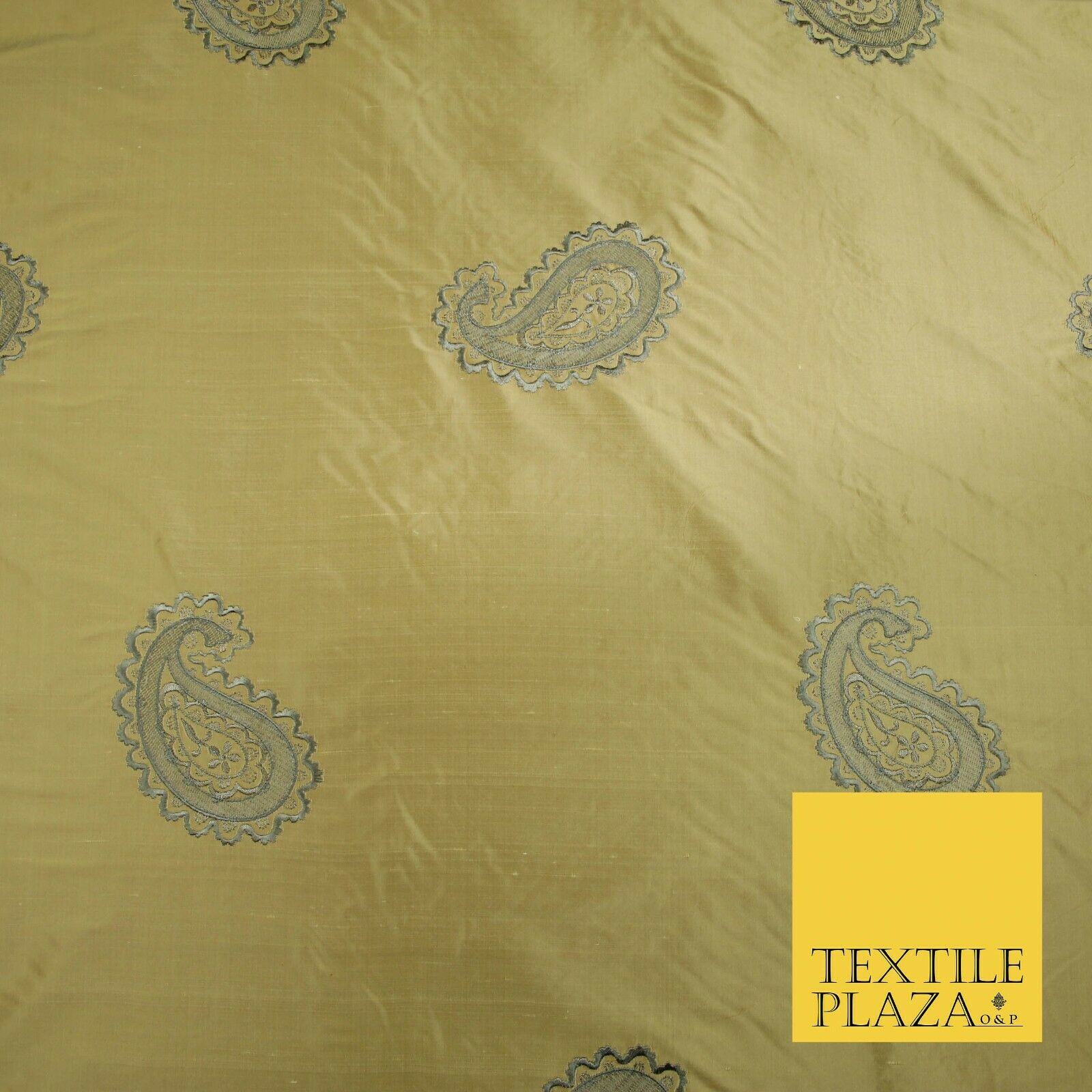 Luxury Gold Large Grey Ornate Paisley Embroidered 100% PURE SILK Fabric 53" 4641