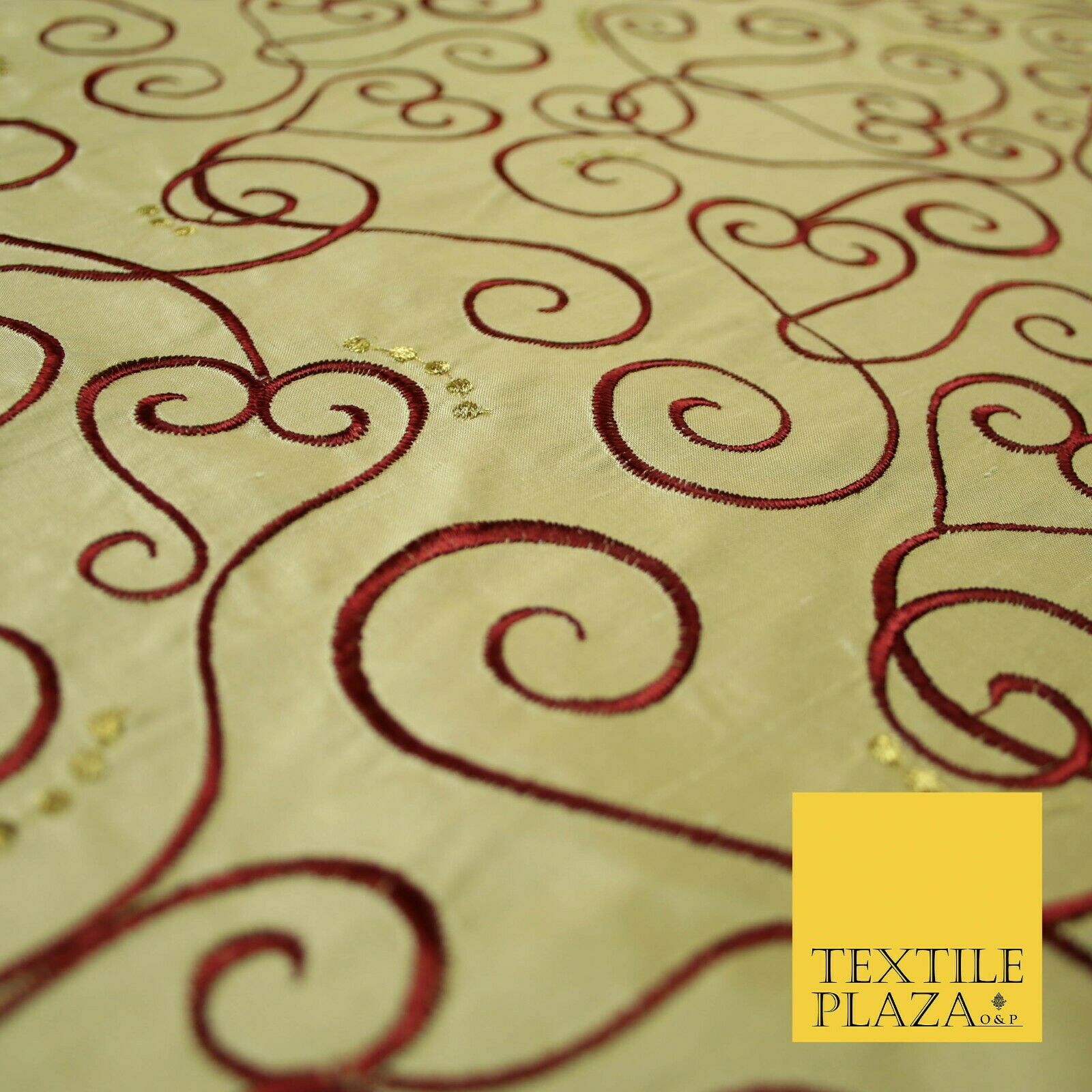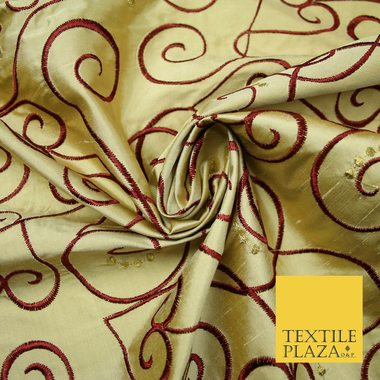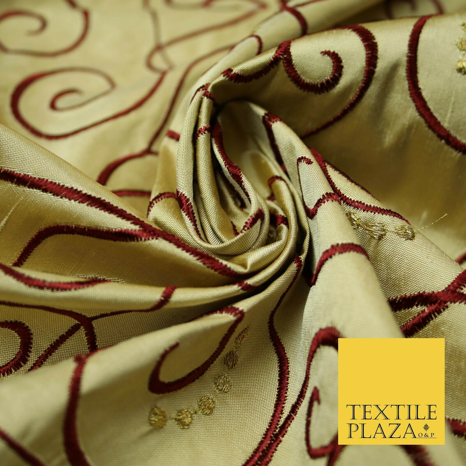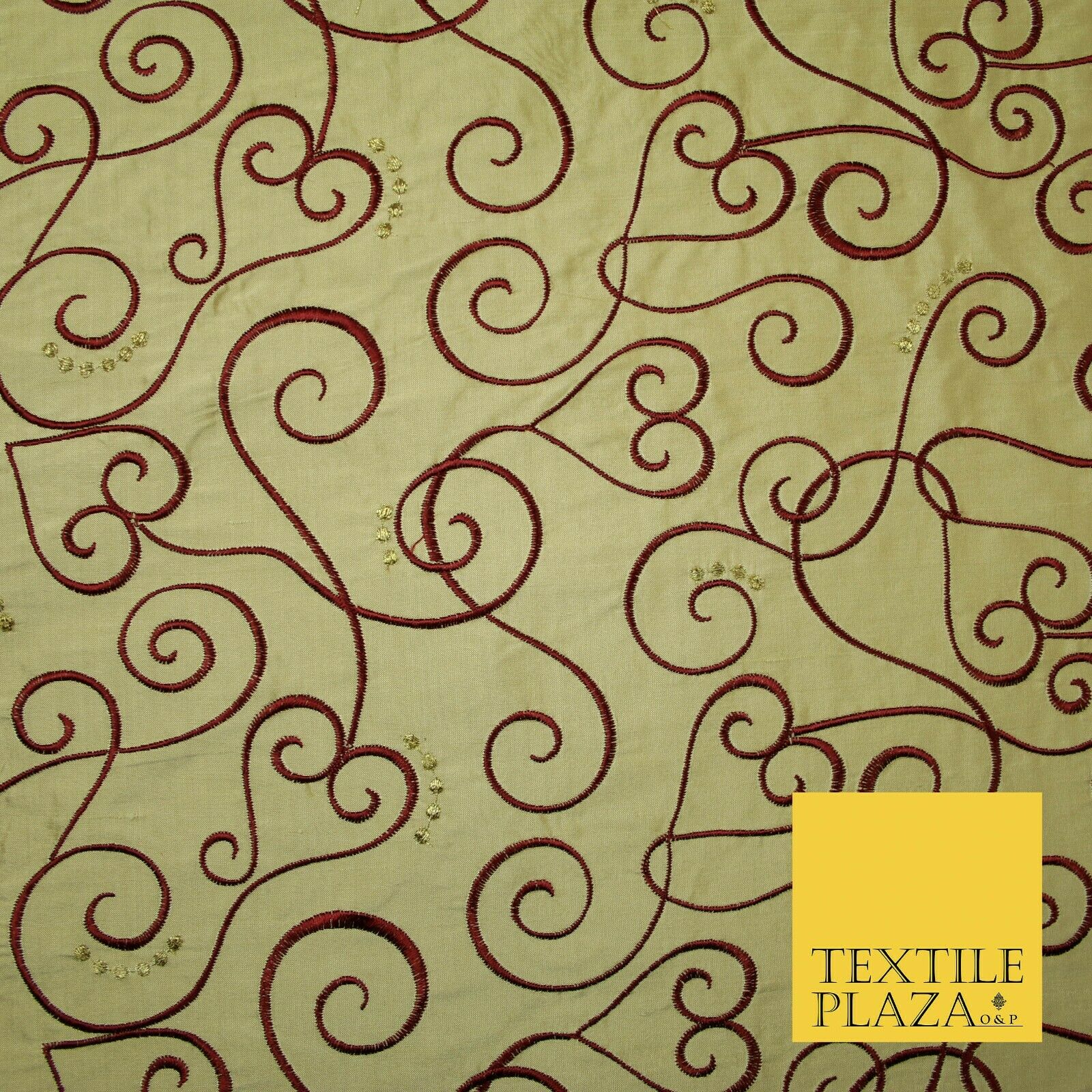 Luxury GOLD MAROON Ornate Swirl Hearts Embroidered 100% PURE SILK Fabric 4535