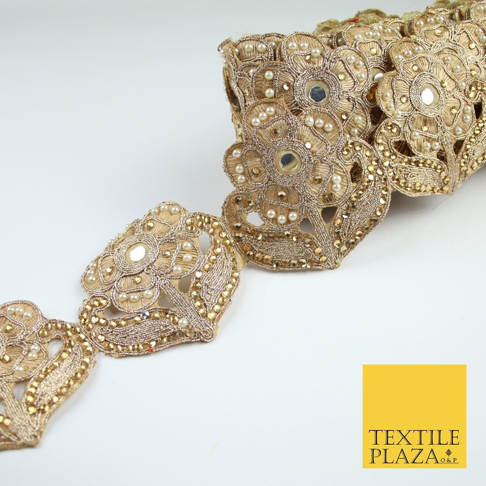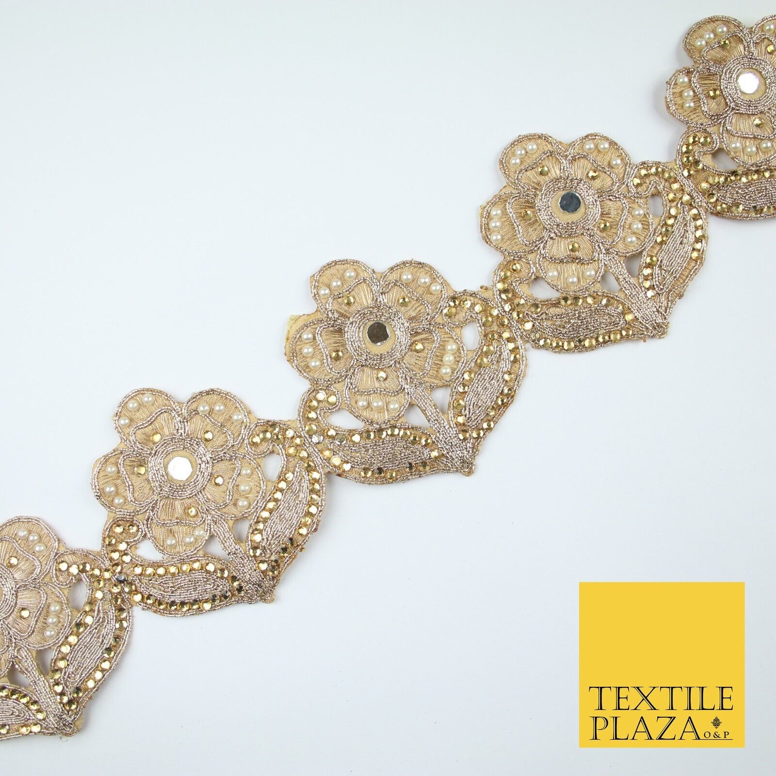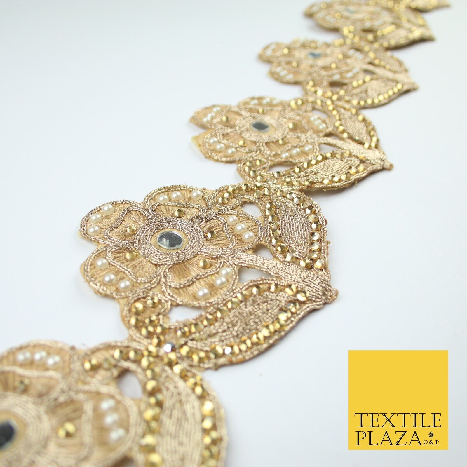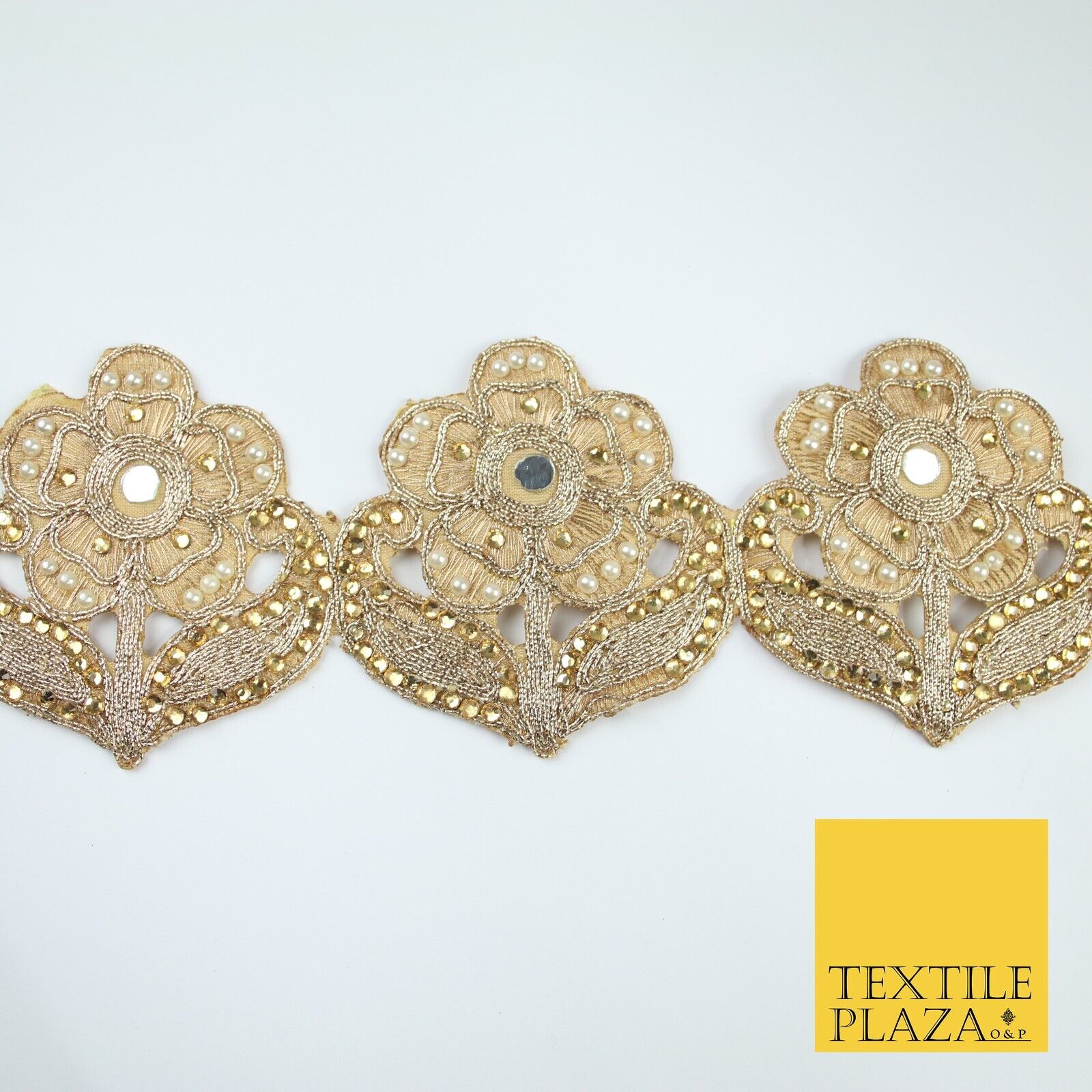 Luxury Gold Mirror Pearl Diamonte Stone Floral Motif Border Lace - 9cm Wide X679