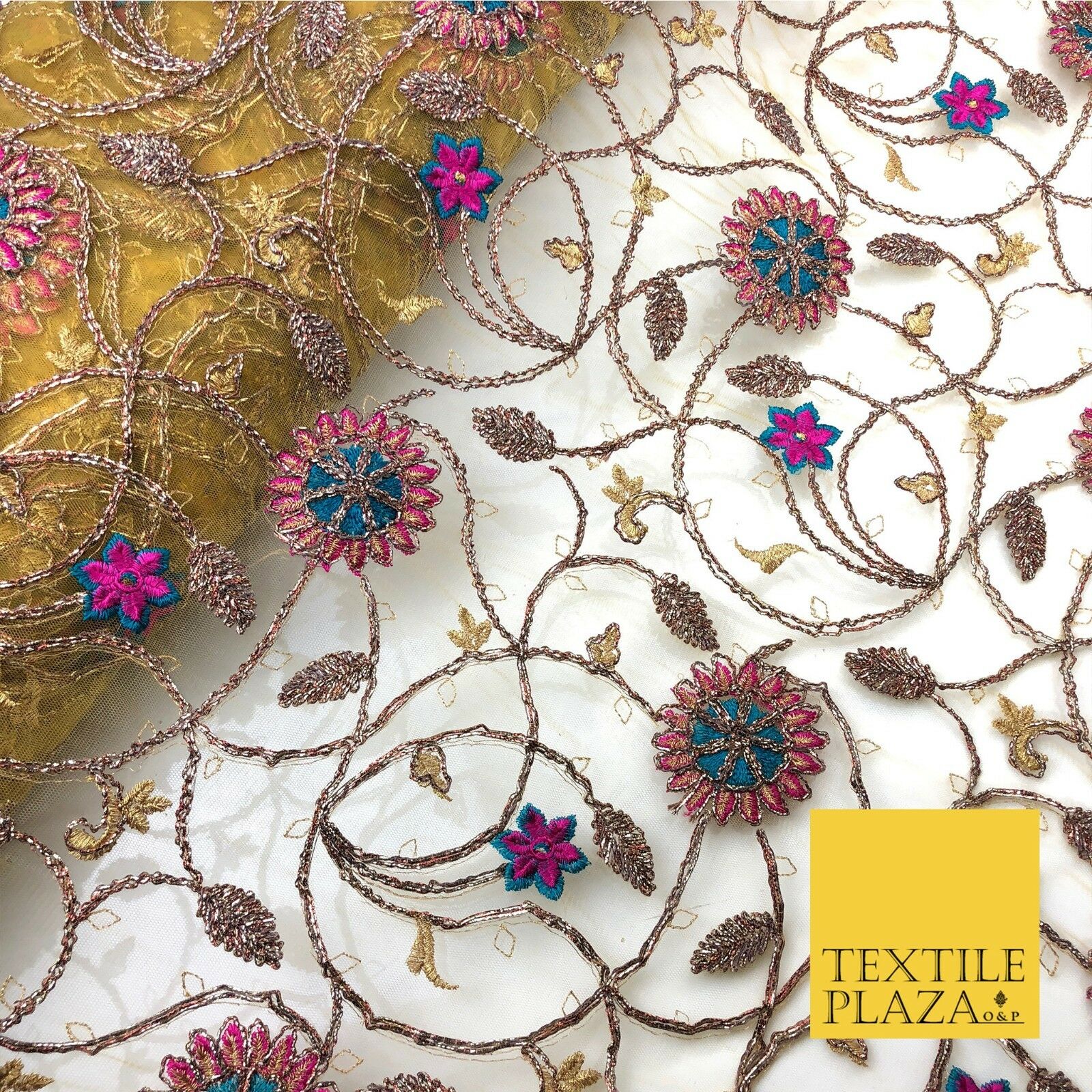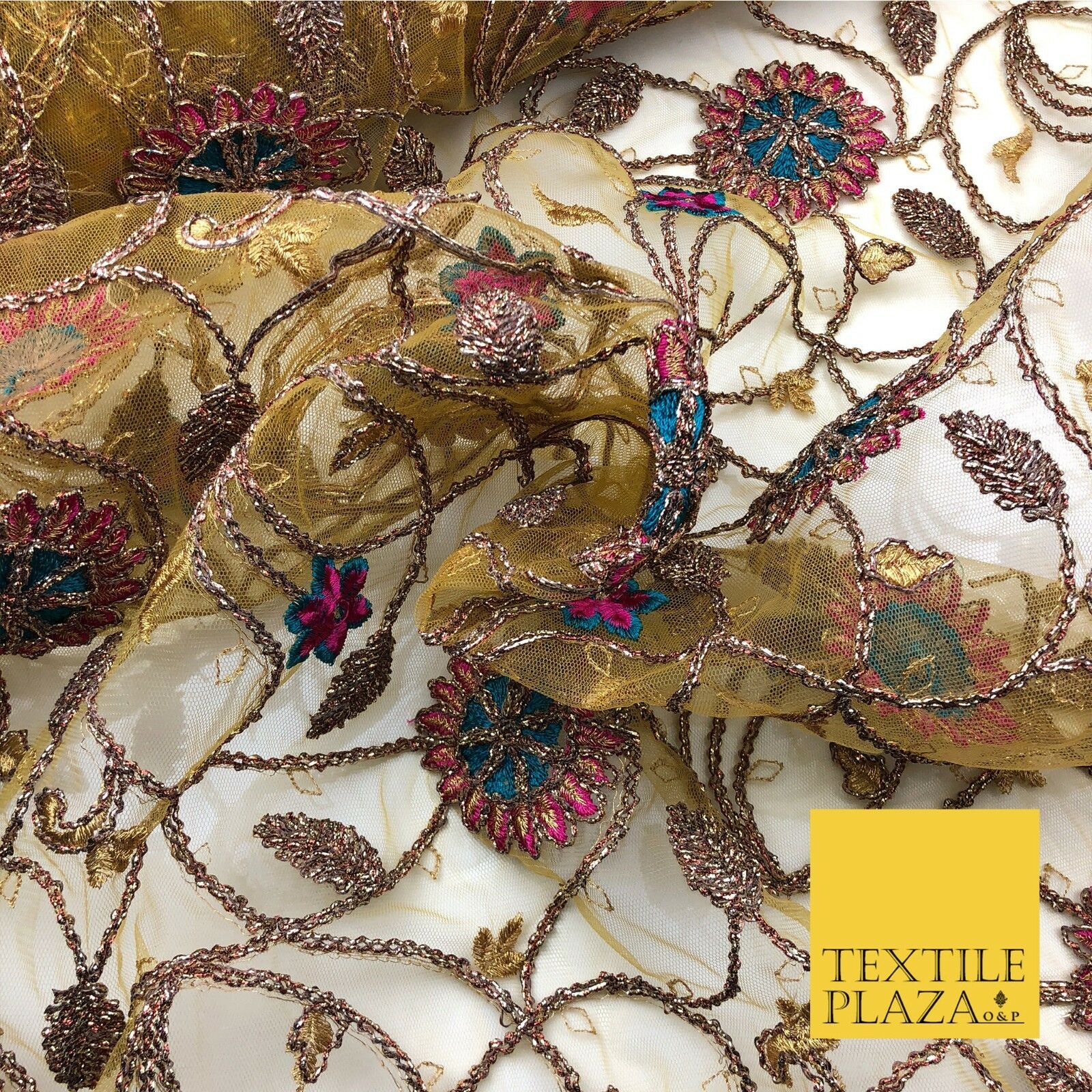 Luxury Gold/Mustard Coloured Ornate Flower Jaal Metallic Threadwork Net JF287