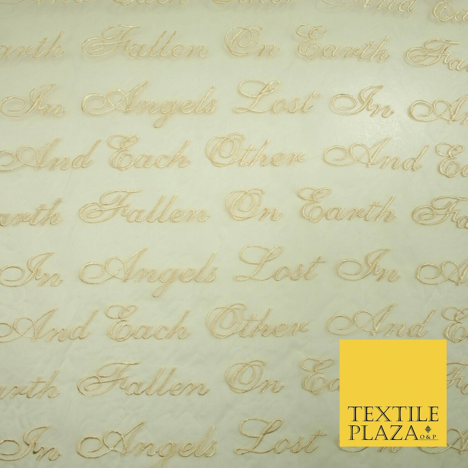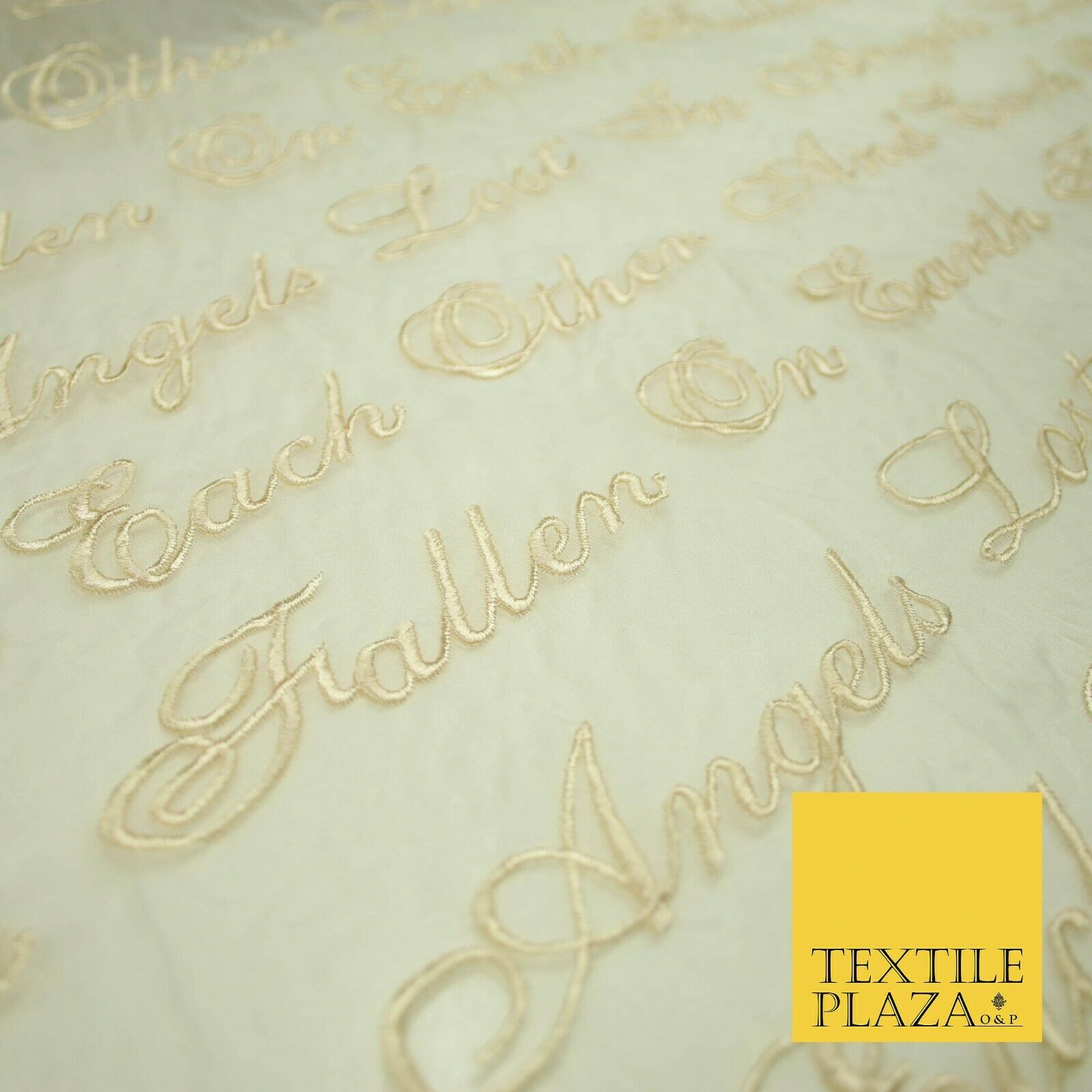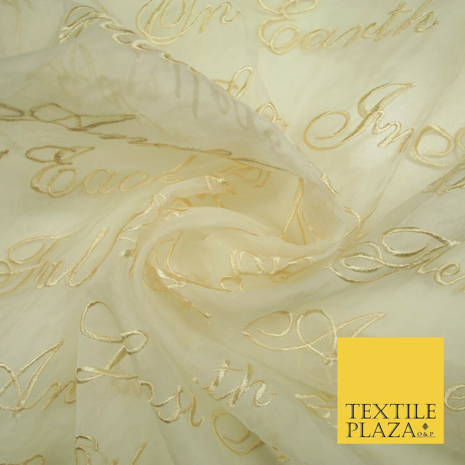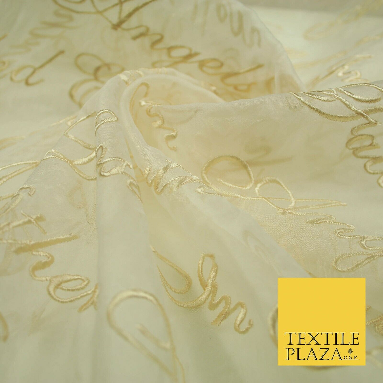 Luxury Ivory Gold Angel Script Embroidered 100% SILK ORGANZA Fabric 45" 4629