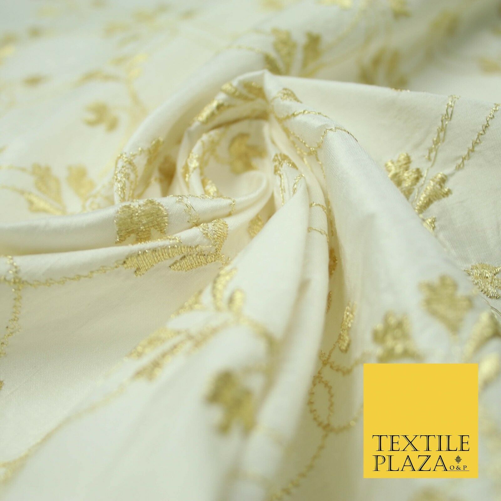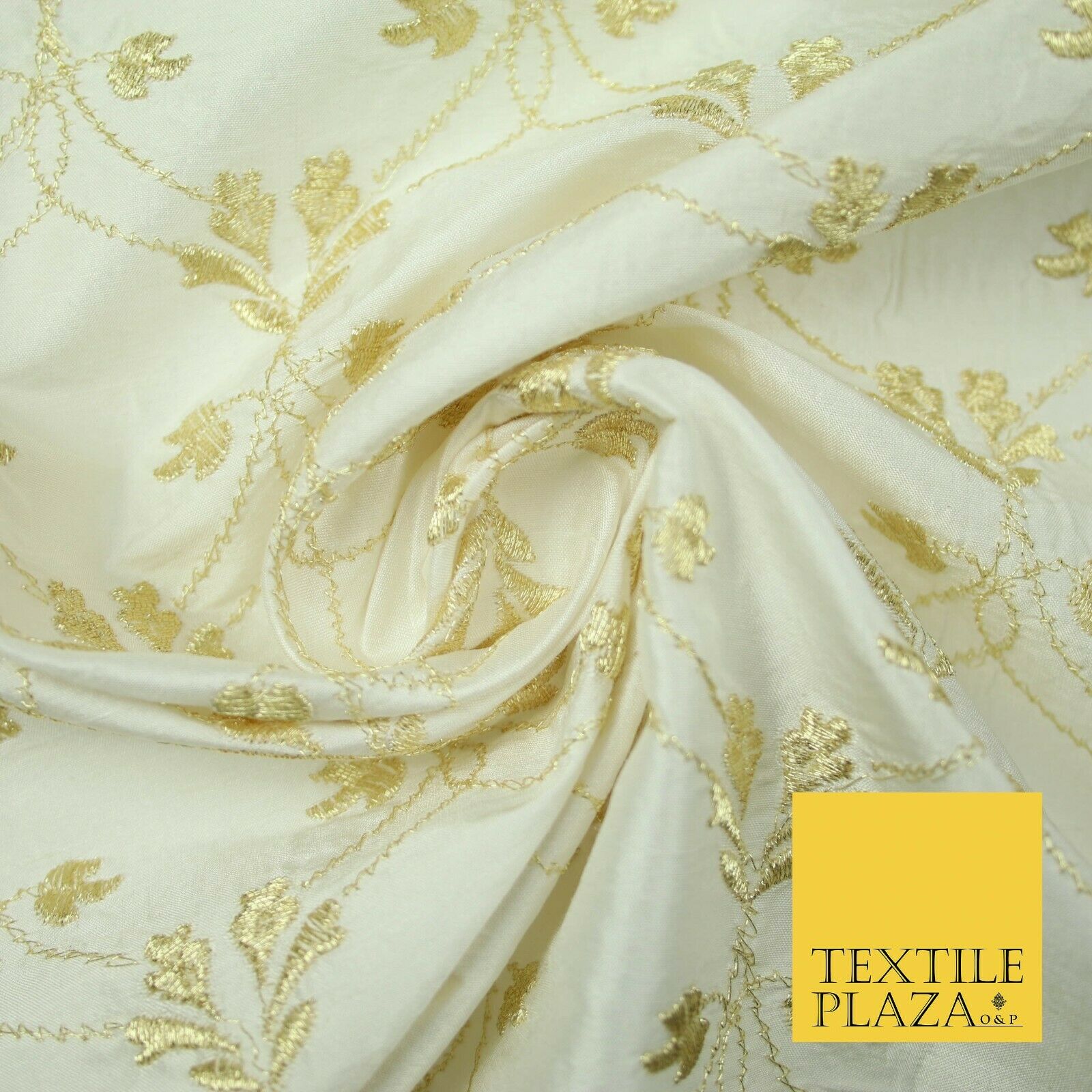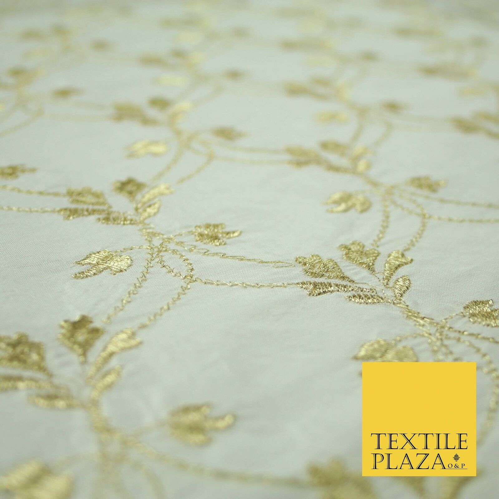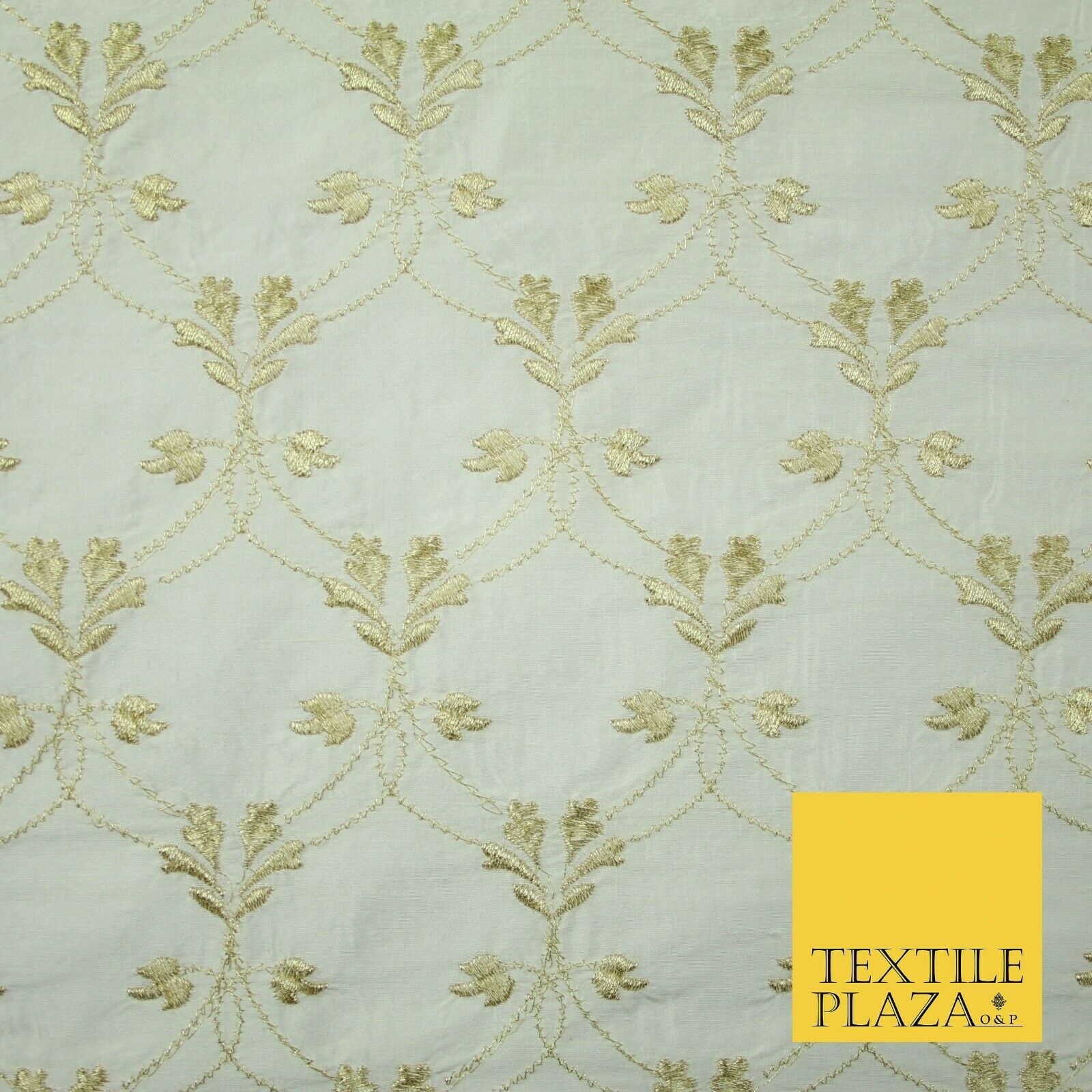 Luxury IVORY GOLD Floral Lattice Embroidered 100% PURE SILK Fabric 45" 4525