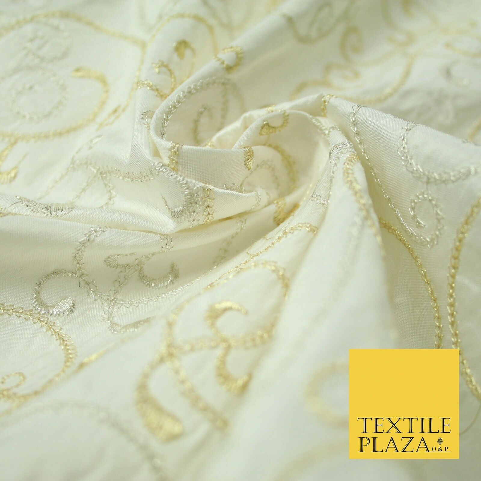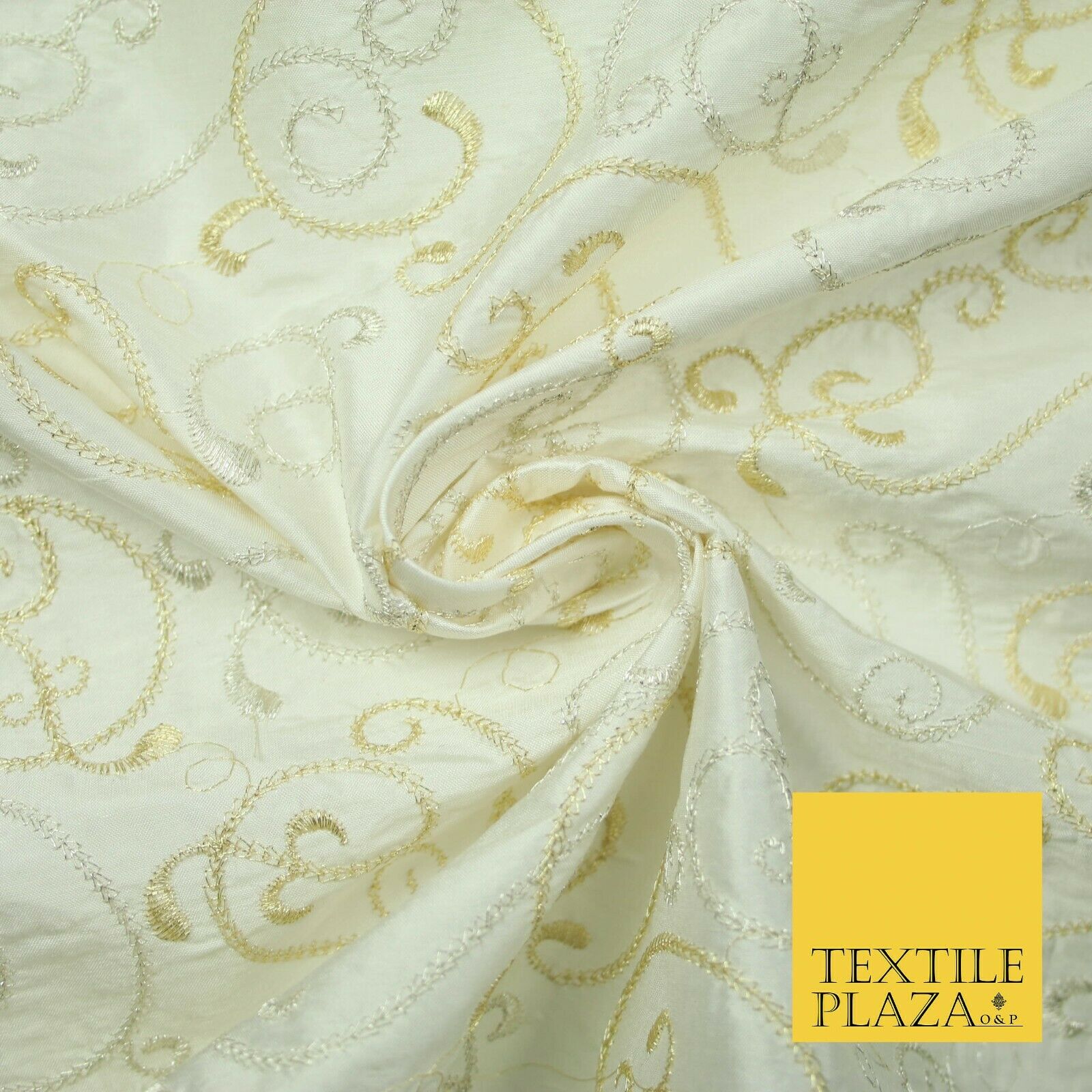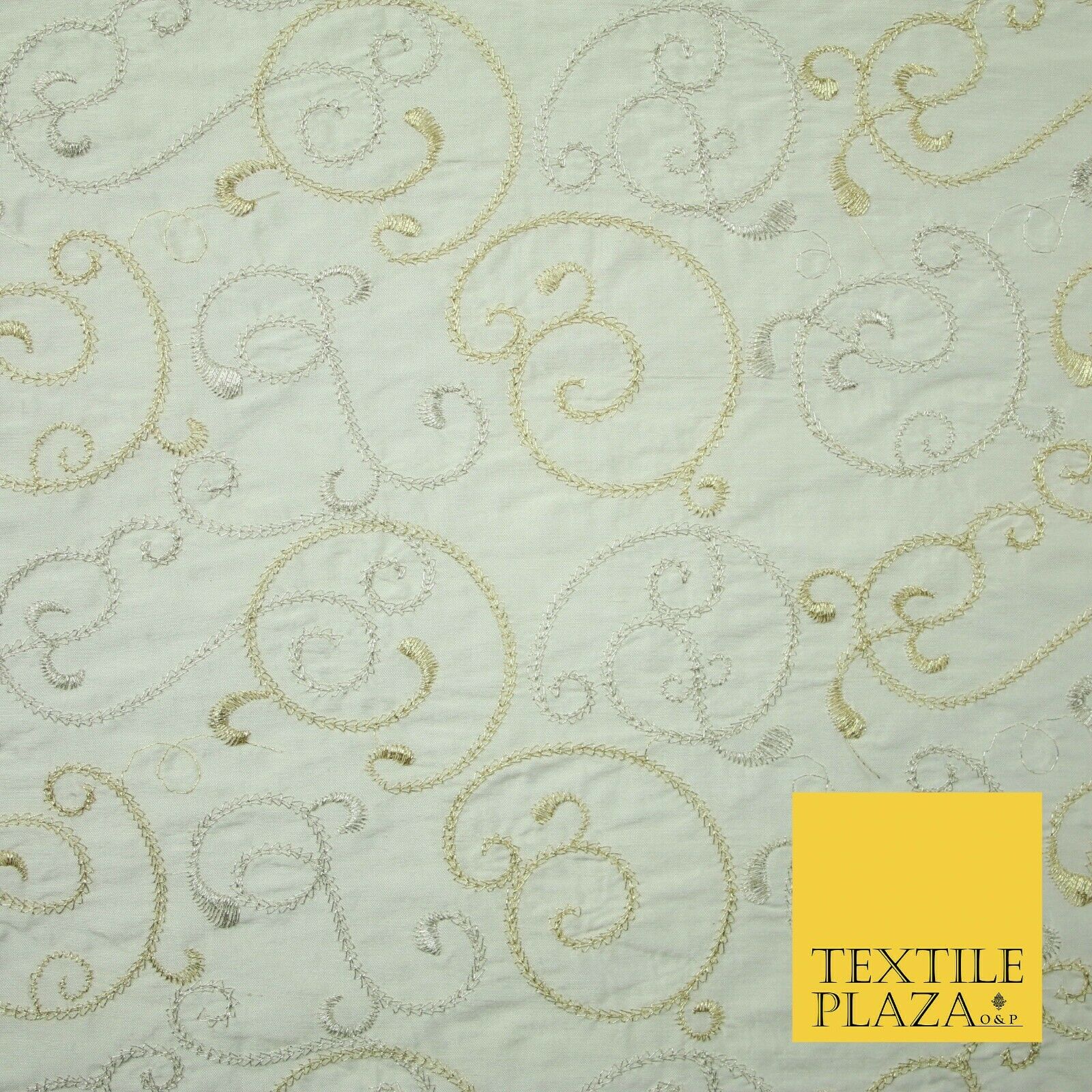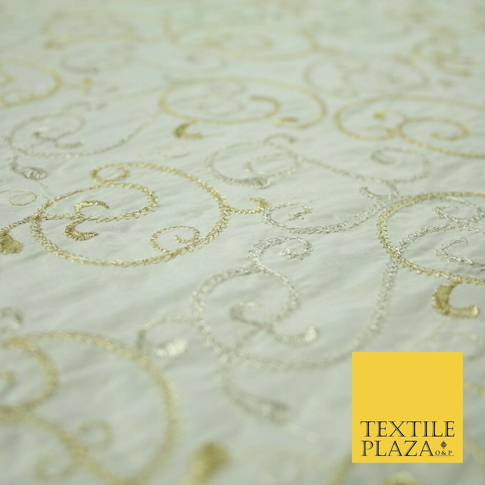 Luxury IVORY GOLD MIX Intricate Vine Embroidered 100% PURE SILK Fabric 44" 4522