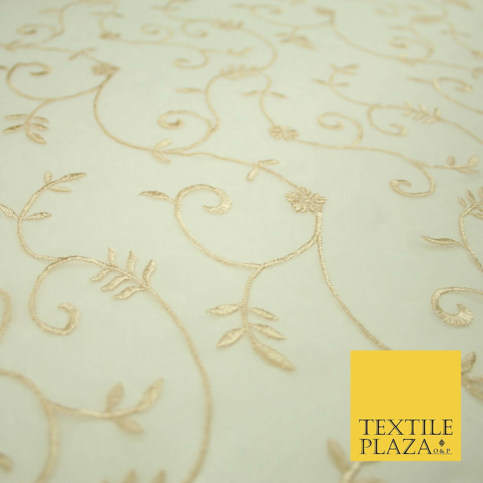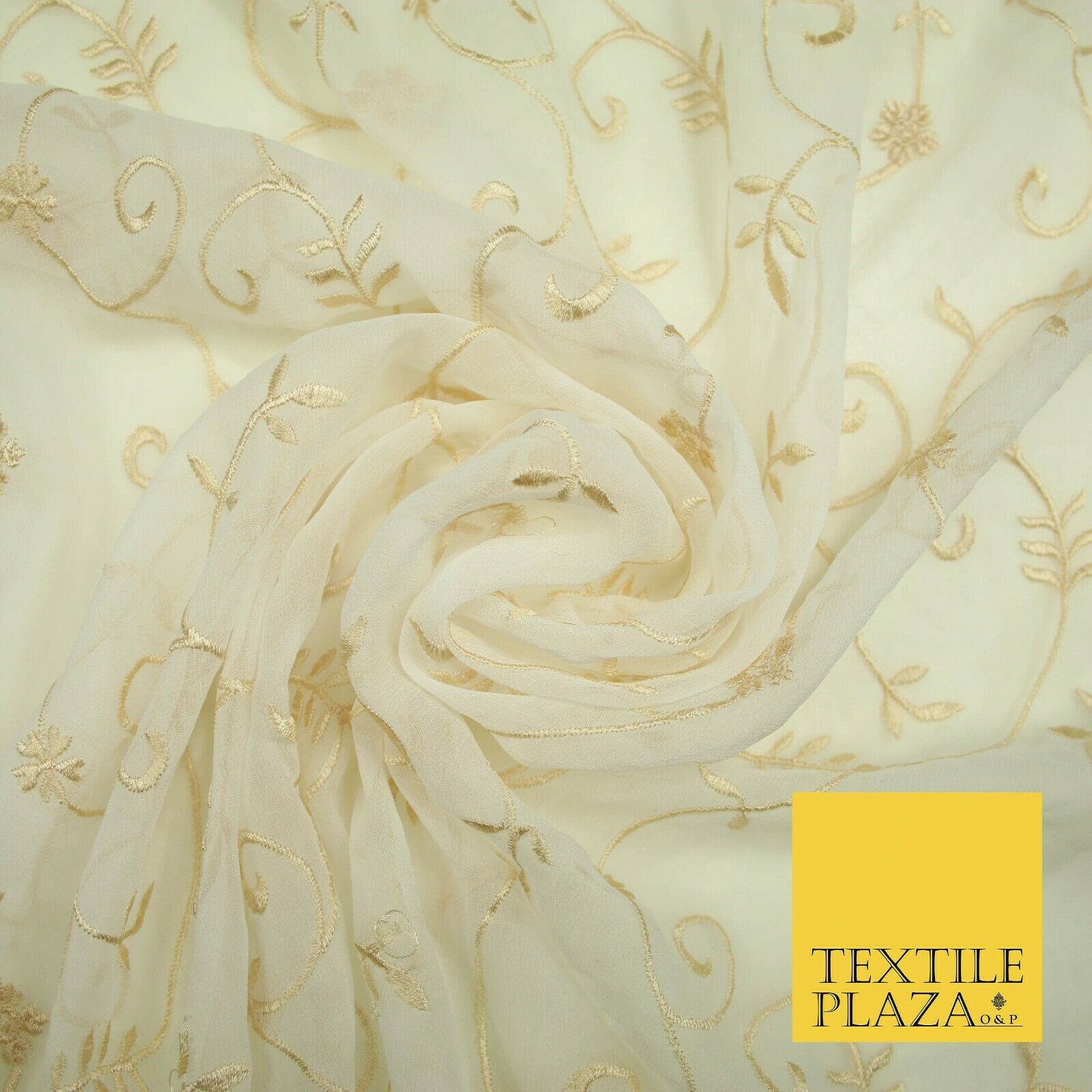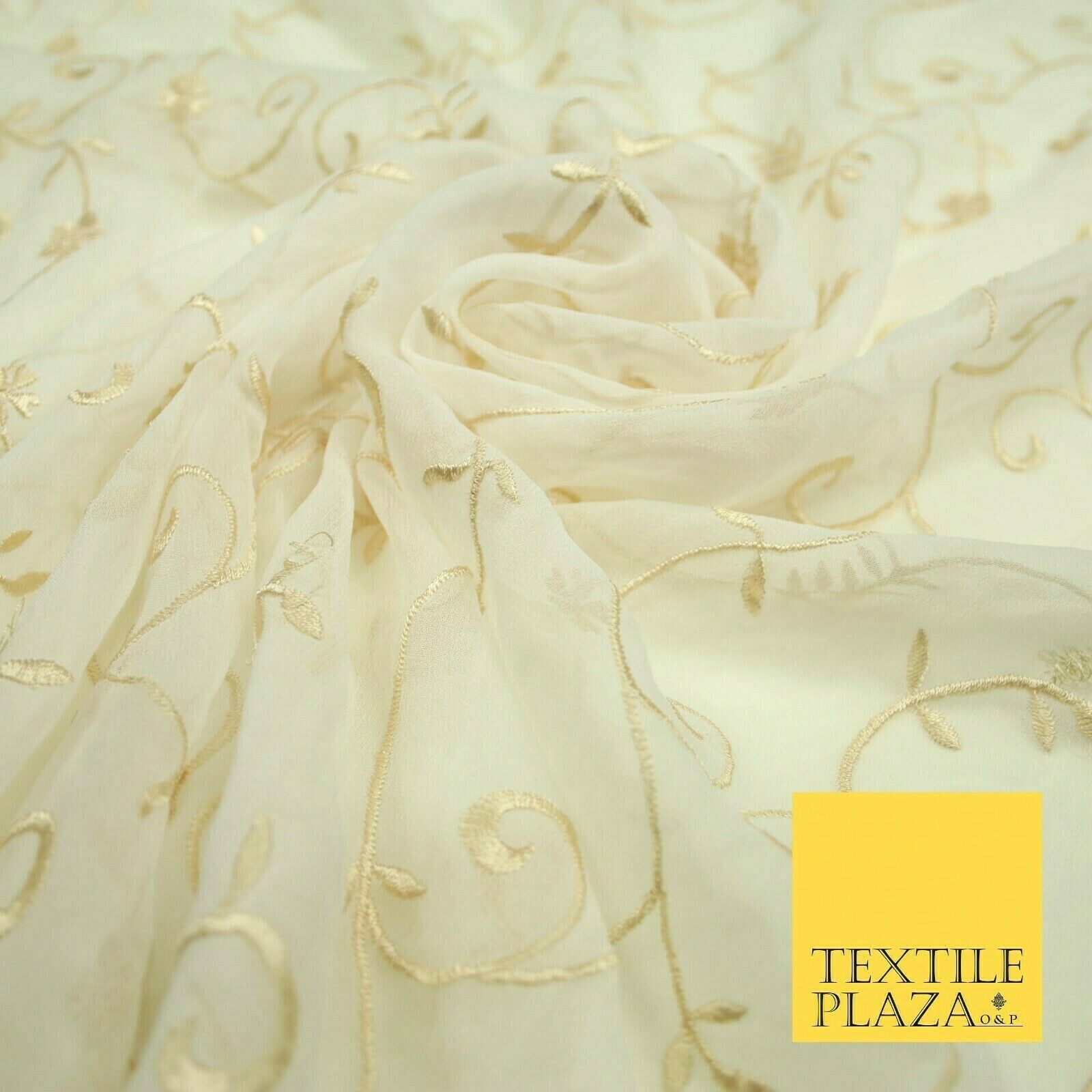Luxury Ivory Light Gold Floral Stem Embroidered 100% SILK CHIFFON Fabric 45"4635