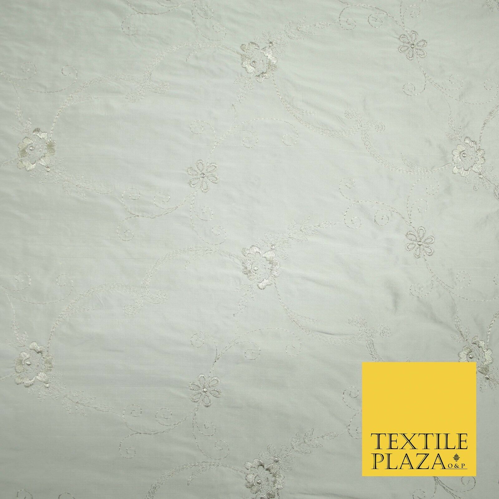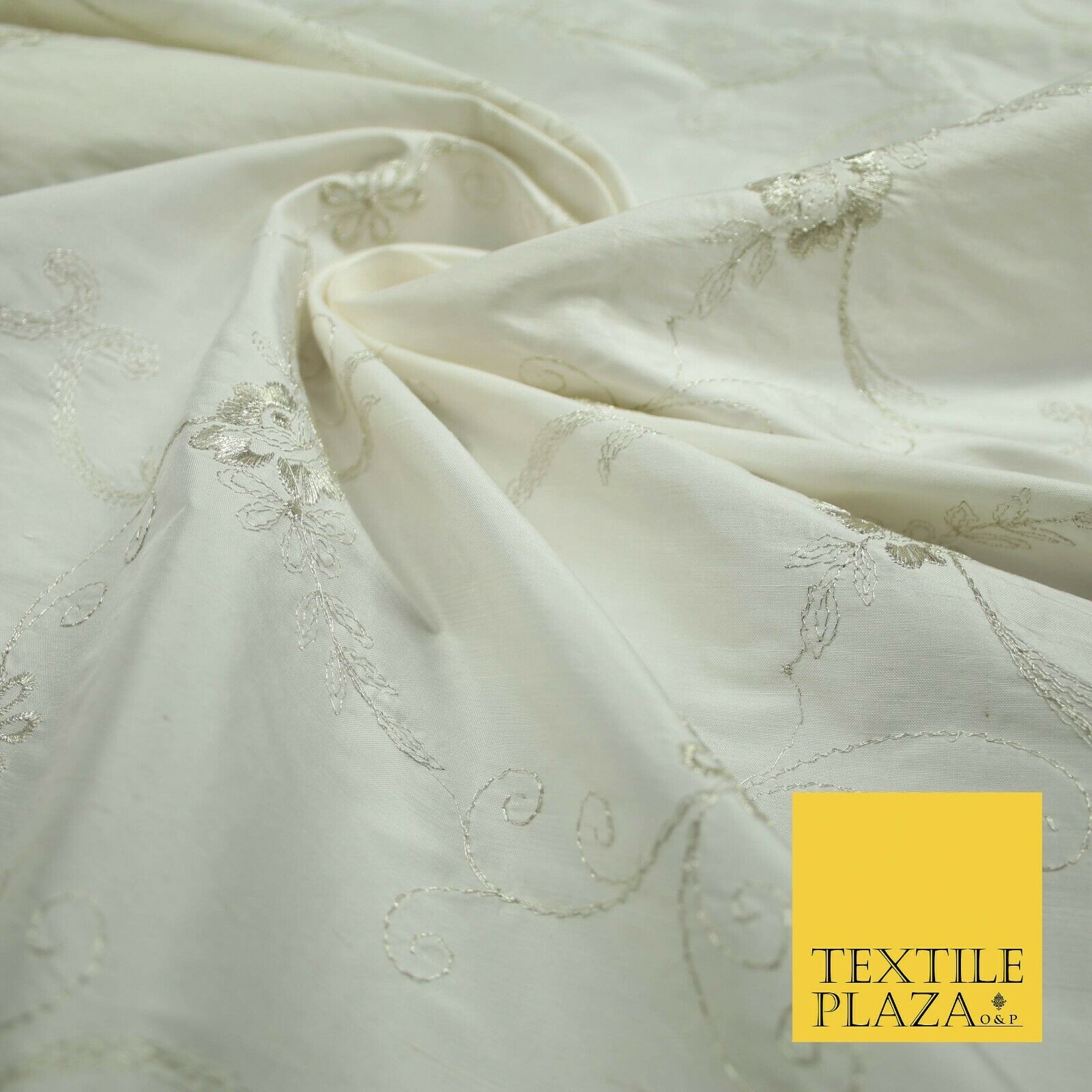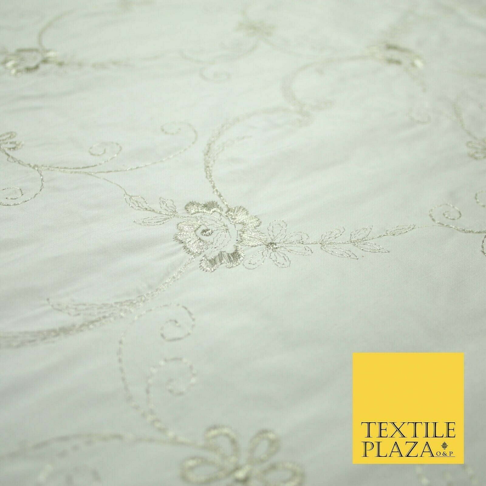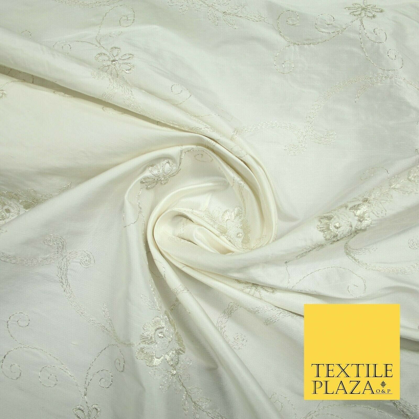 Luxury Ivory Silver Floral Embroidered 100% PURE SILK Dupion Fabric 45" 4637