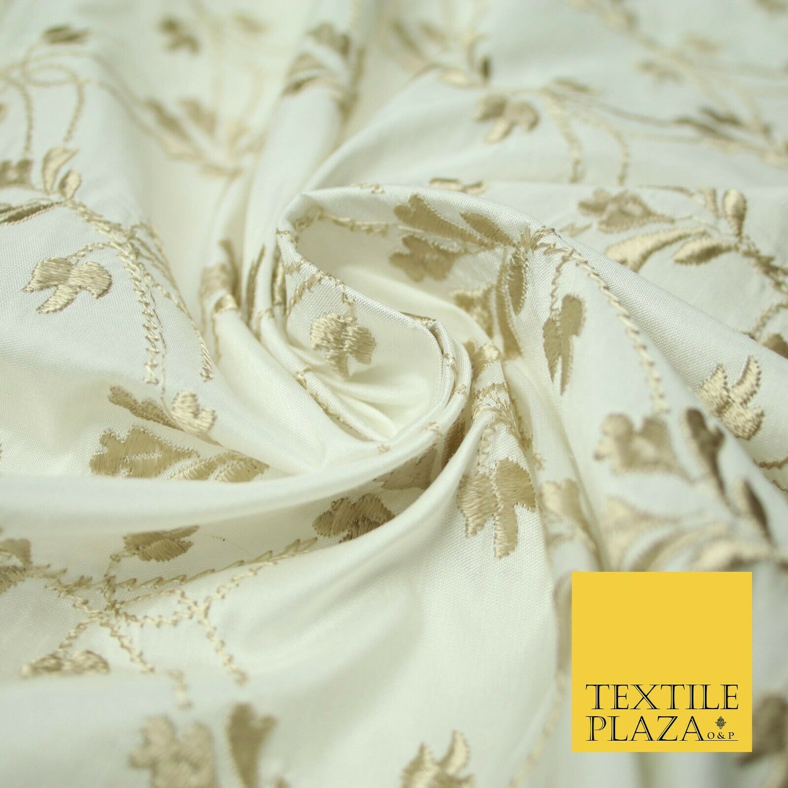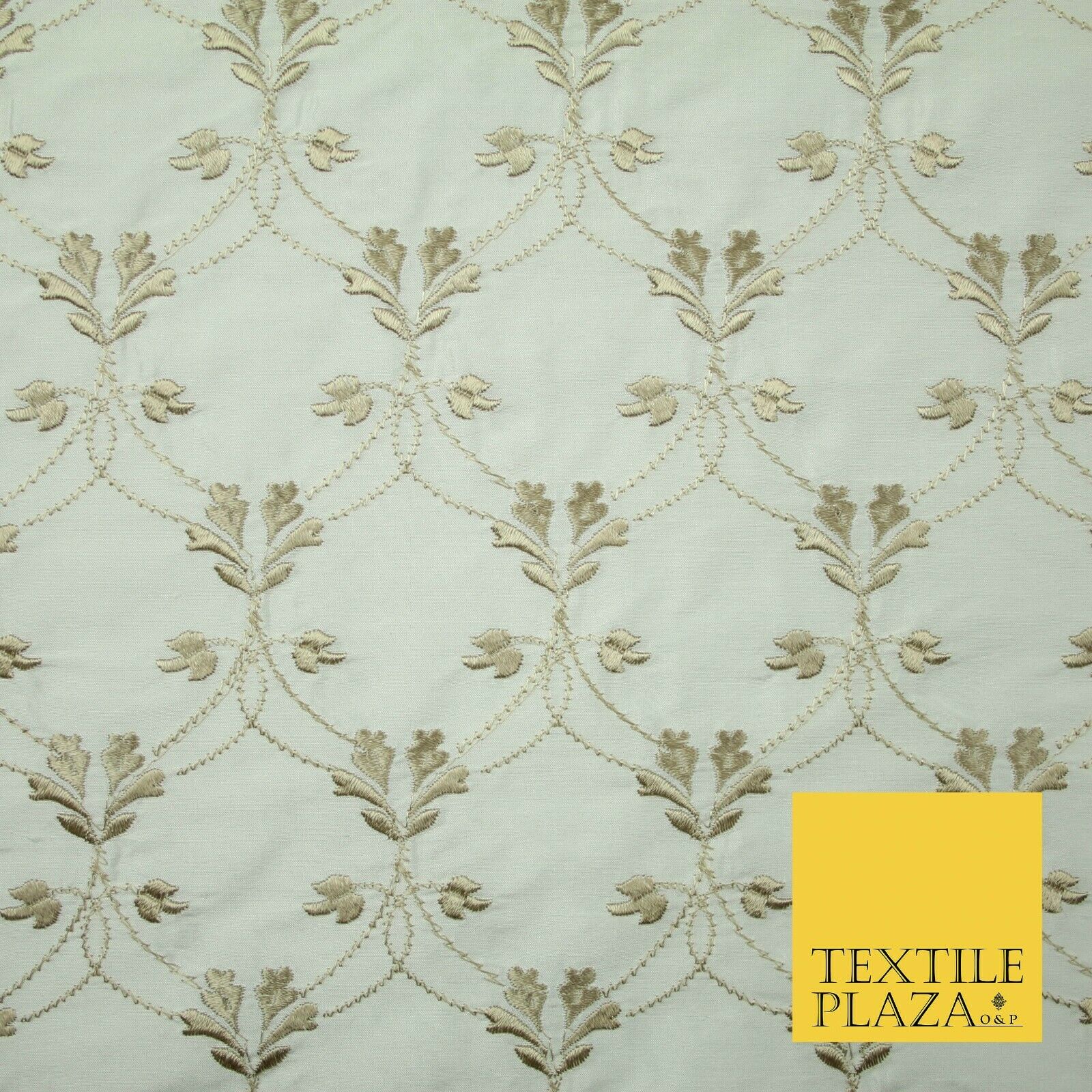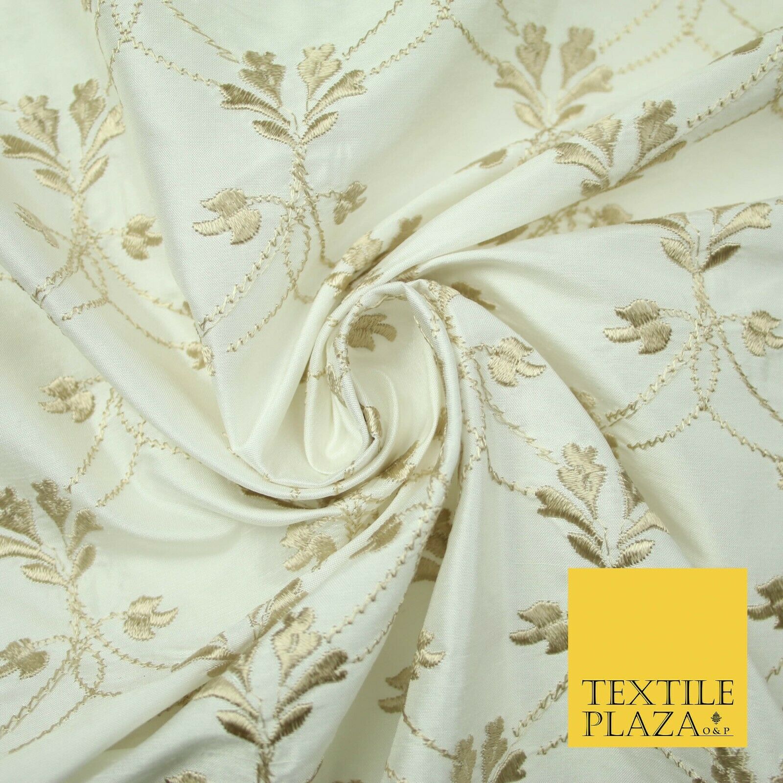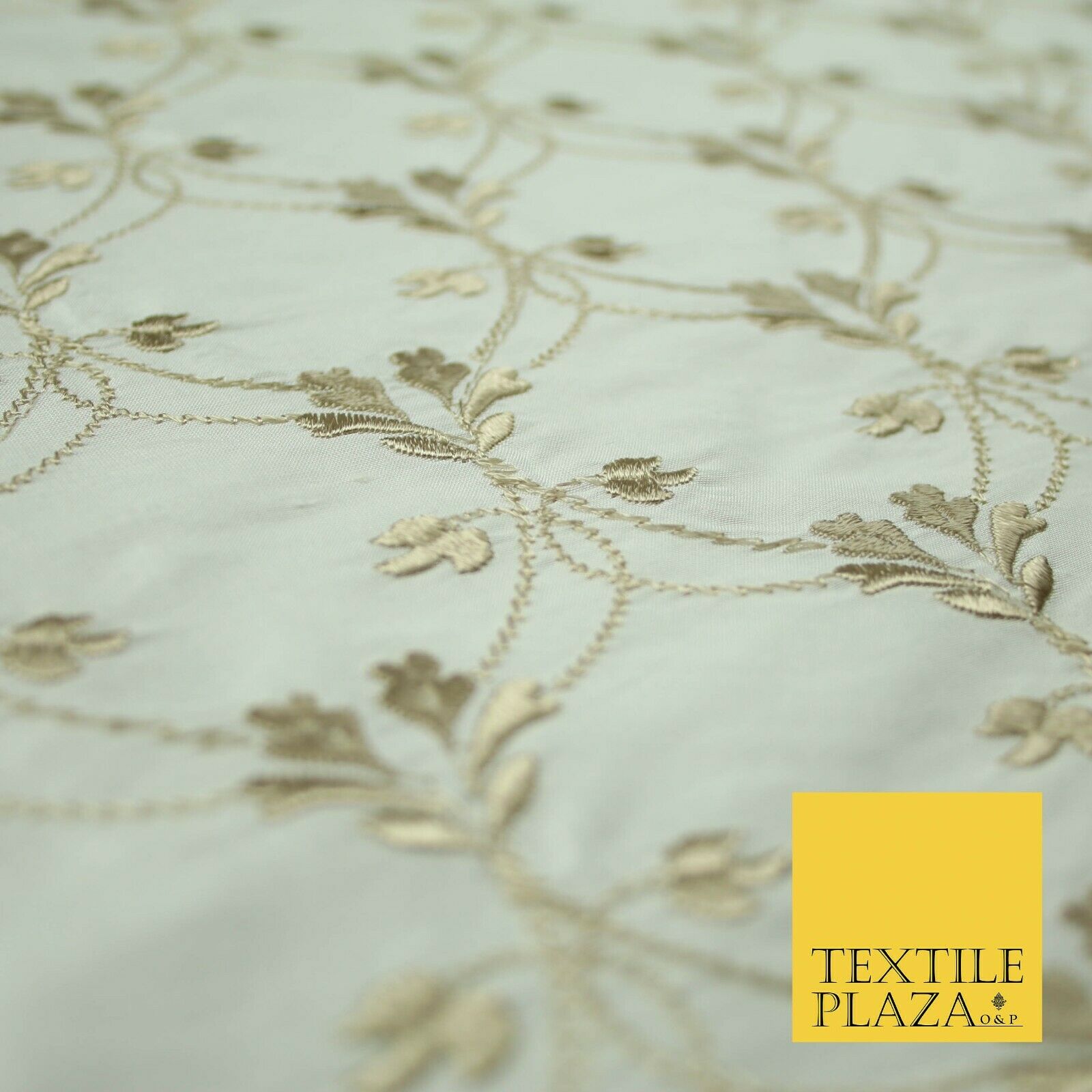 Luxury OYSTER GOLD Floral Lattice Embroidered 100% PURE SILK Fabric 45" 4527