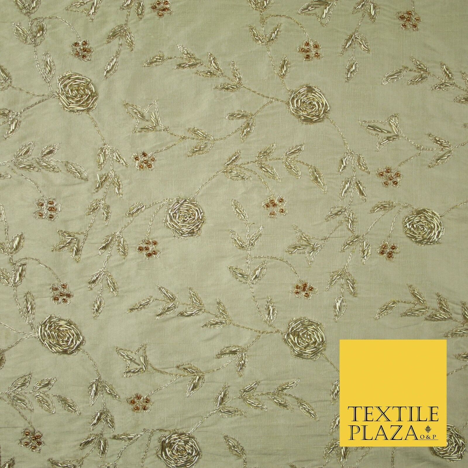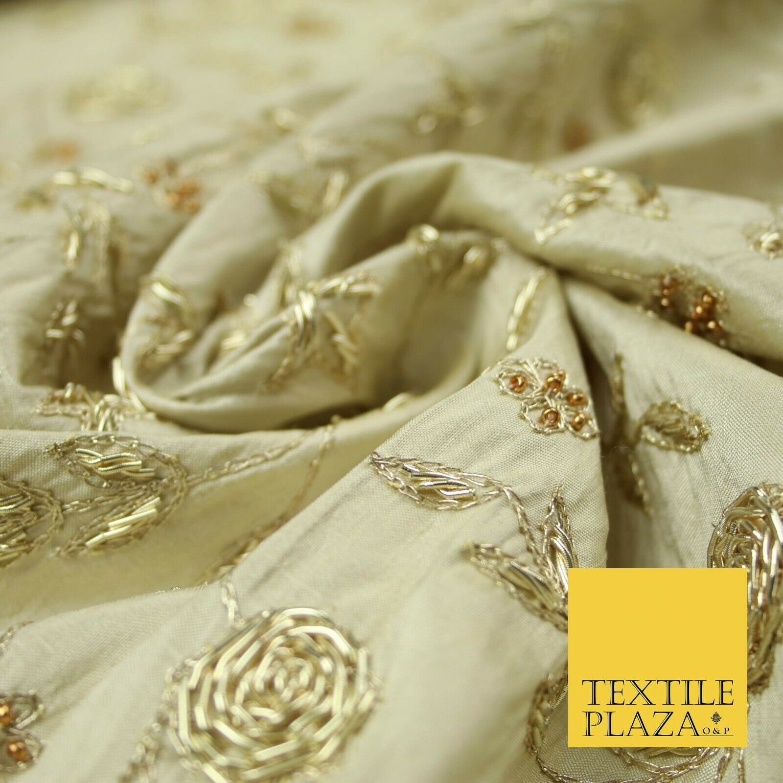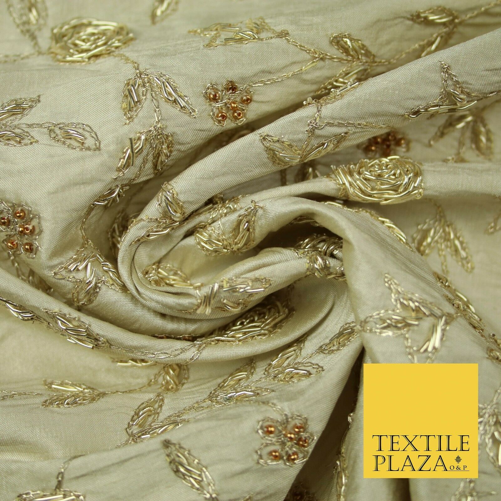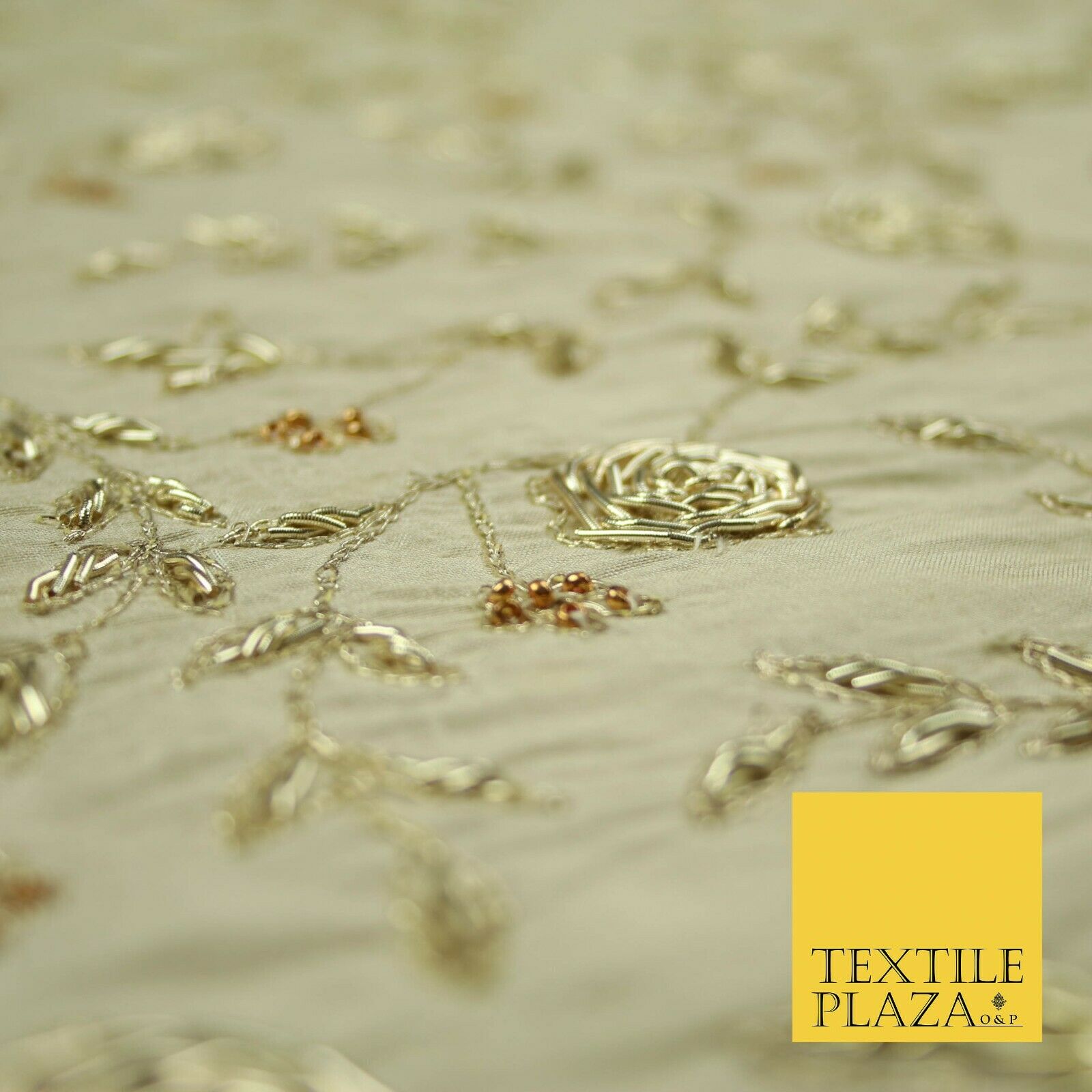 Luxury OYSTER GOLD Zari Metallic HAND Embroidered 100% PURE SILK Fabric 48" 4504