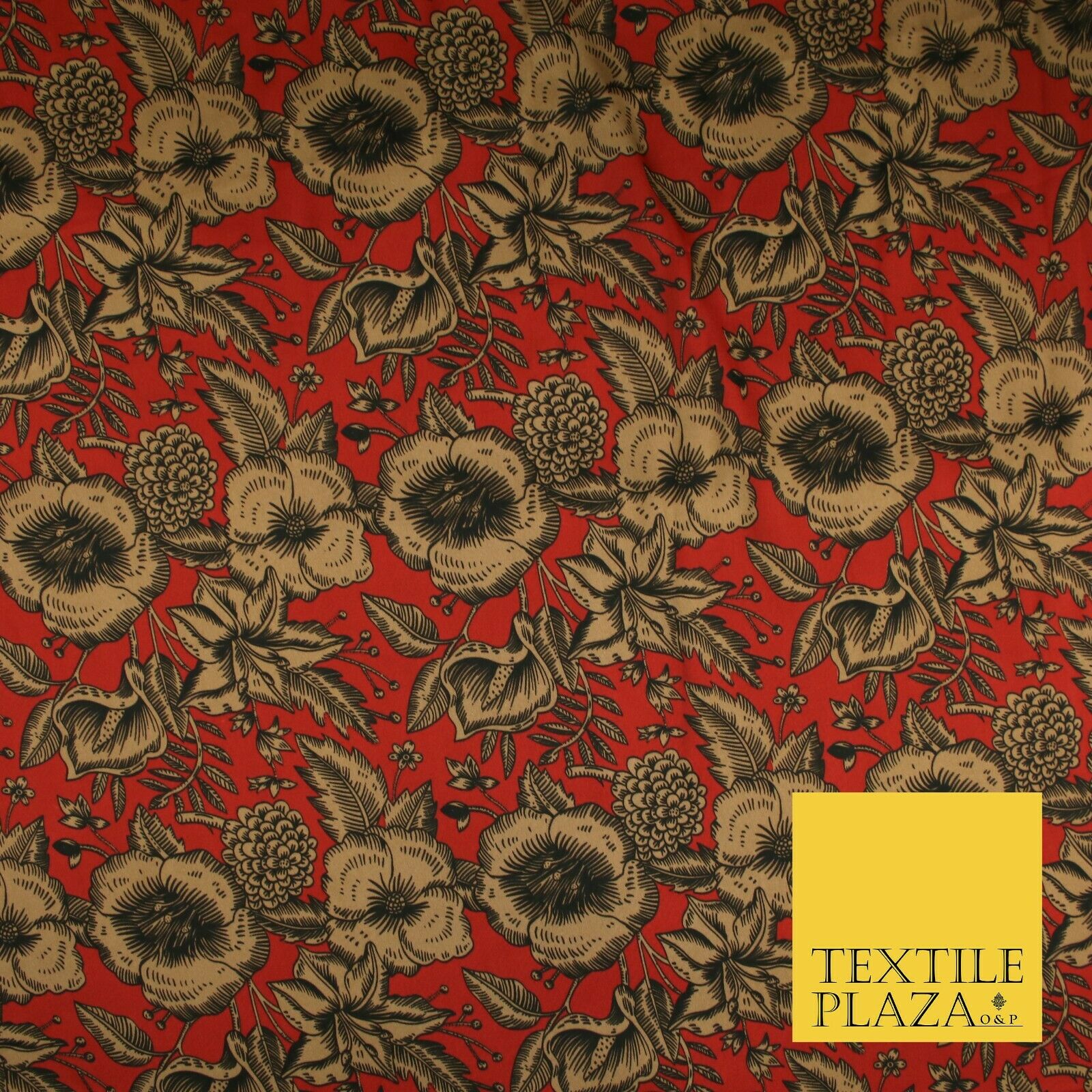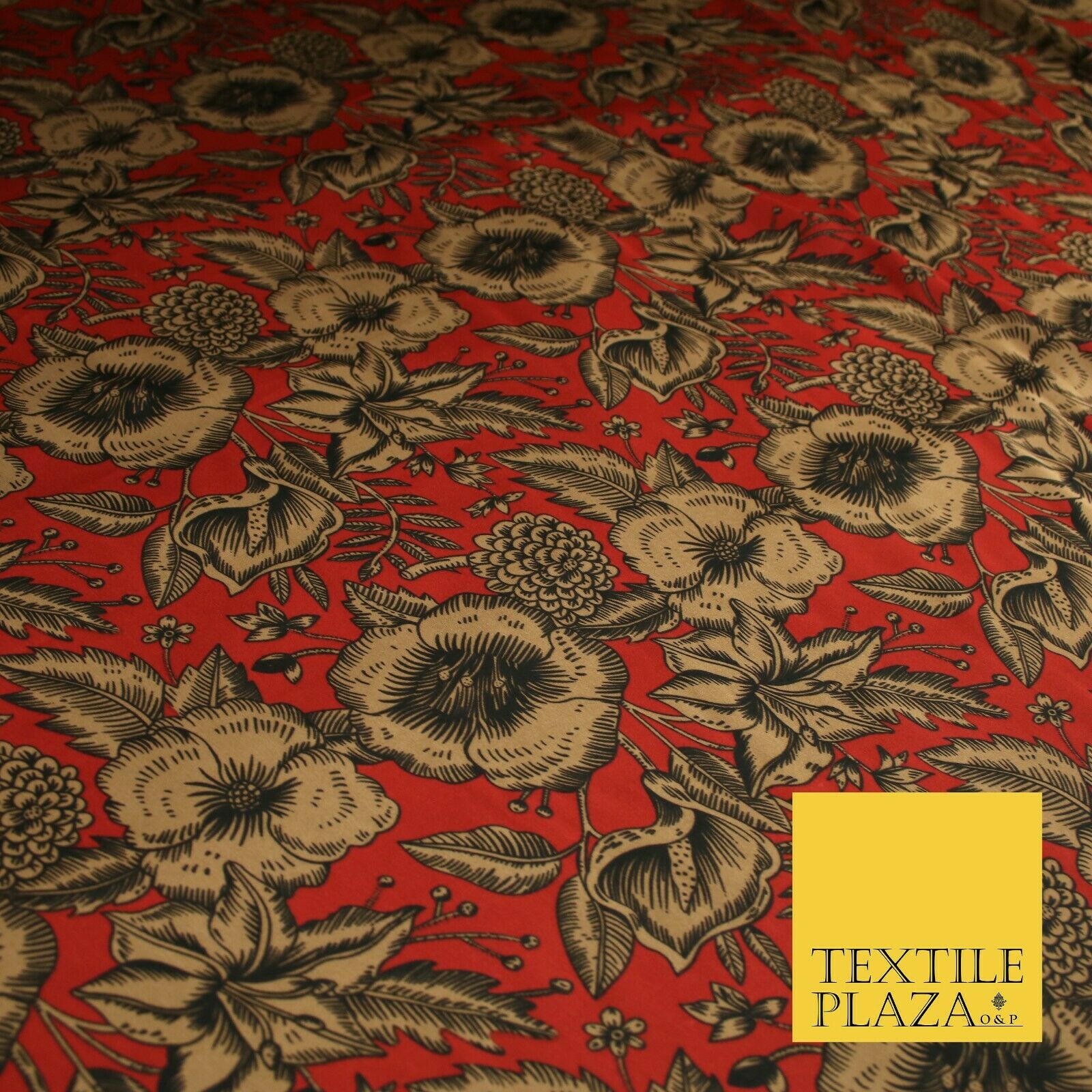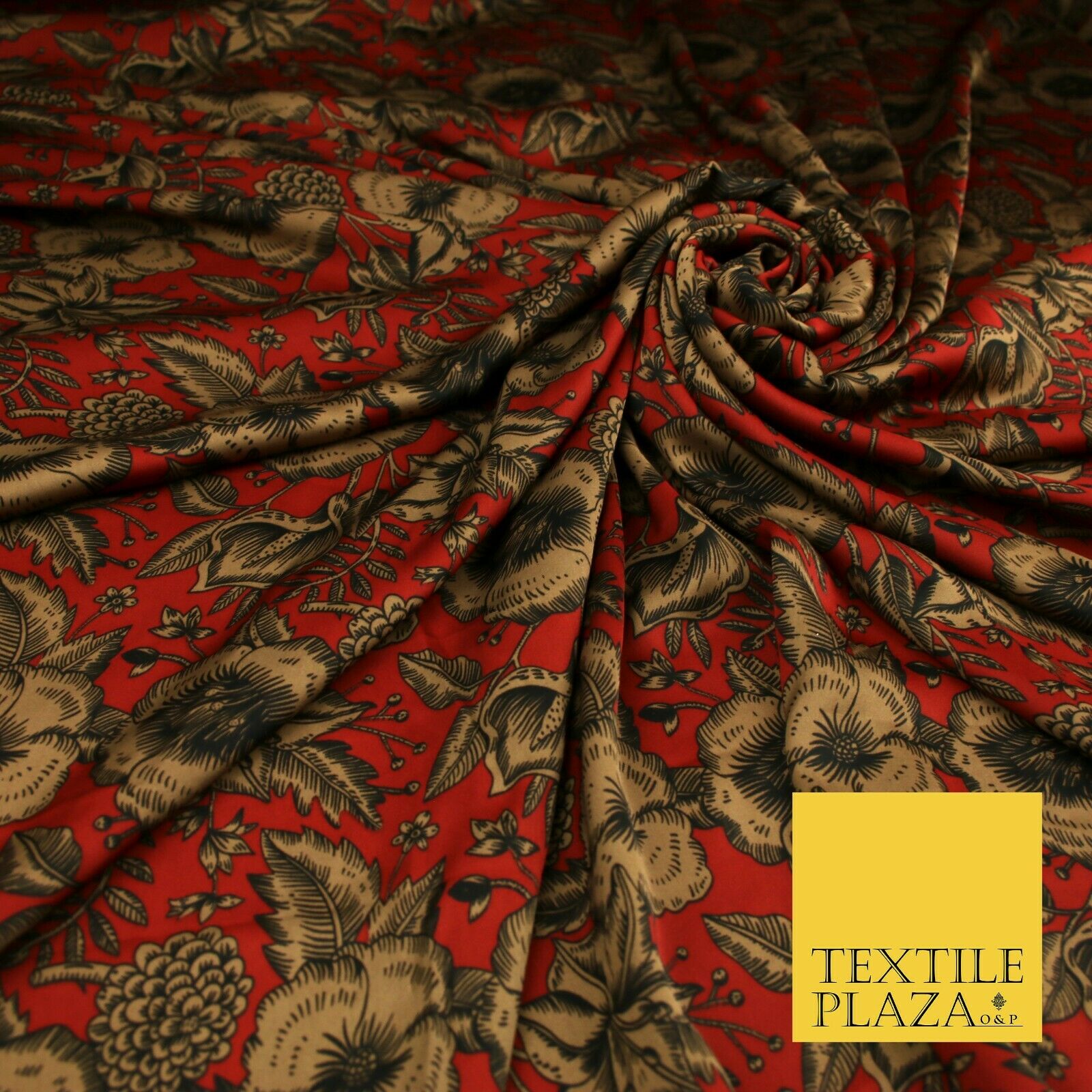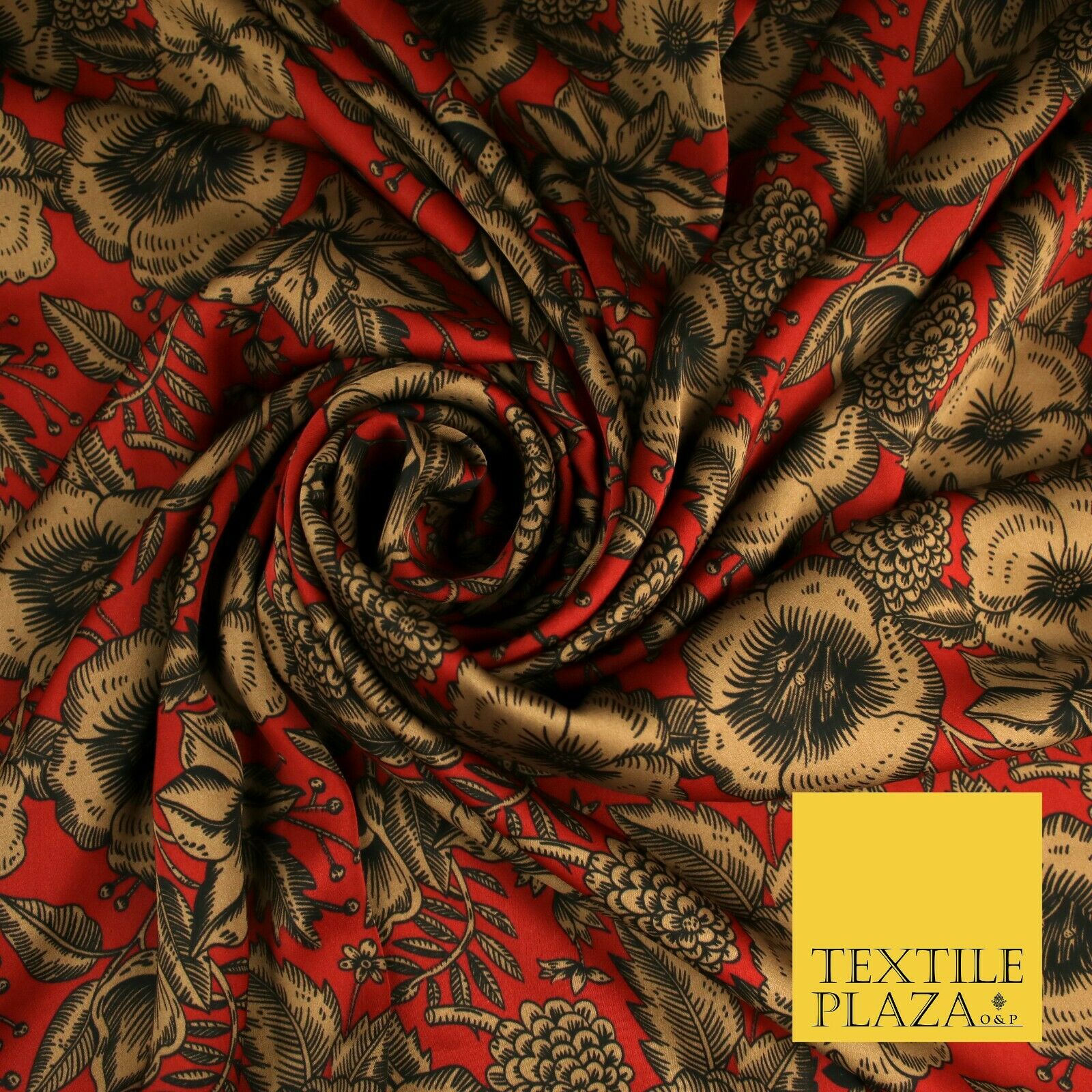 Luxury Red / Navy Antique Floral Woodland Printed Charmeuse Satin Dress Fabric