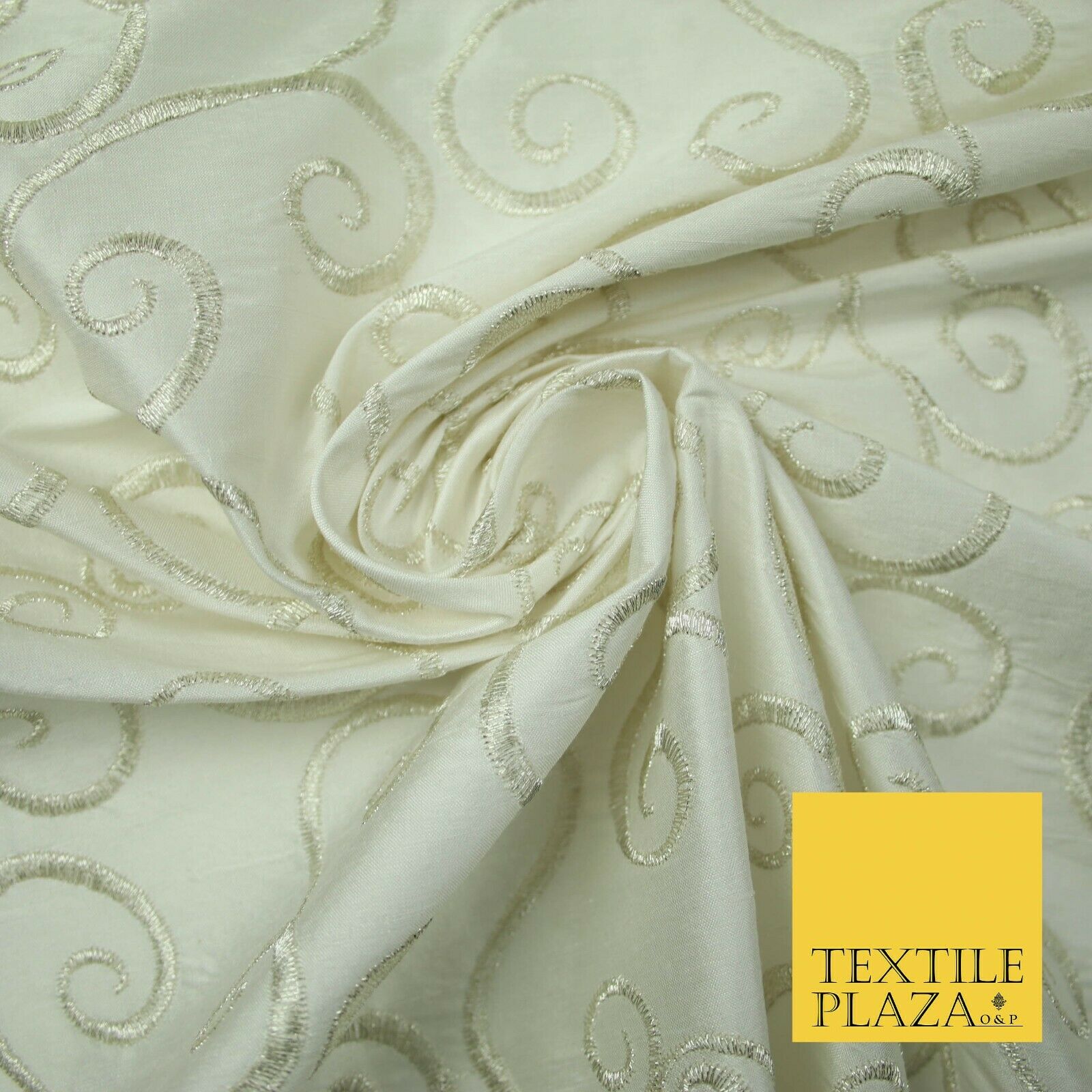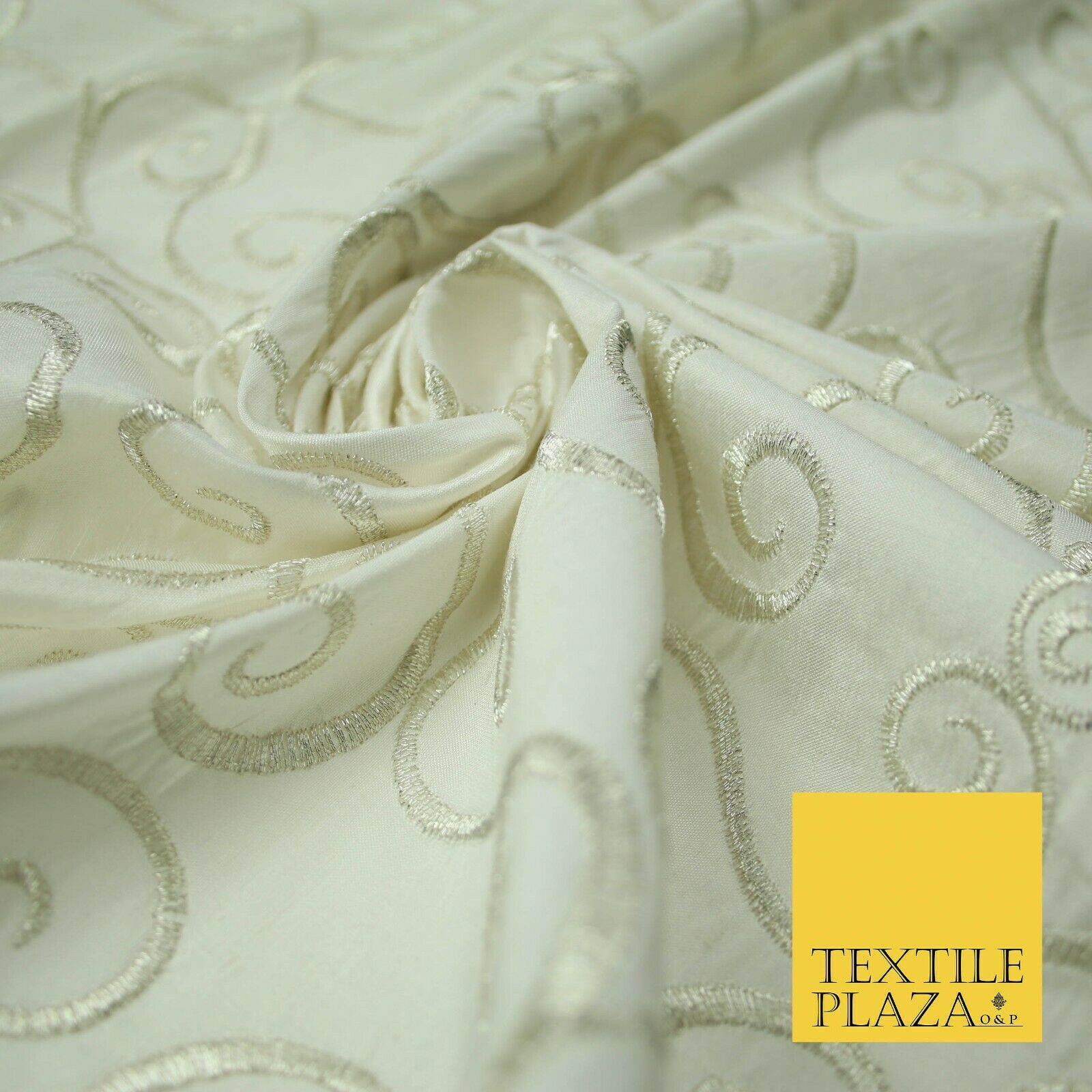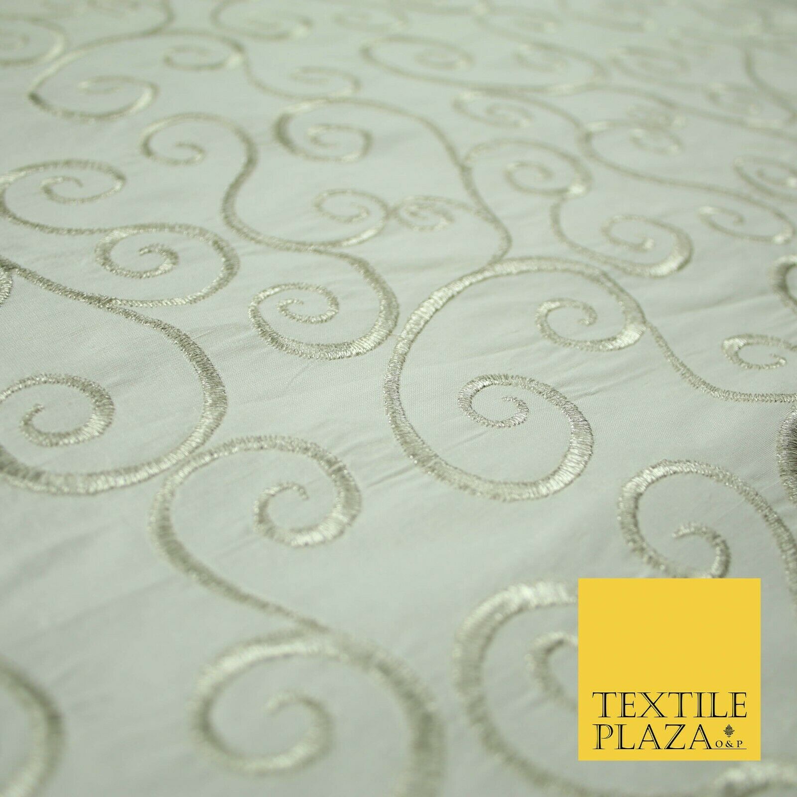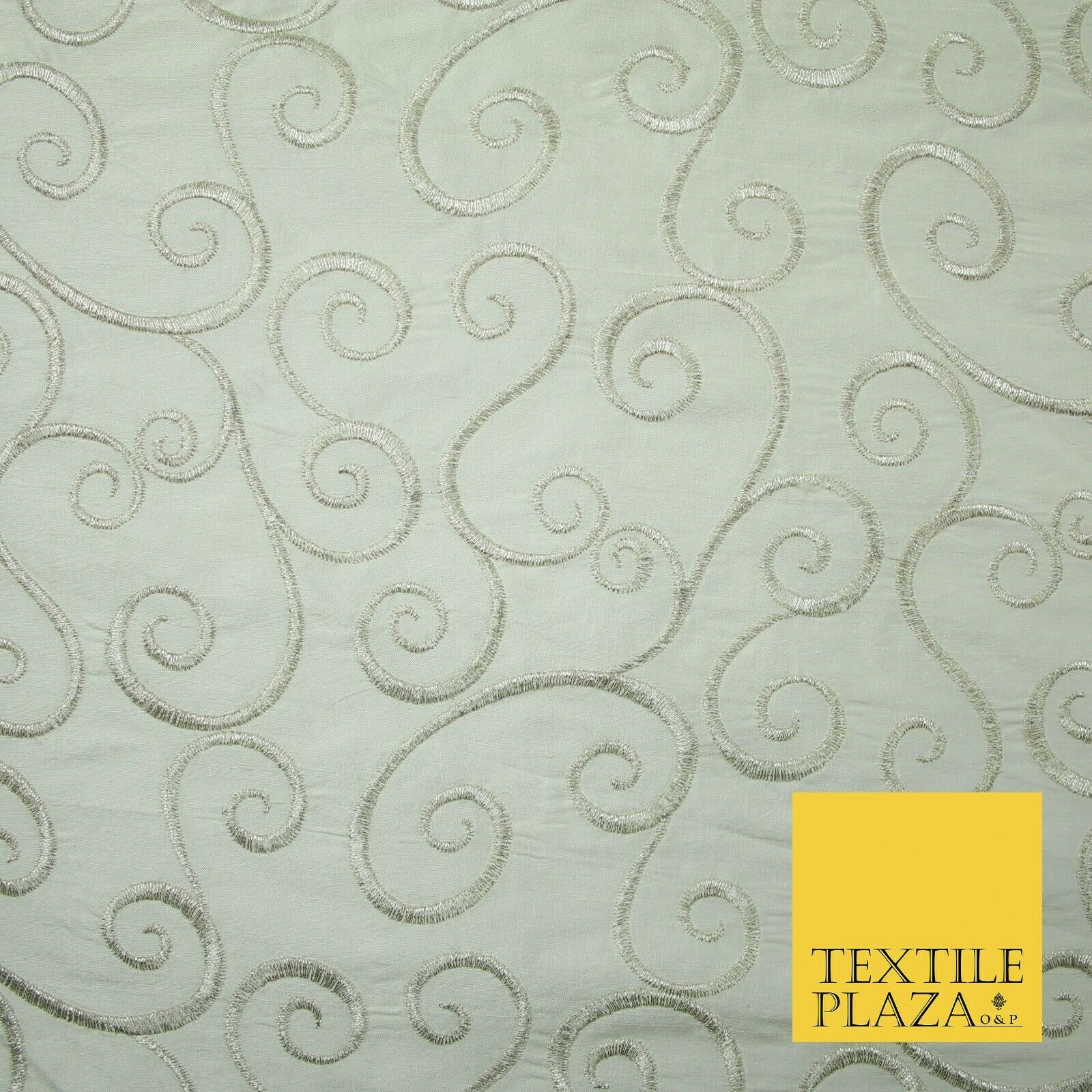 Luxury SILVER Fancy Swirl Curls Embroidered 100% PURE SILK Fabric 45" Wide 4518