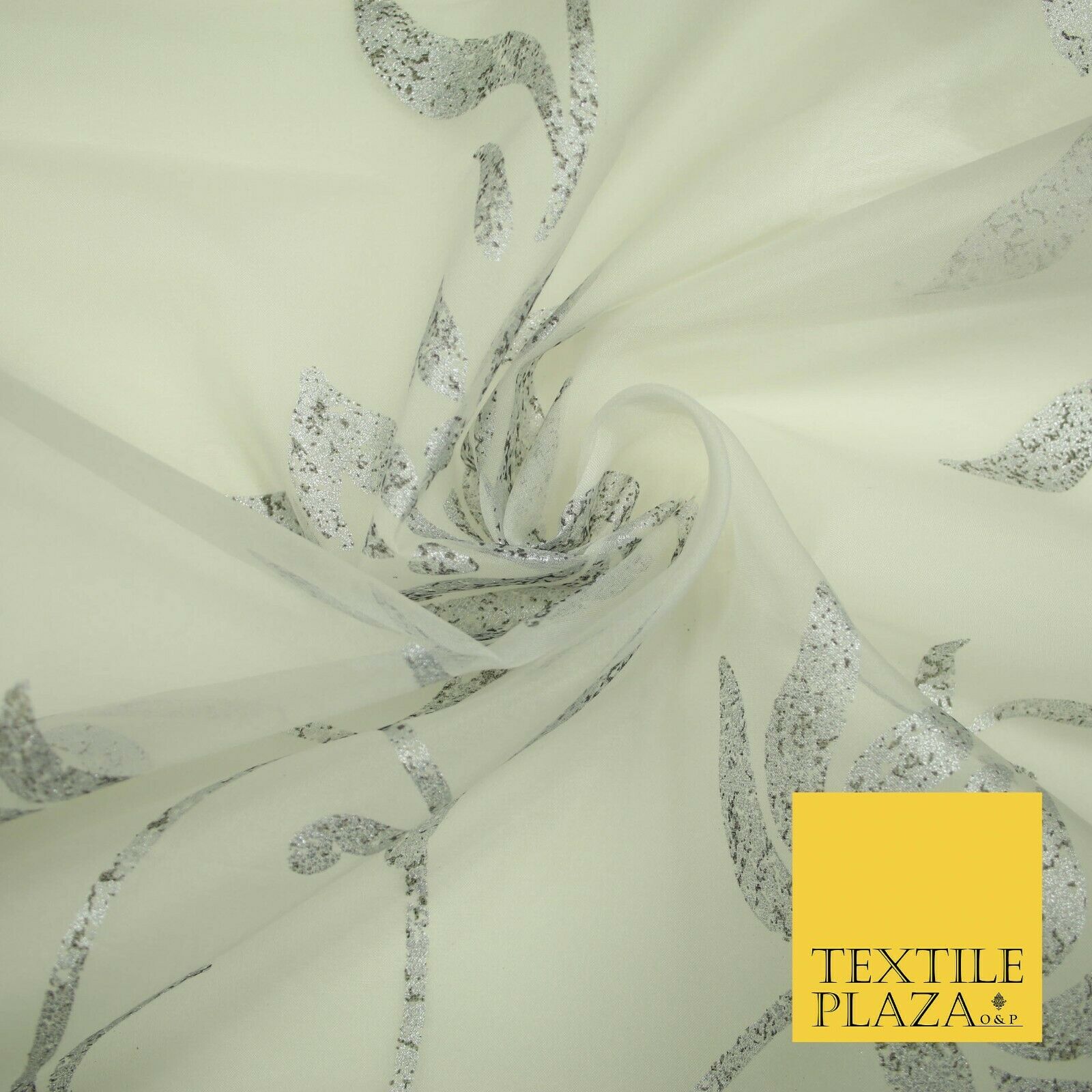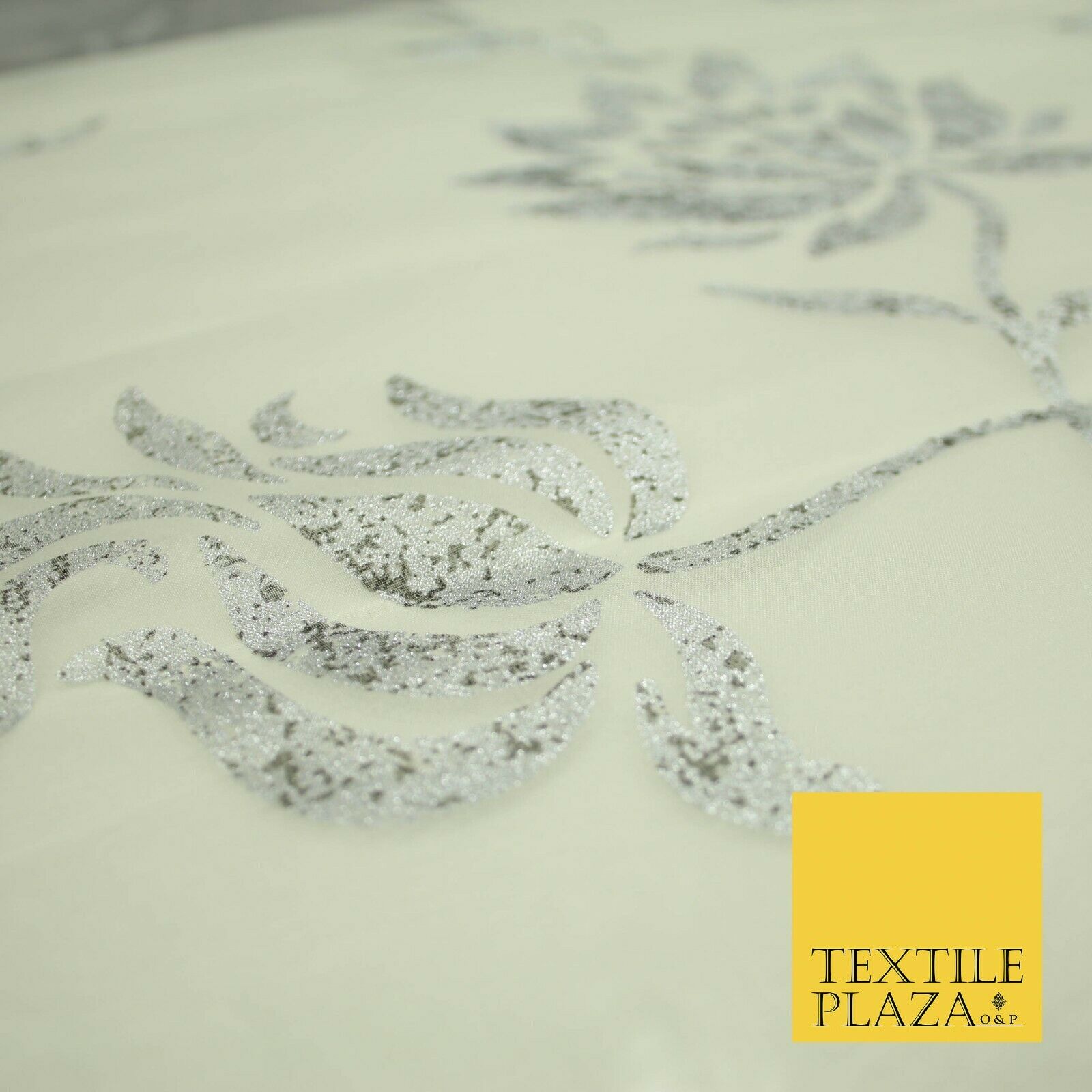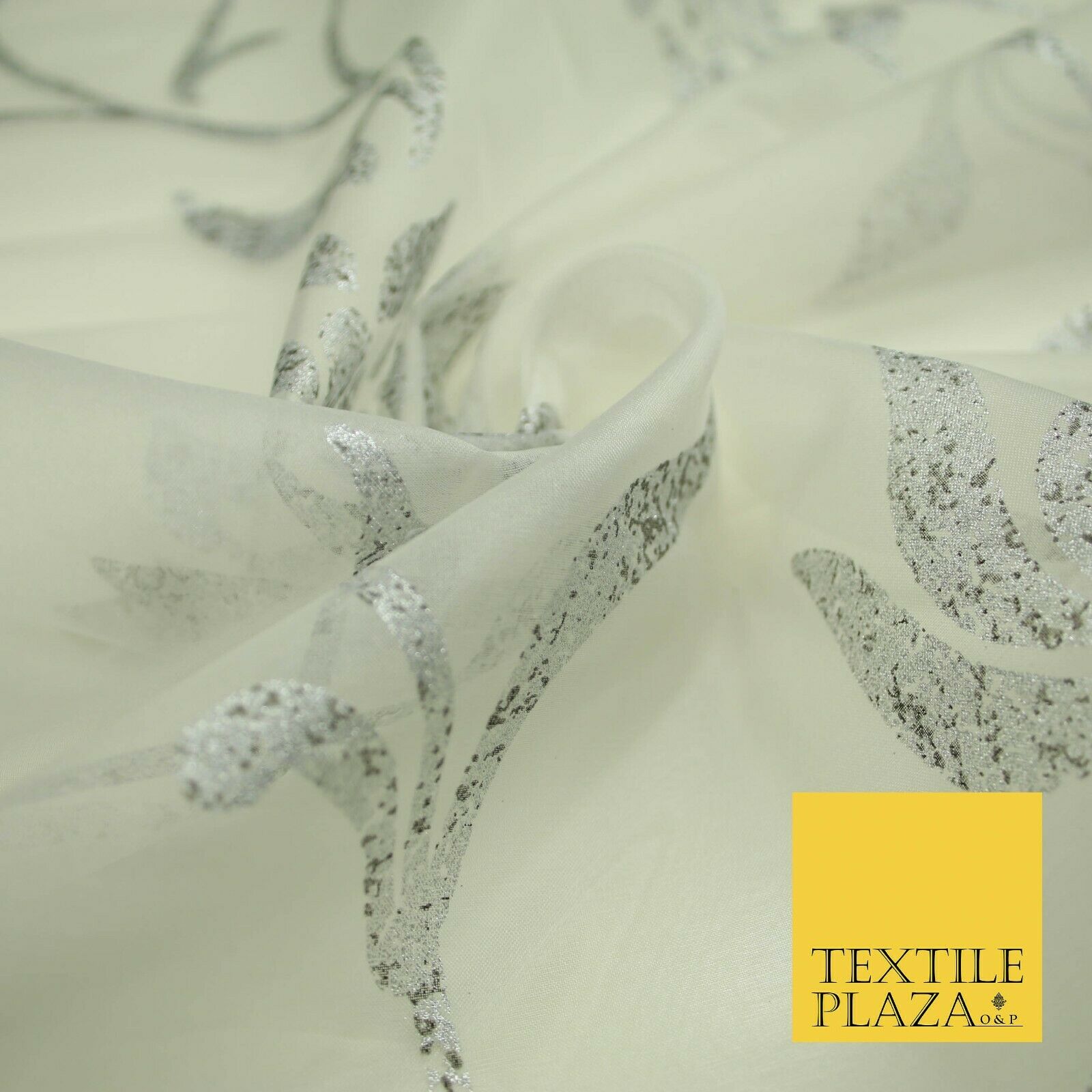 Luxury White Metallic Silver Floral Lotus 100% SILK ORGANZA Fabric Sheer 53"4623