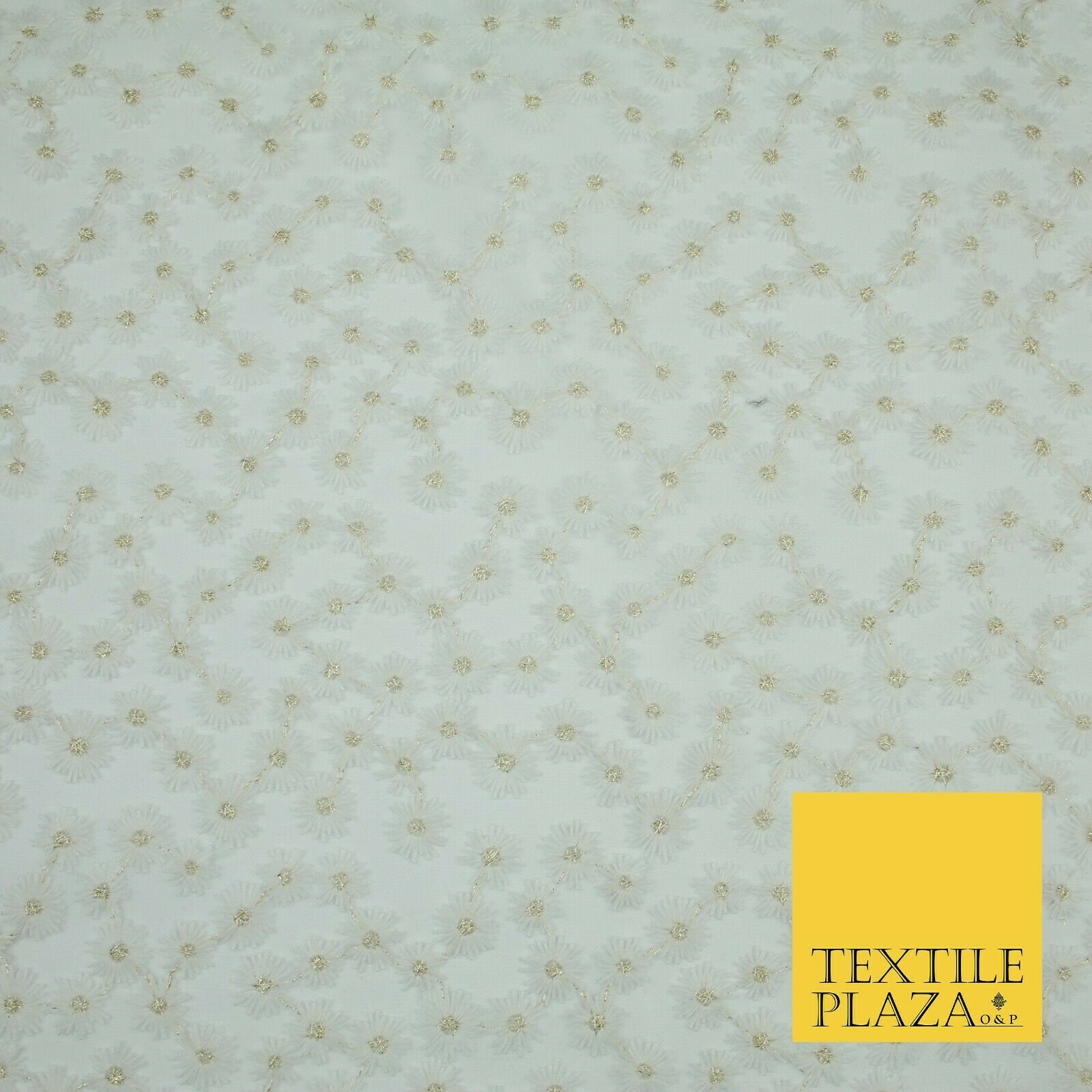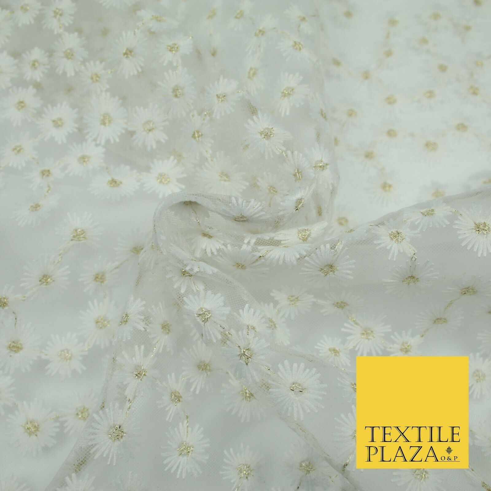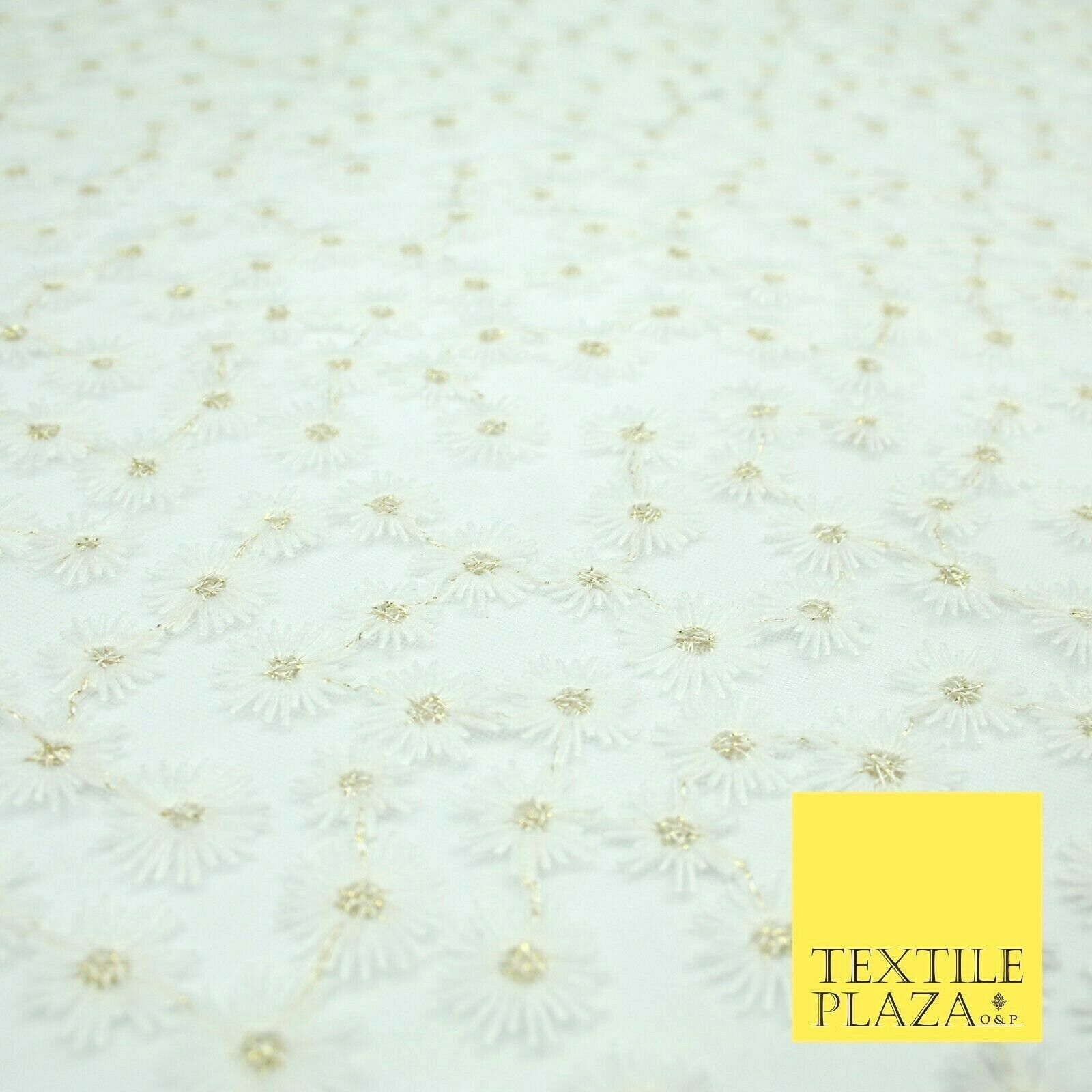 Luxury White Mini Blossom Threadwork Mesh Net Dress Fabric Gold Sparkle 1901